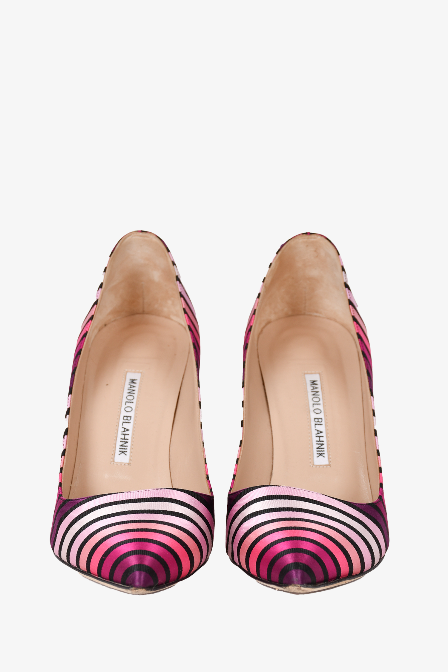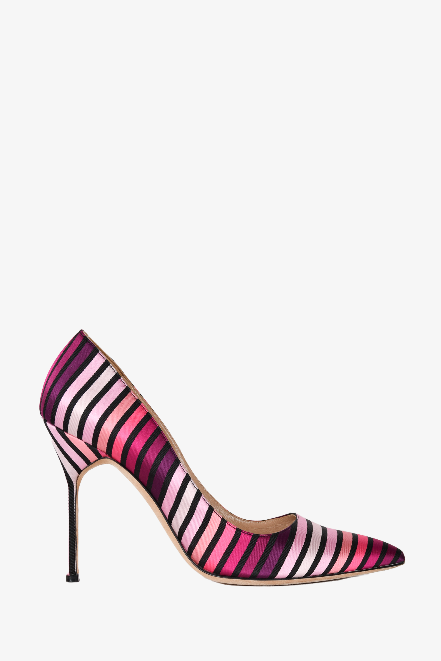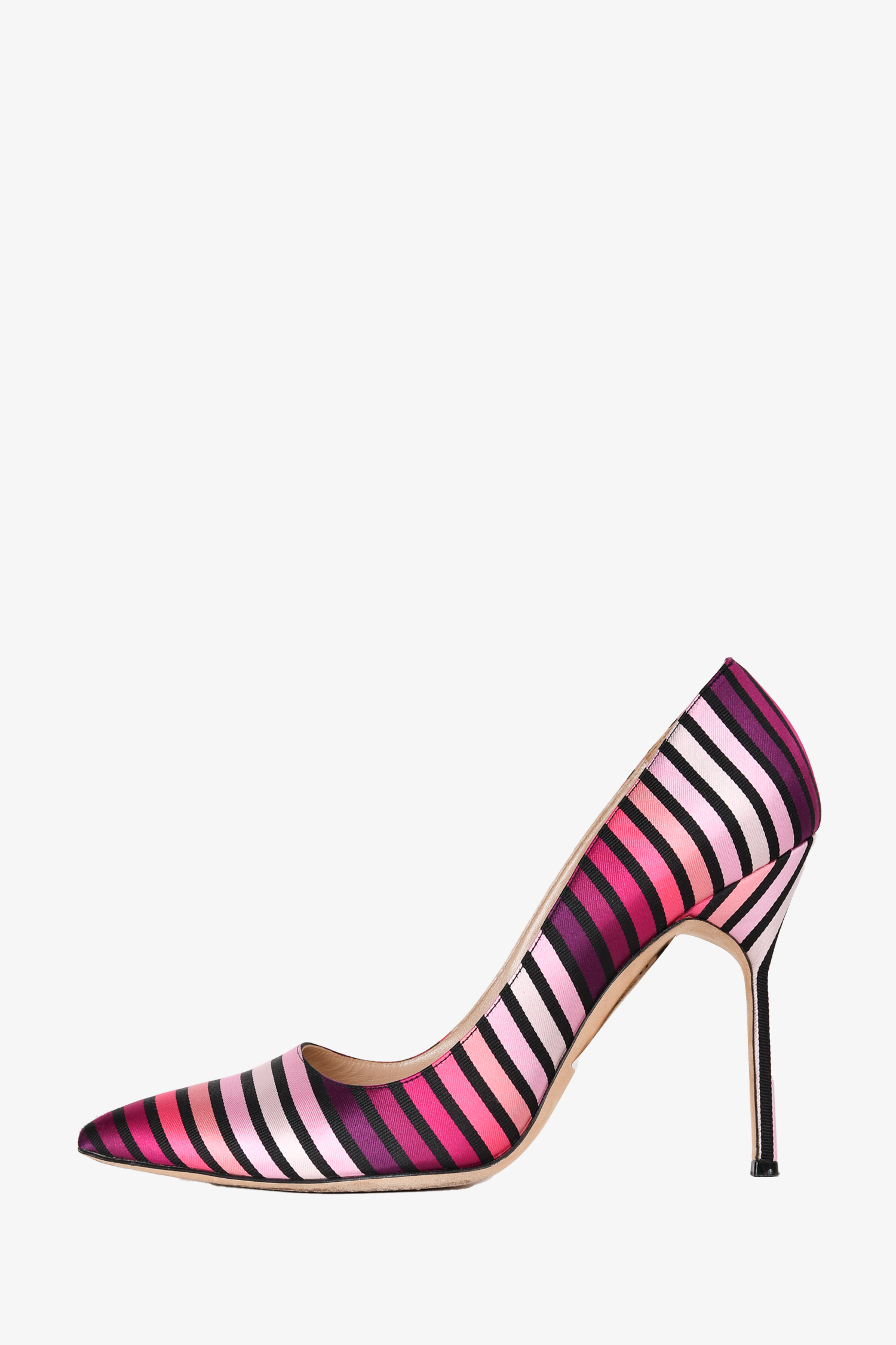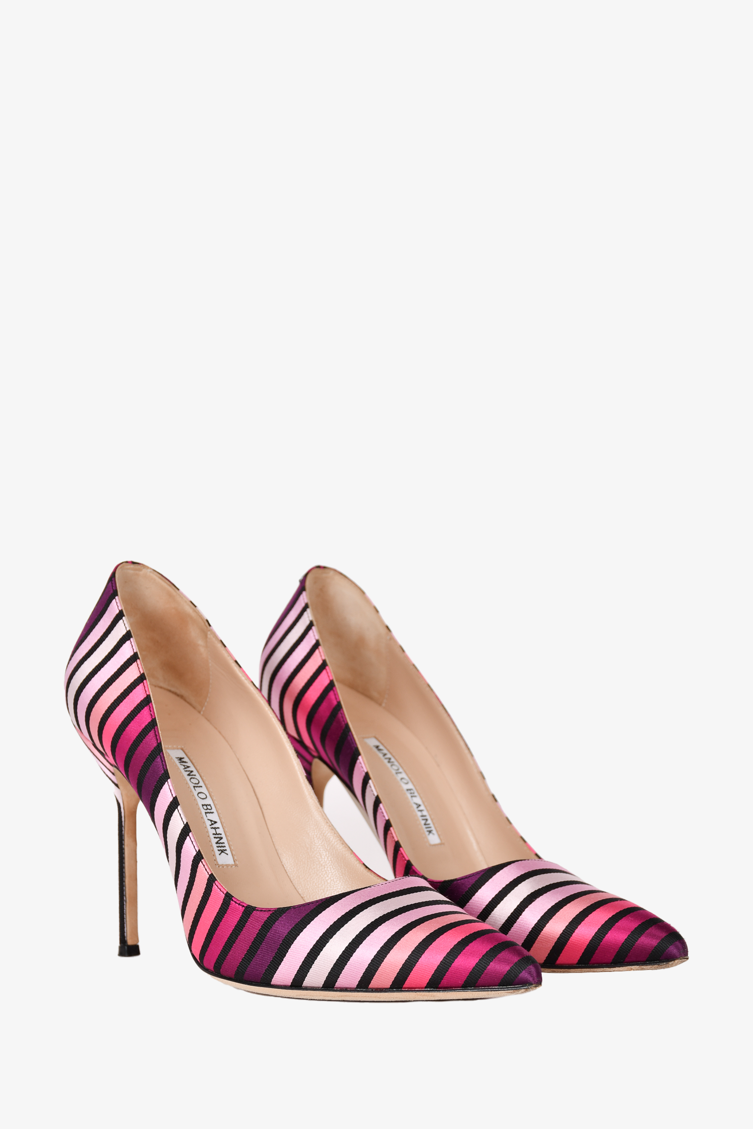 Refresh availabilityManolo Blahnik Pink/Purple Striped Satin Pointed Toe Pumps. Slip-on. Skinny heel. Tonal stitching.