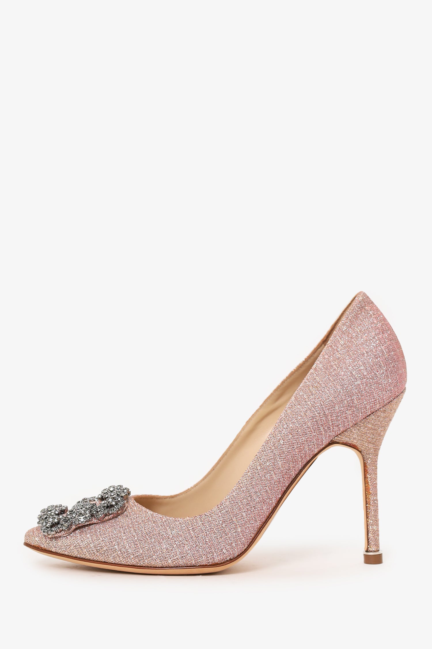 Refresh availabilityManolo Blahnik Pink/Silver Metallic Cloth Hangisi Heels. Slip-on. Pointed-toe. Silver-tone hardware. Tonal stitching.