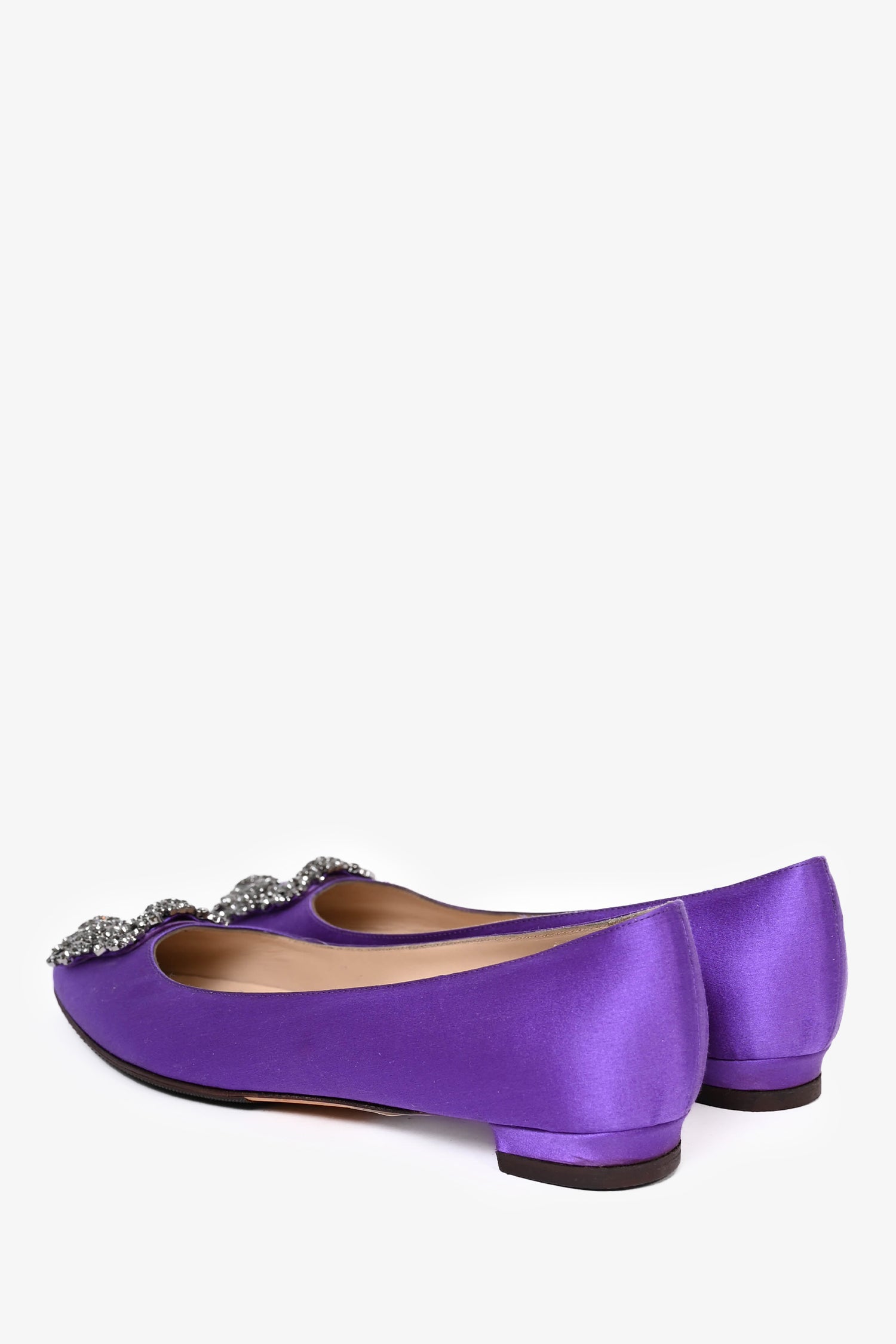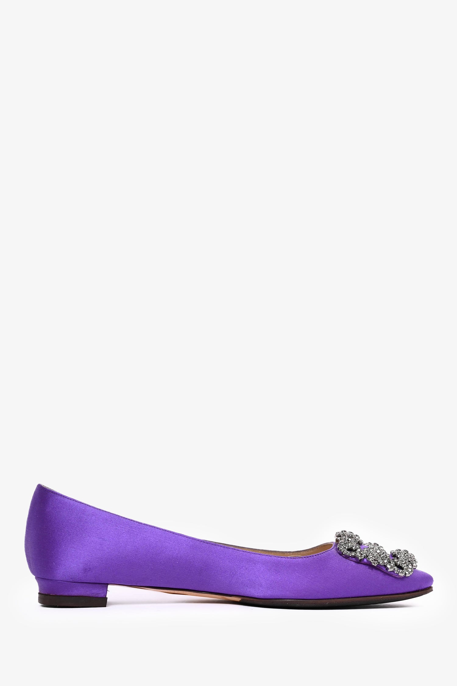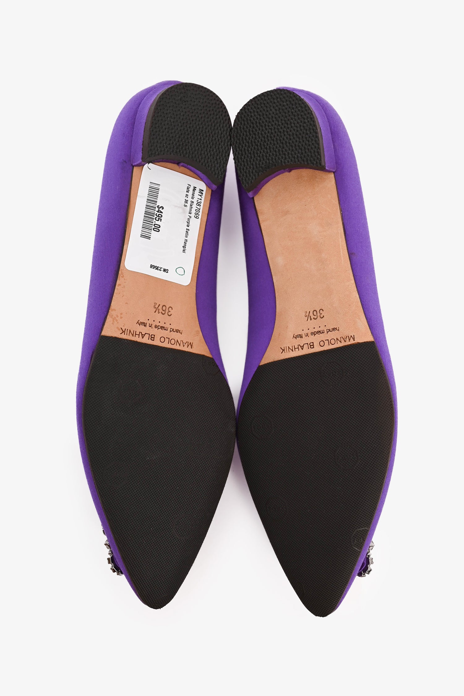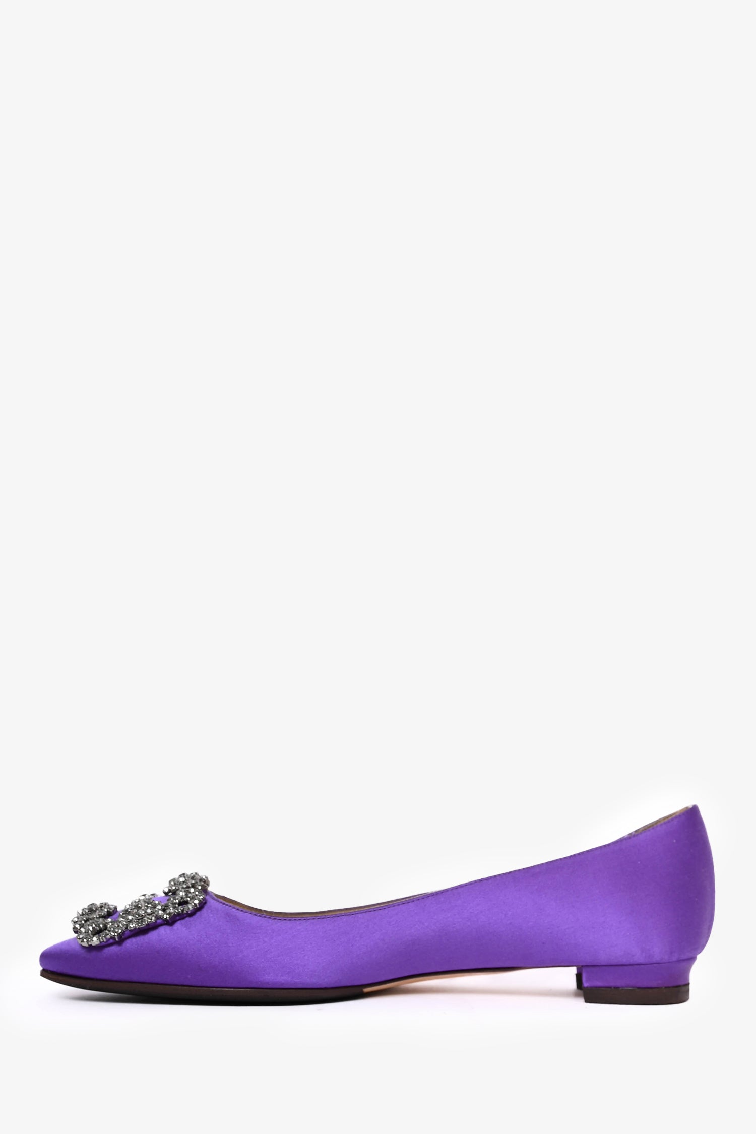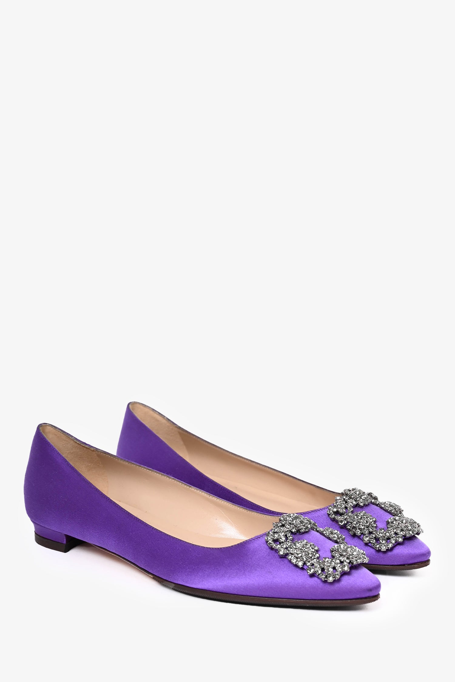 Refresh availabilityManolo Blahnik Purple Satin Hangisi Flats. Slip-on. Pointed toe. Embellished buckle at upper. Topy soles.
