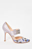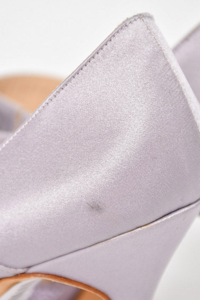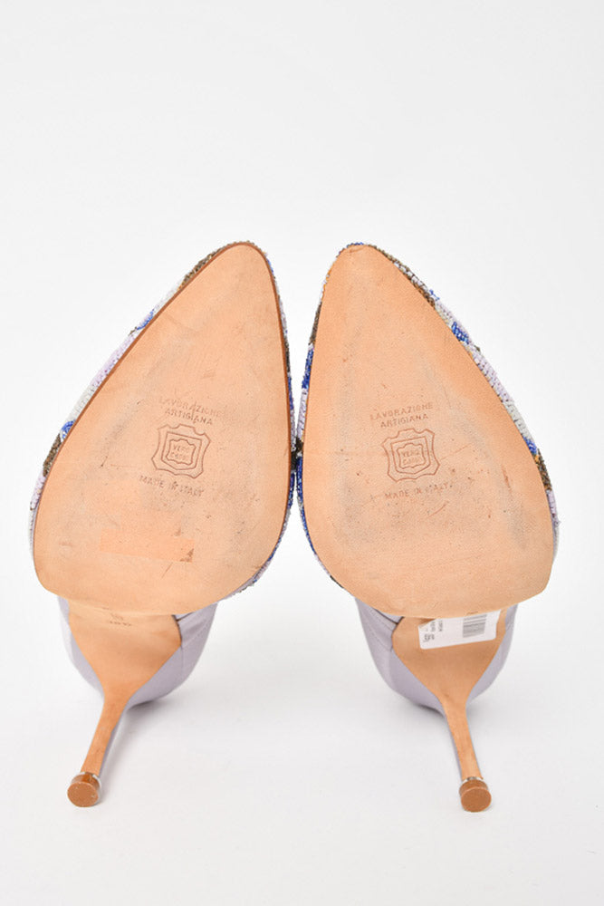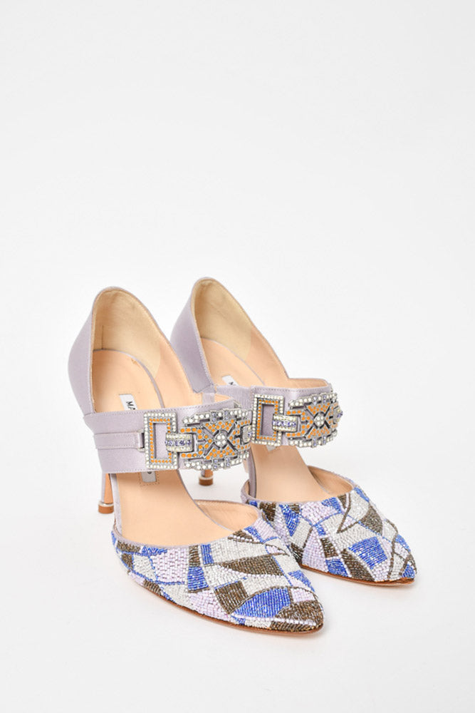 Refresh availabilityManolo Blahnik Purple Silk Beading High Heel Sandals. Pointed toe. Slip-on. Skinny heel. Tonal stitching.
