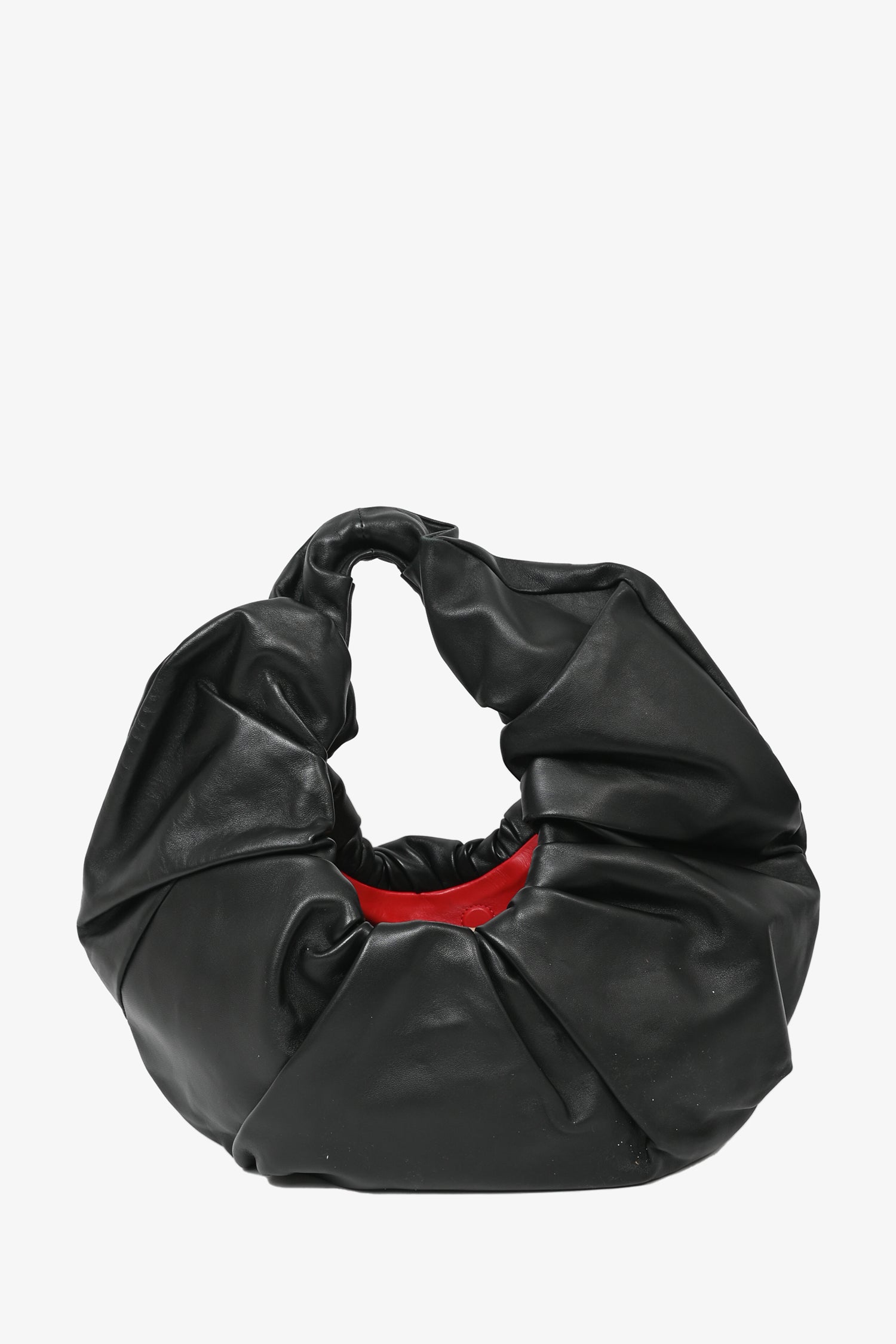 Mansur Gavriel Black Leather  Scrunchie Hobo Bag. Top magnetic closure. red interior lining. 1 interior slip pocket. Tonal stitching.
