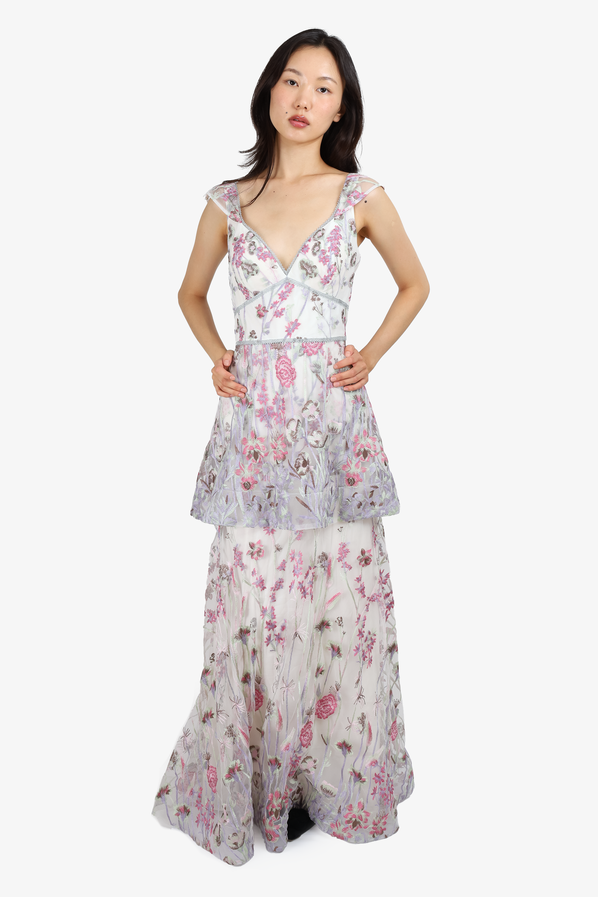 Refresh availabilityMarchesa Notte White Floral Print Gown. Sweetheart neckline. Rear zip closure. Double tiered skirt. Lined. Tonal stitching.