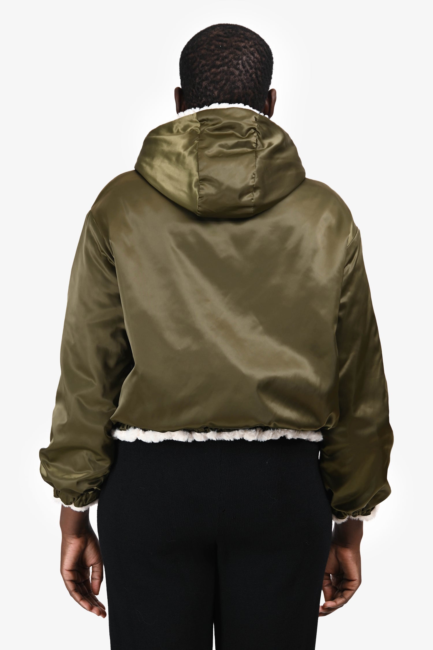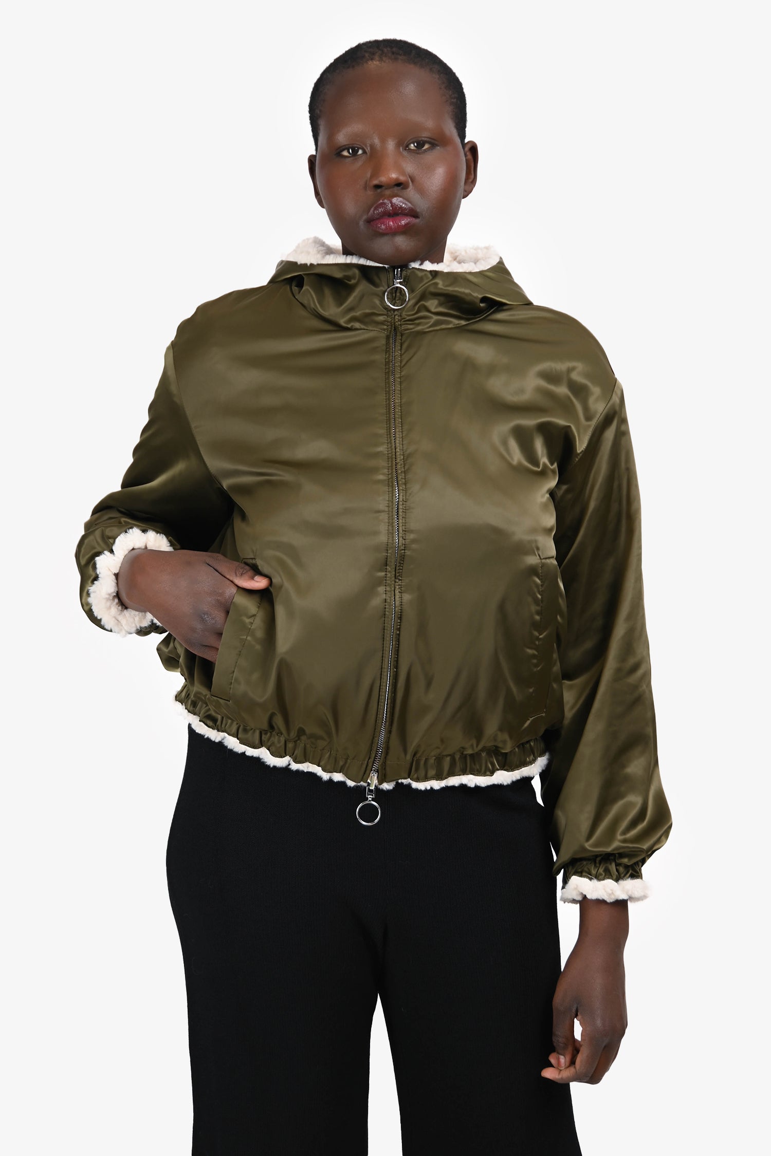 Refresh availabilityMarella Sport Olive/Cream Reversible Bomber Jacket. Slip-on. Hooded neckline. Front 2-way zip closure. Elasticized cuffs. 2 exterior slip pockets with snap closures on each side. Elasticized hem. Silver-tone hardware. Tonal stitching.