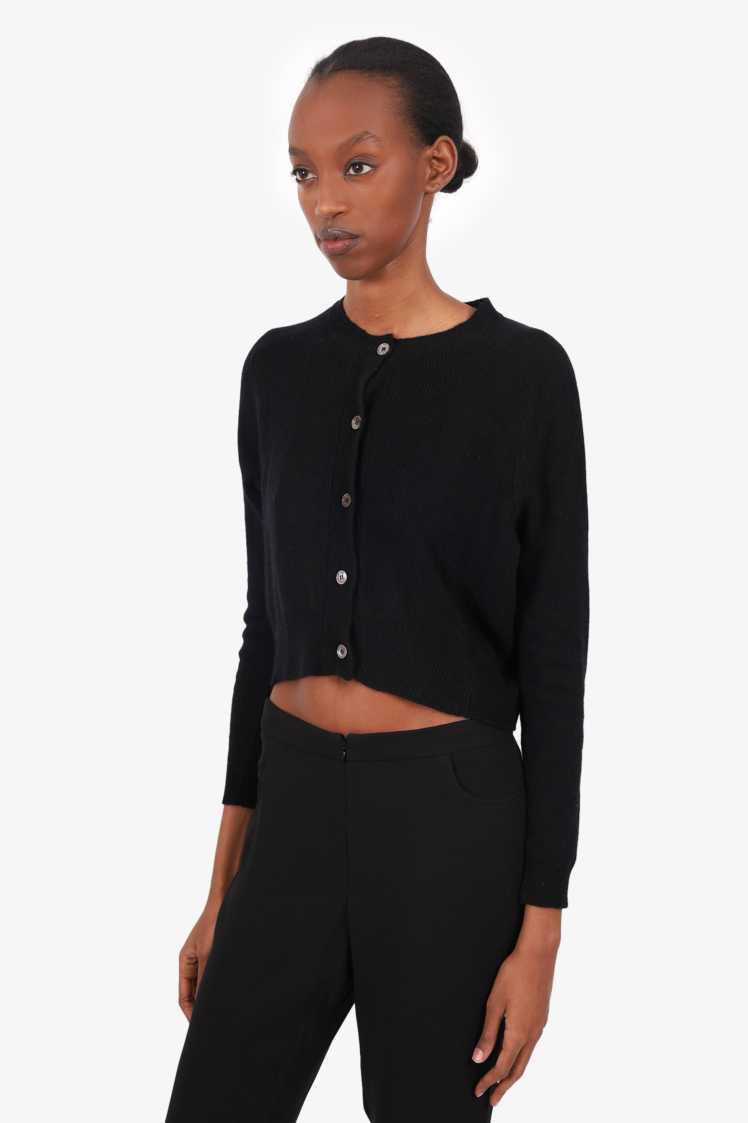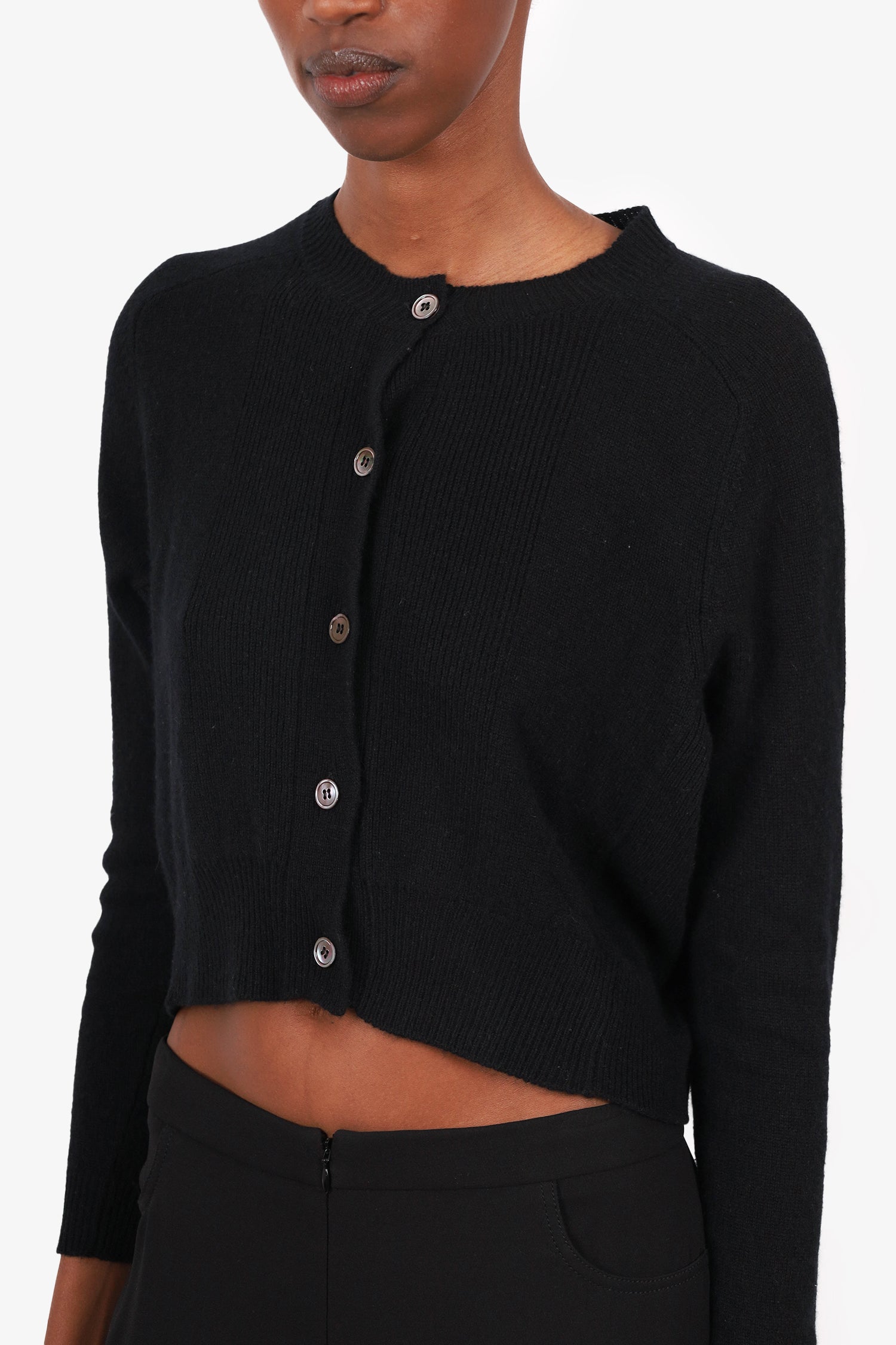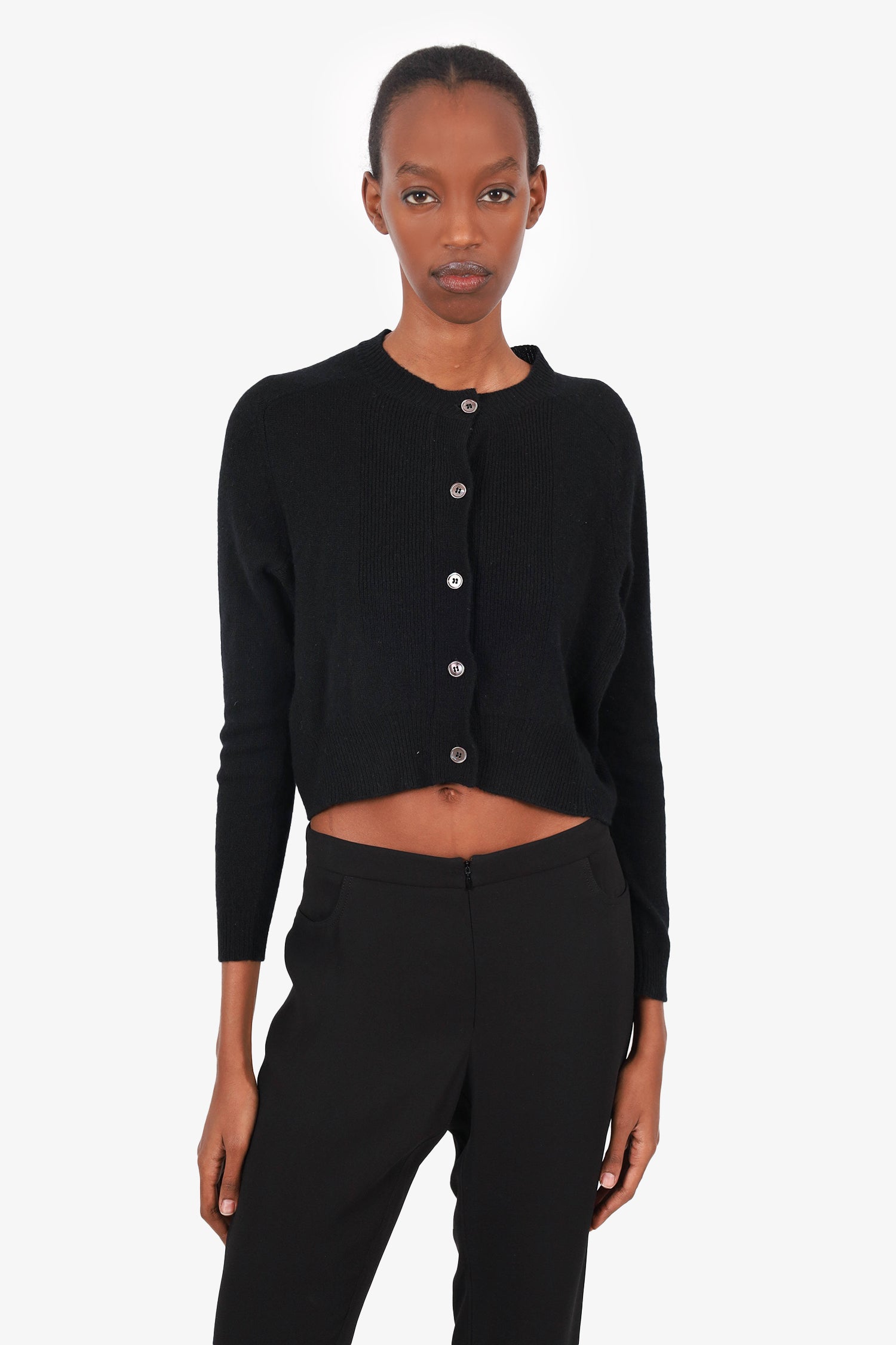 Refresh availabilityMarni Black Cashmere Ribbed Cropped Cardigan. Round neckline. Front button-up closure. Ribbed trimmings. Unlined. Tonal stitching.