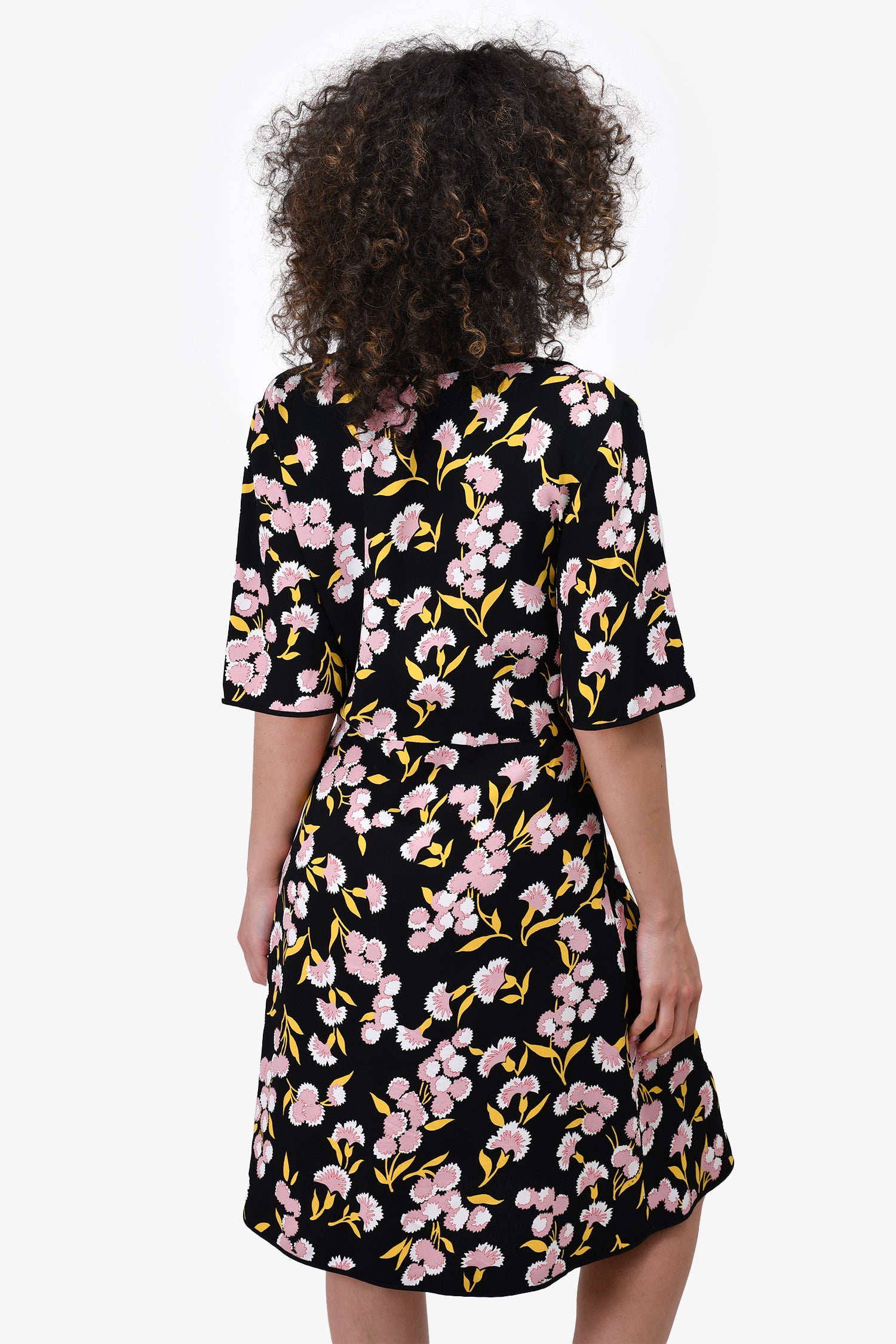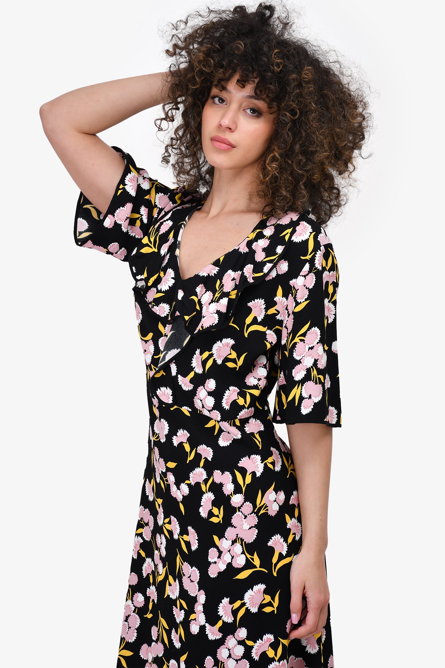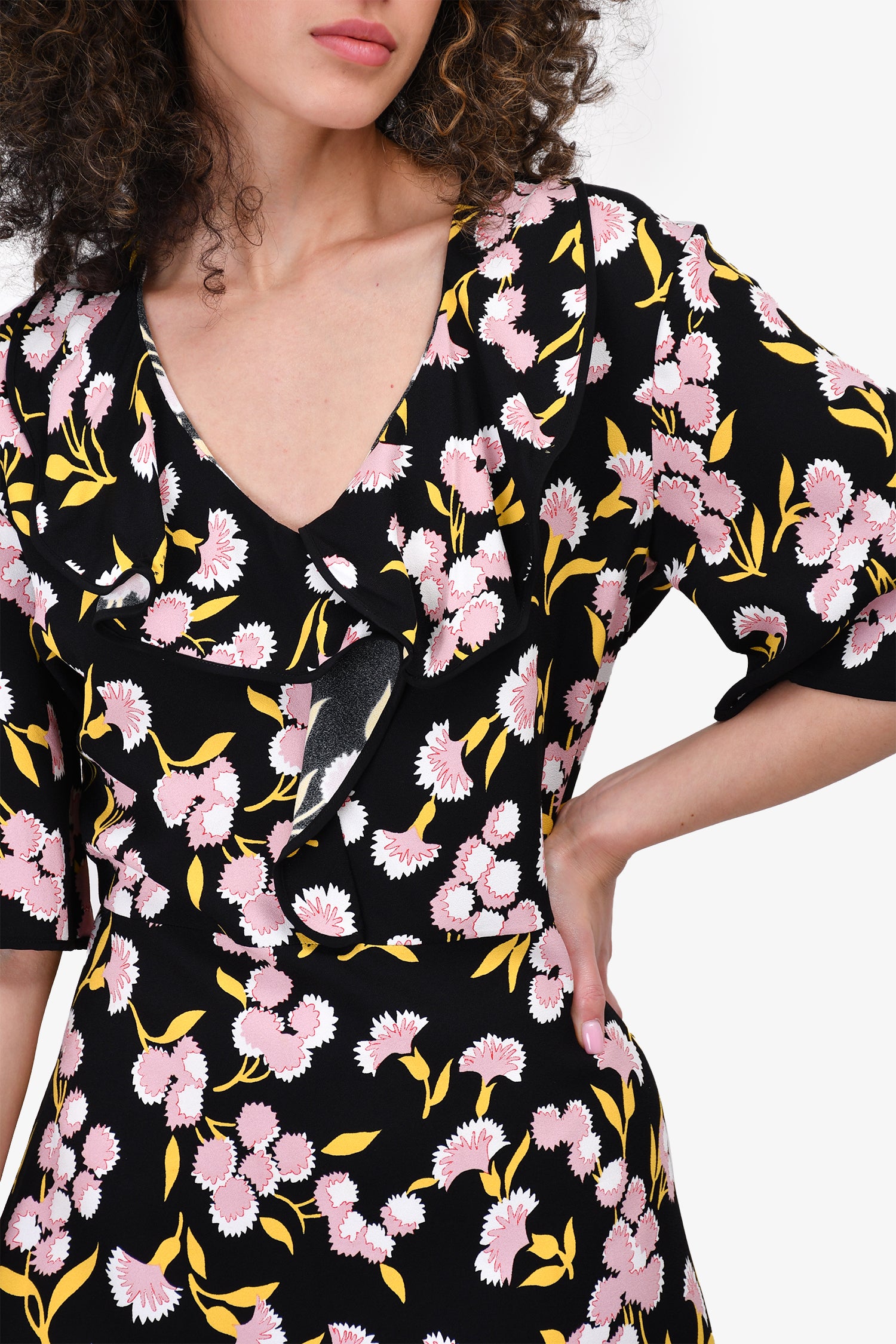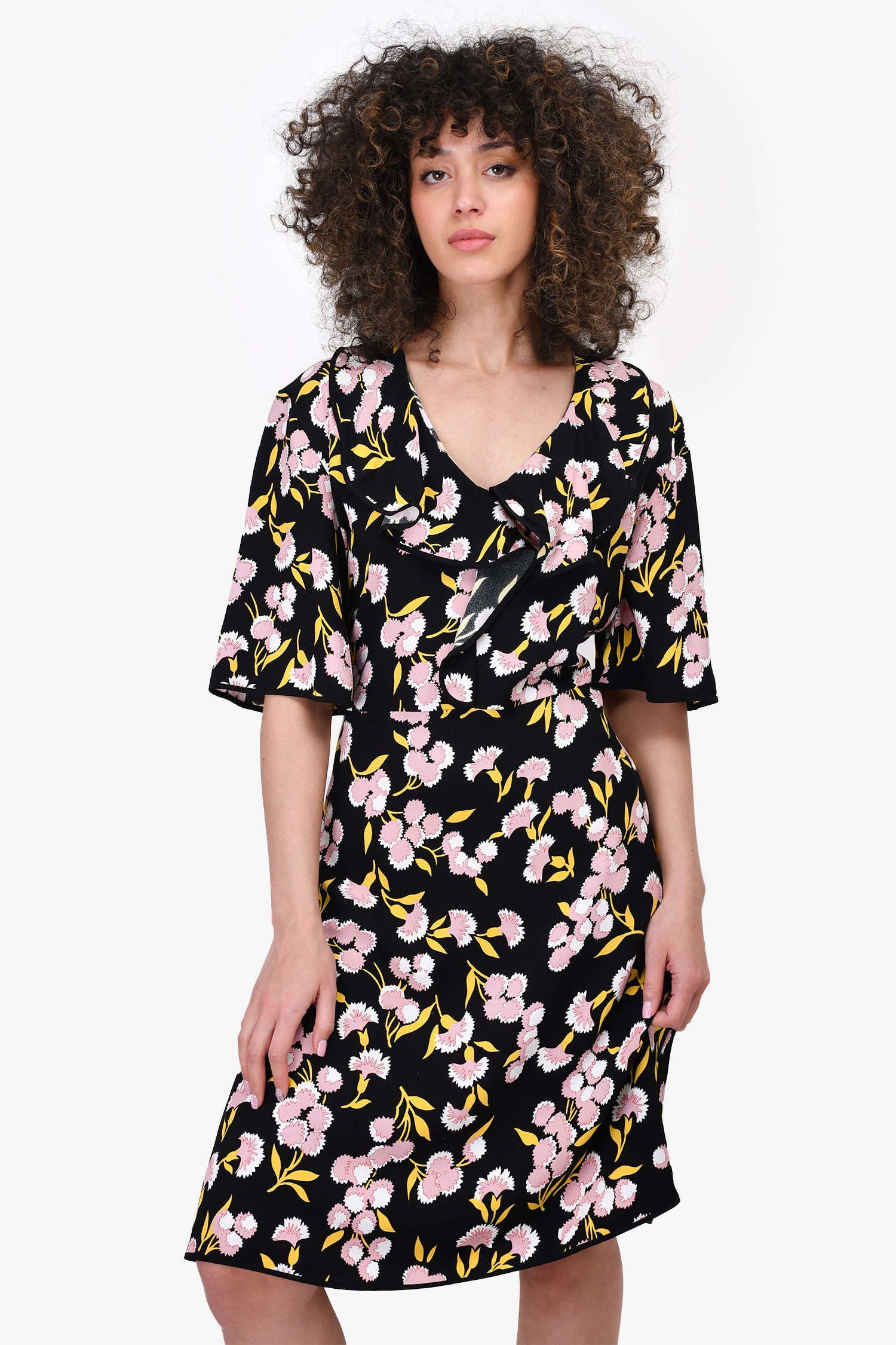 Refresh availabilityMarni Black & Pink Floral Ruffle Dress. V-neckline. Ruffled at the collar to waist. Tonal stitching.
