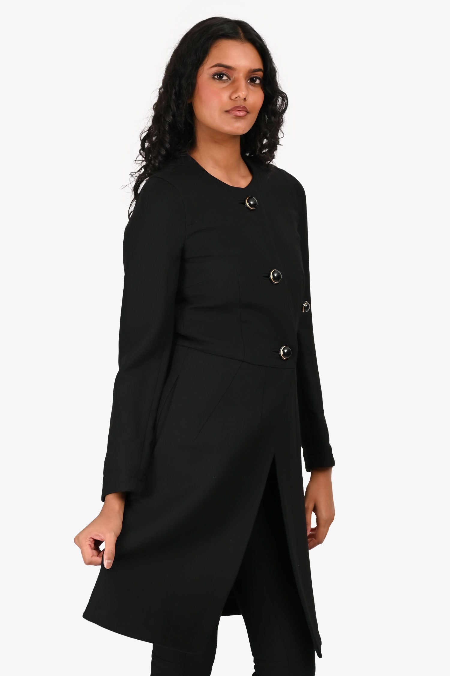Refresh availabilityMarni Black Wool/Silk Coat. Front button closure. Band collar. One side pocket with button closure. Two side seam pockets. Black and gold-tone hardware. Tonal stitching.