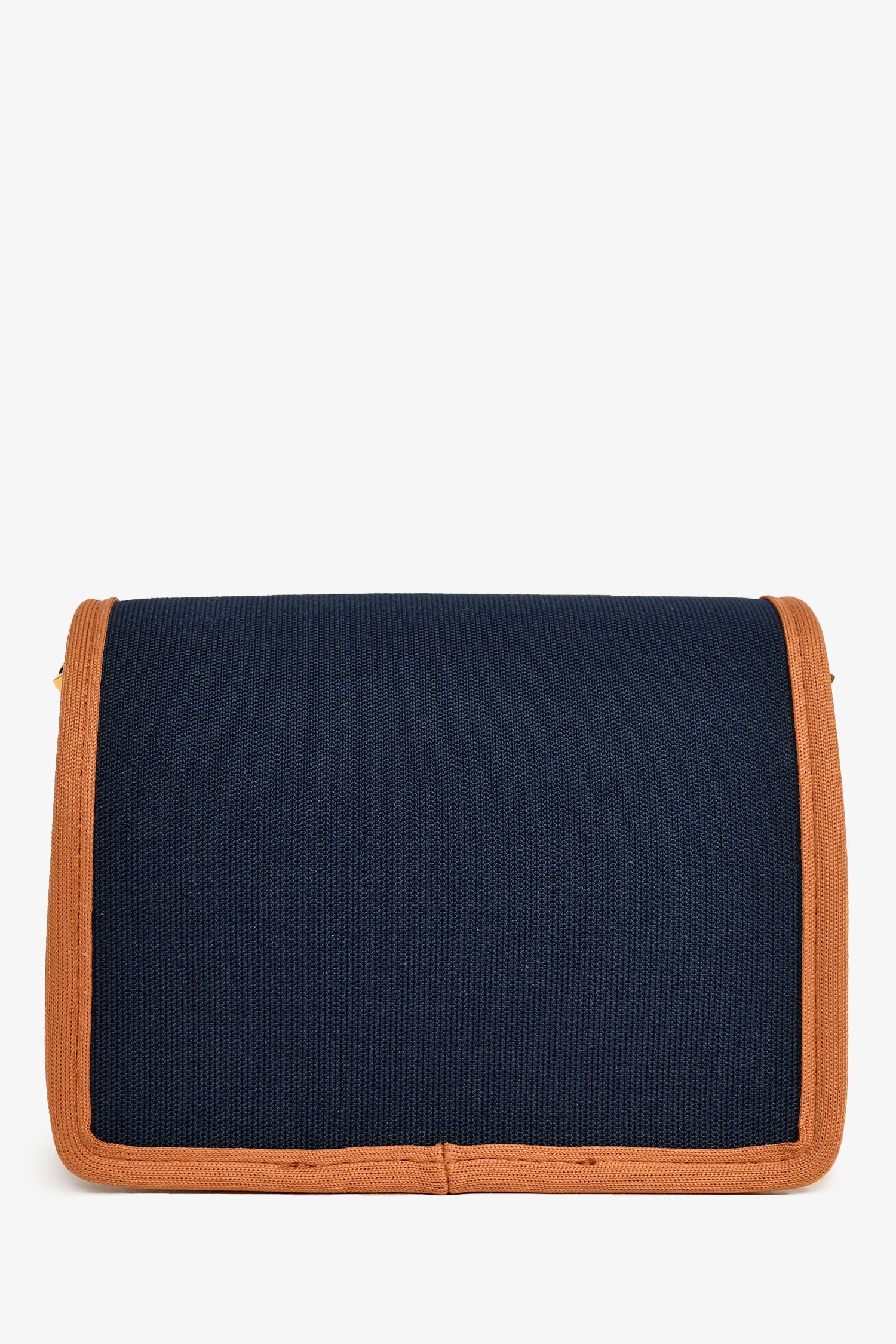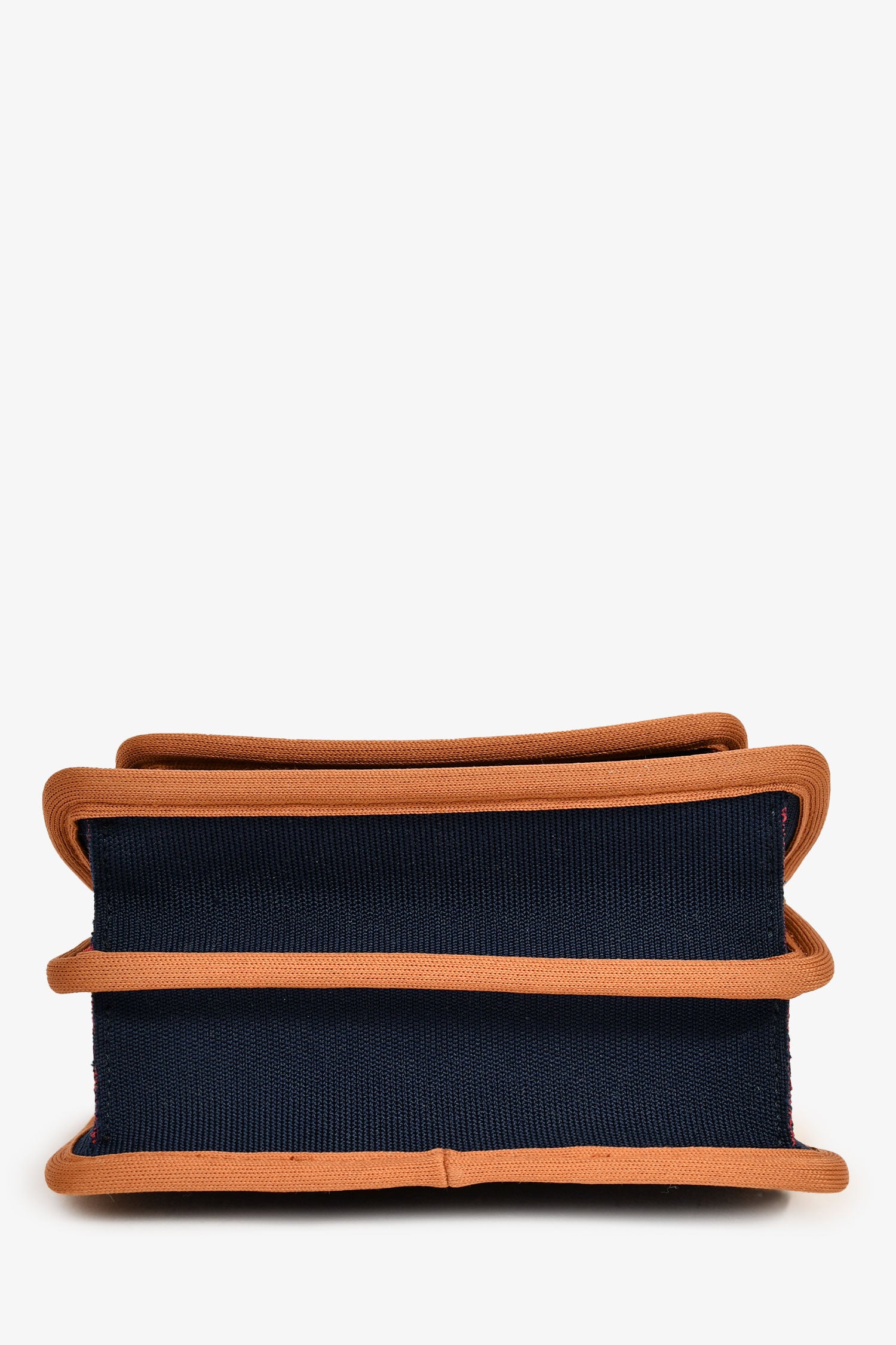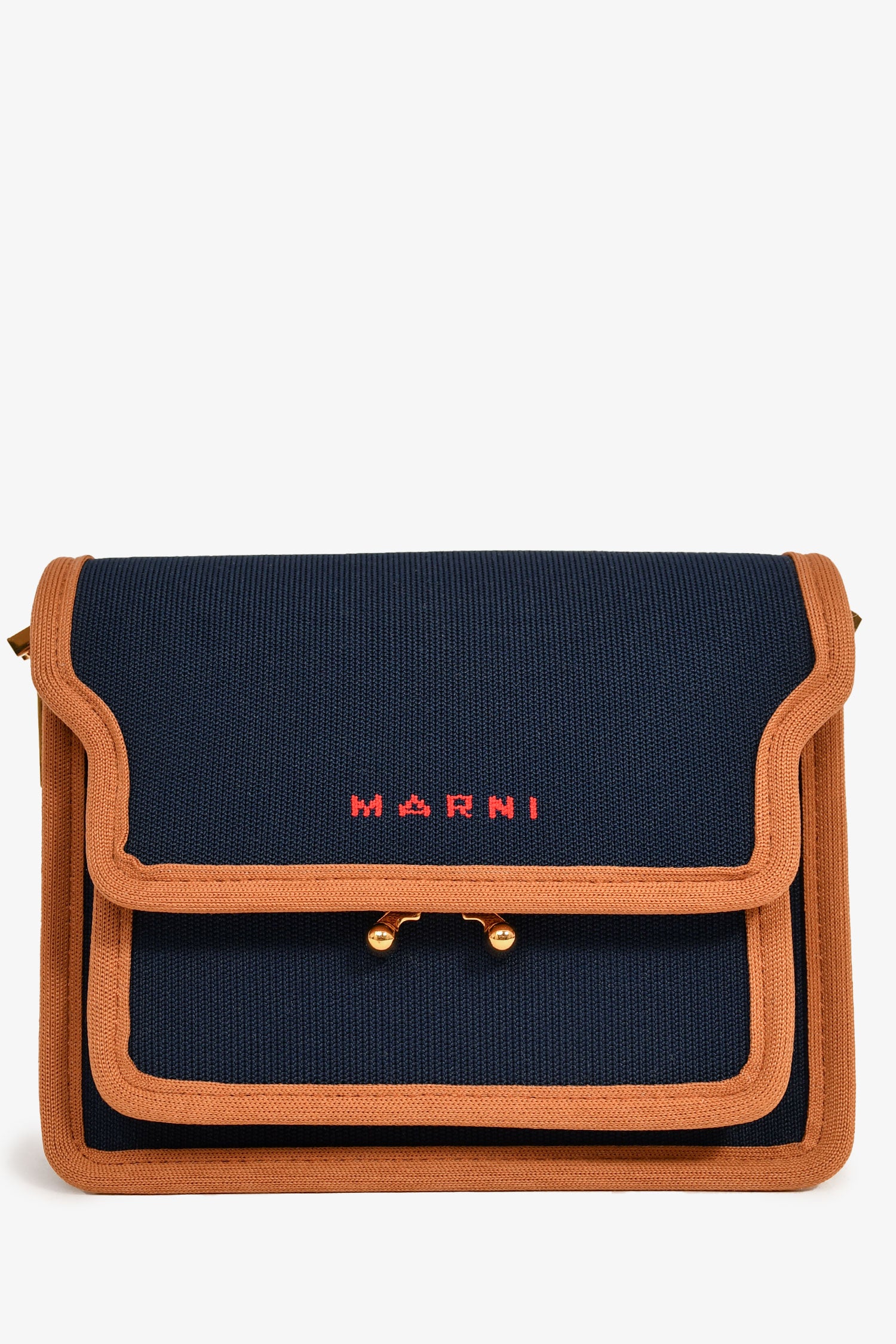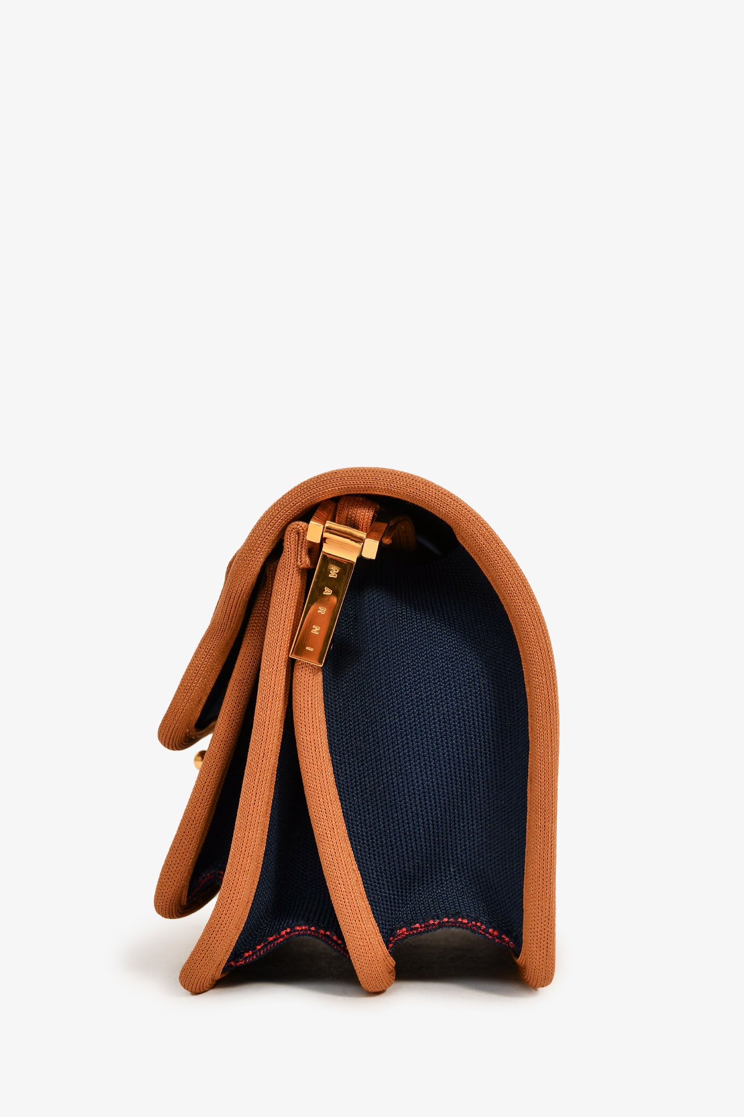 Refresh availabilityMarni Brown/Navy Canvas Mini Trunk Crossbody. Front fold-over flap with press-release closure. Three interior compartments and one with a wall slip pocket. Adjustable strap. Gold-tone hardware. Tonal stitching.