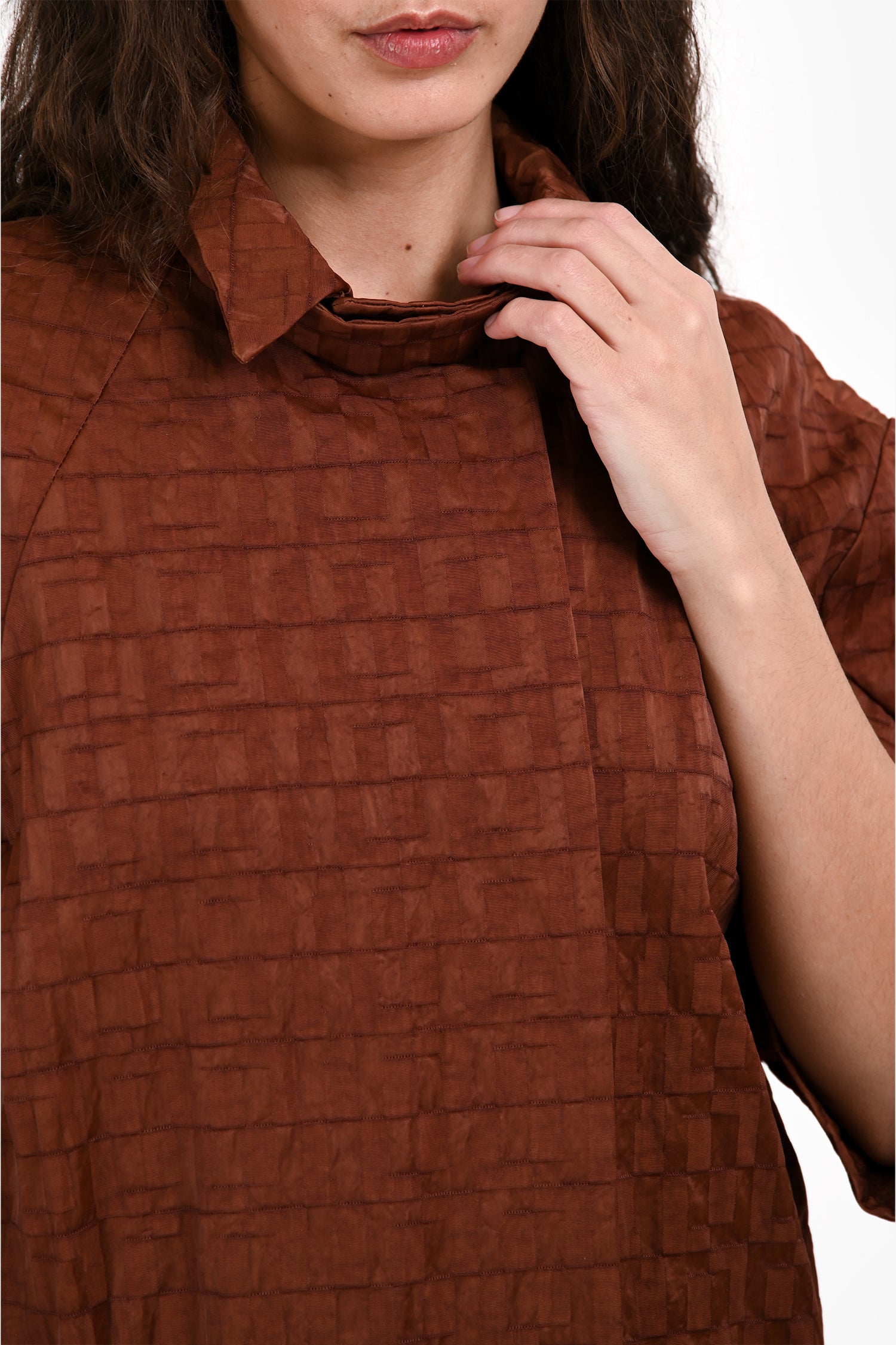 Refresh availabilityMarni Brown Nylon Textured 3/4 Sleeve Coat. Slip-on. Collared with neck straps. Front snap closures. Side seam pockets. Lined. Tonal stitching.