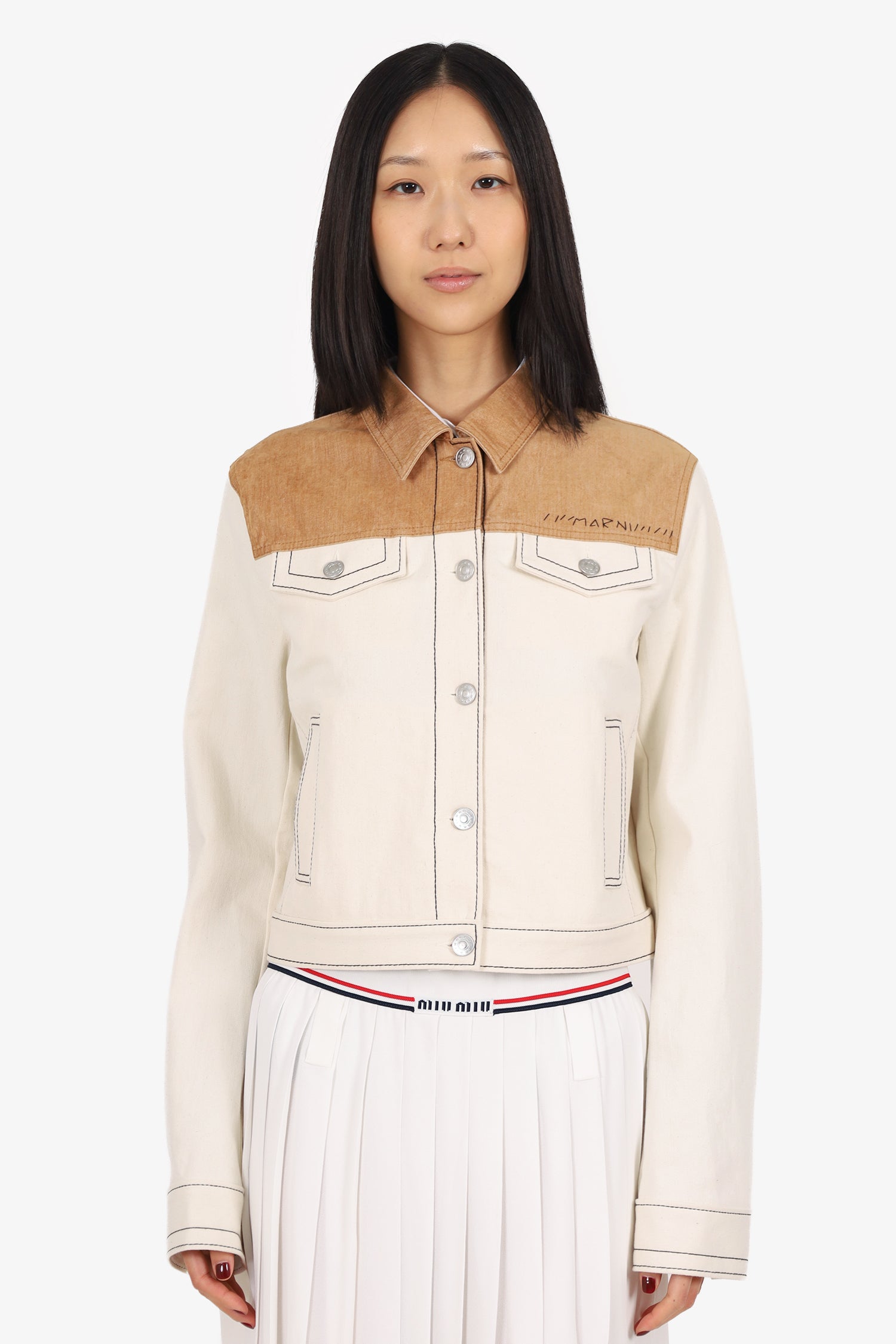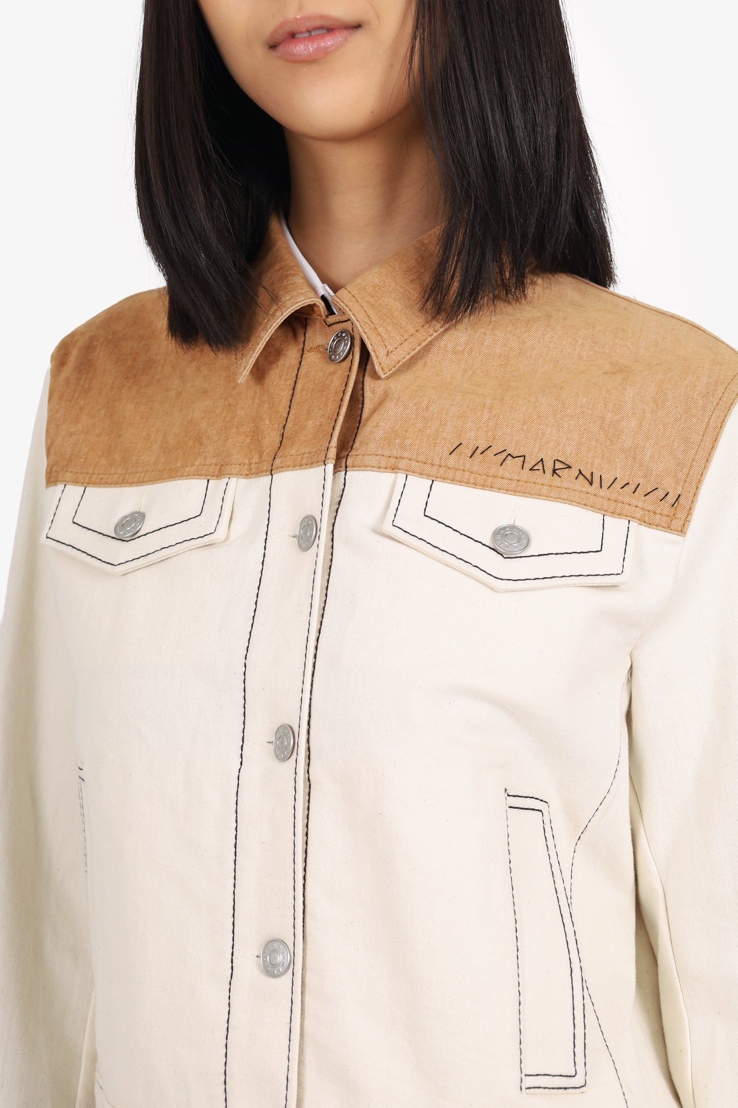 Refresh availabilityMarni Brown/Cream Buttoned Jacket. Pull-on. Collared-neckline. Front button-up closure. Sleeve cuffs with button-up closure. 4 front exterior pockets; 2 side slip and 2 chest flap with button-up closure. Unlined. Tonal stitching.