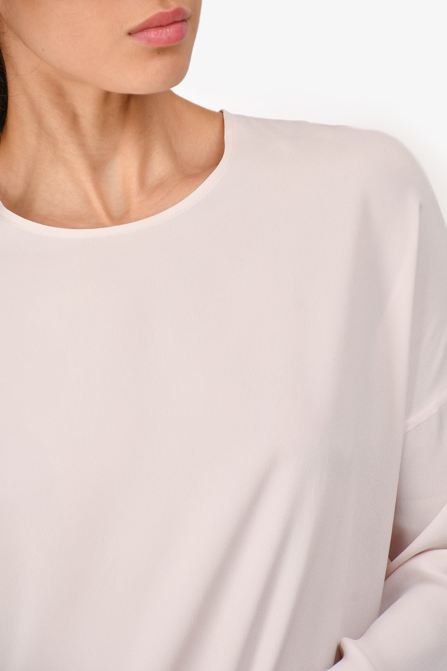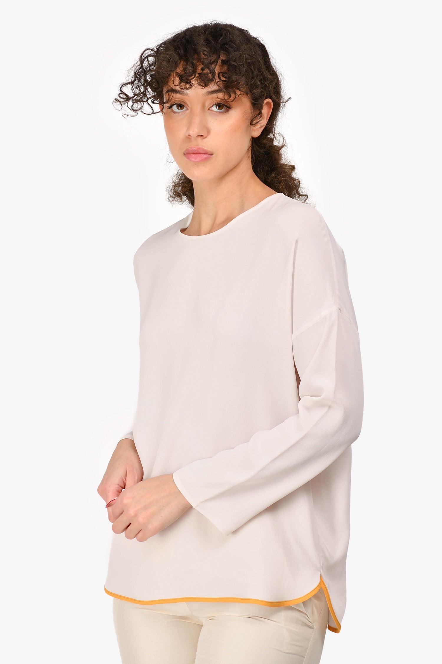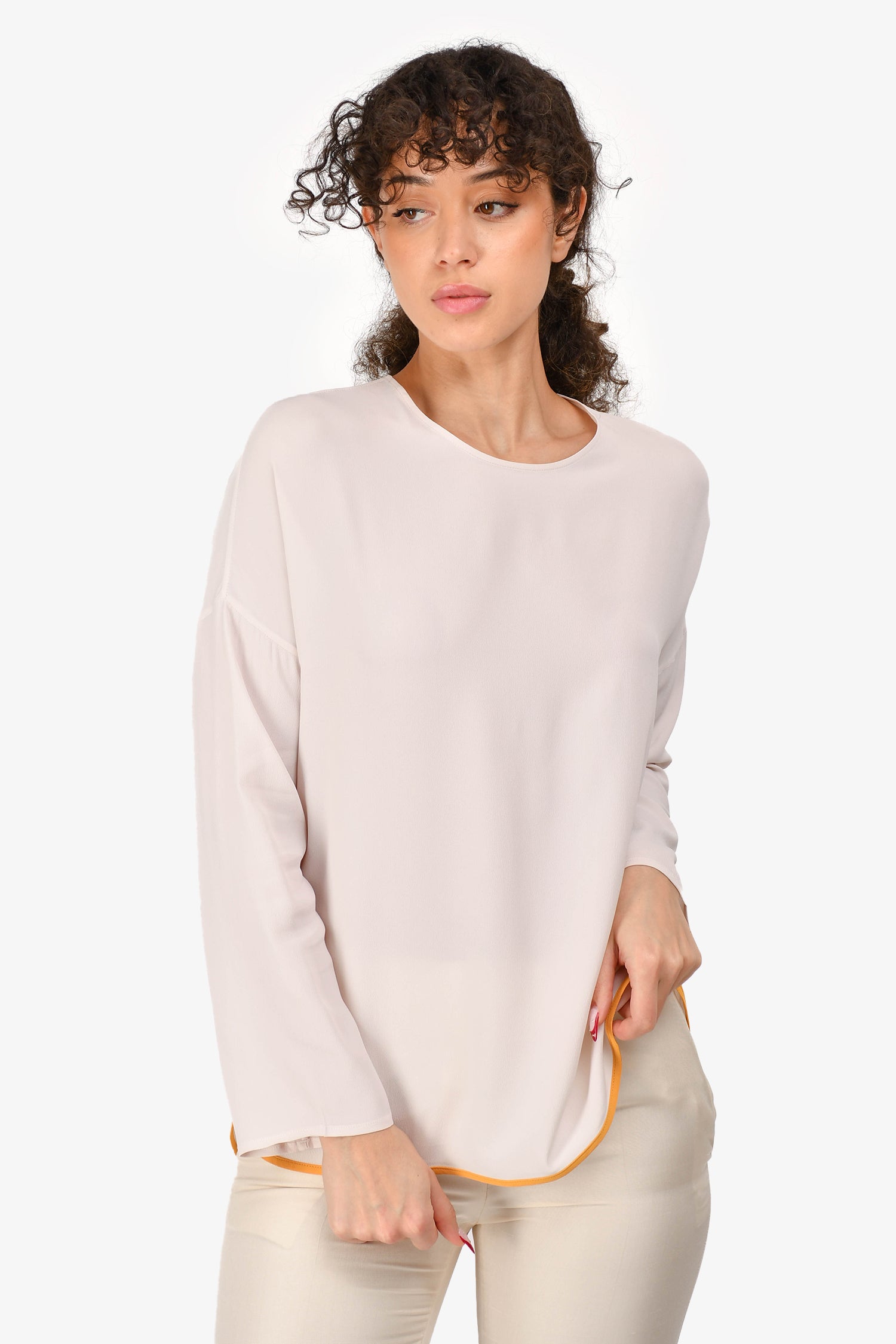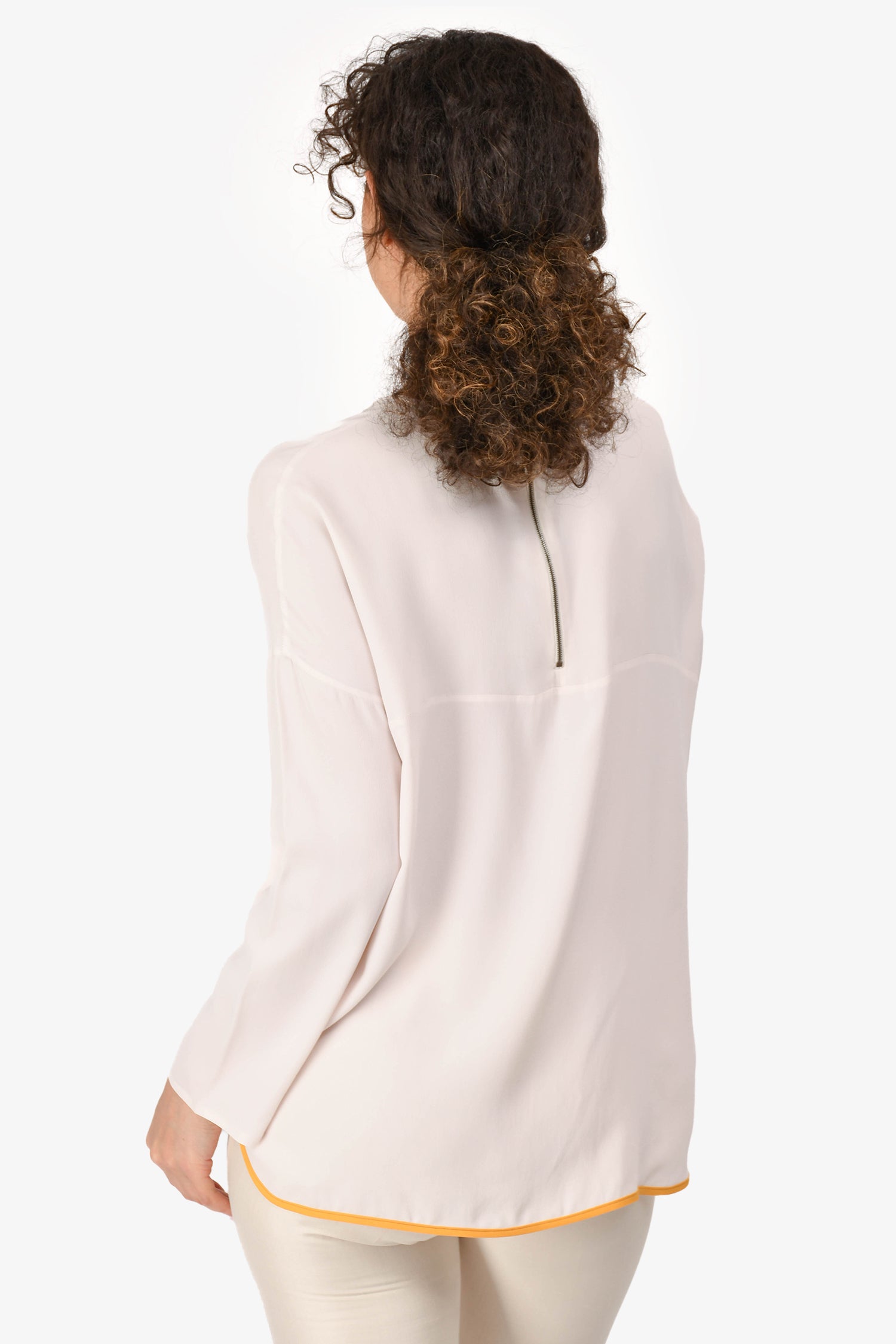 Refresh availabilityMarni Light Pink Silk Blend Long-Sleeve Blouse with Orange Trim. Back zip closure. Orange trim on the bottom. Tonal stitching.