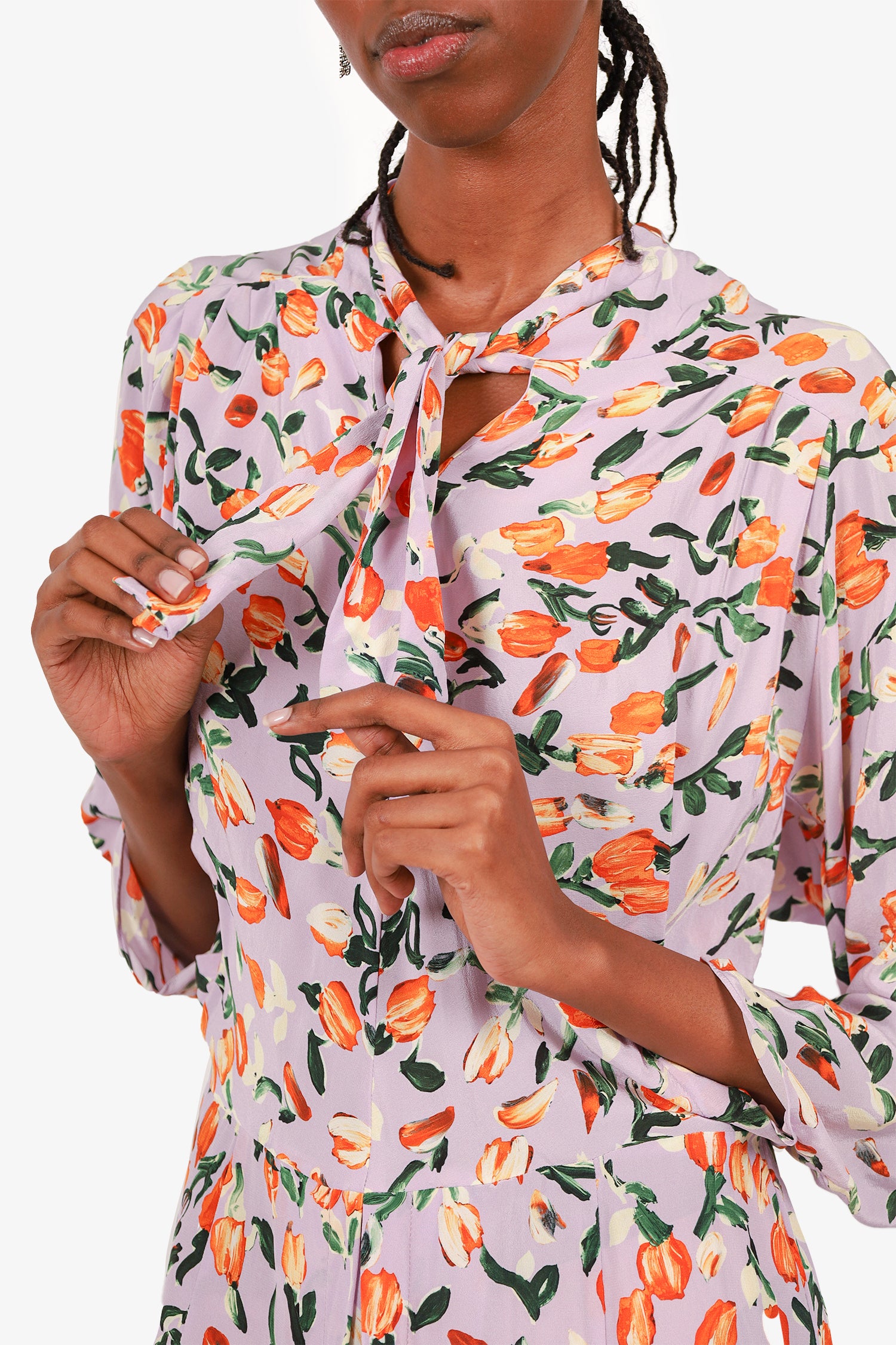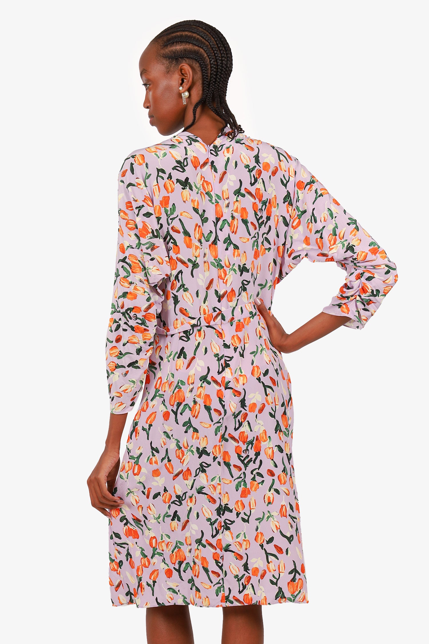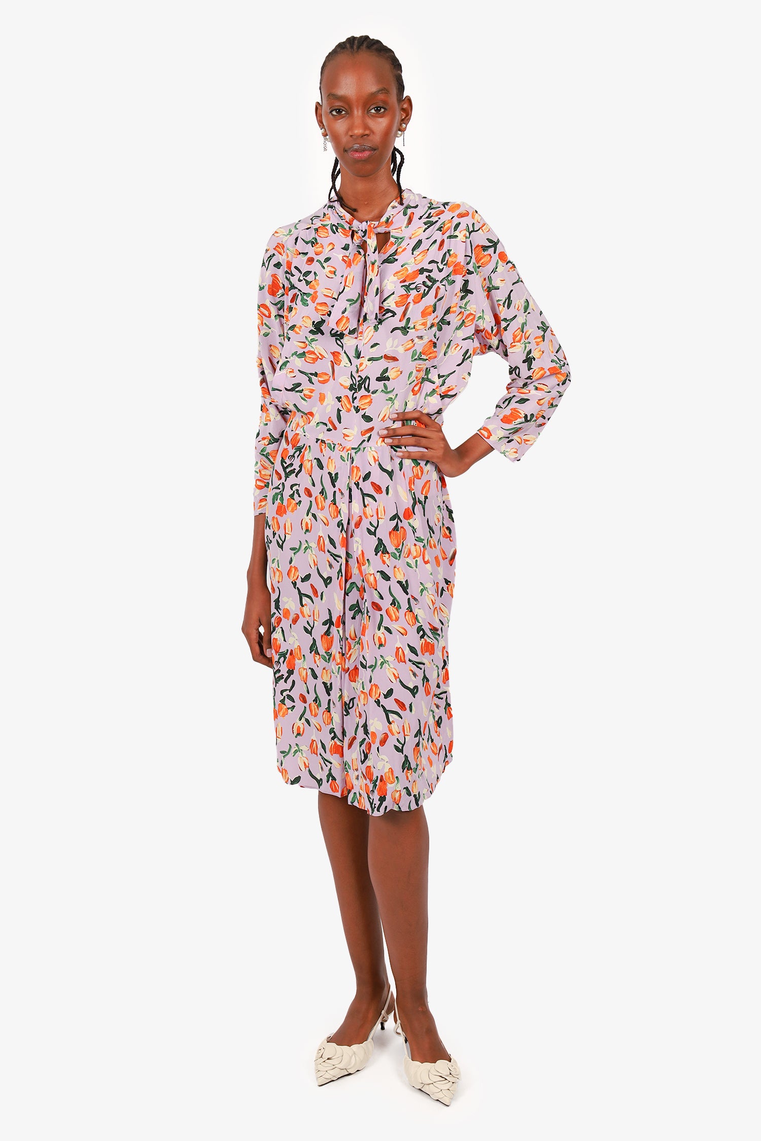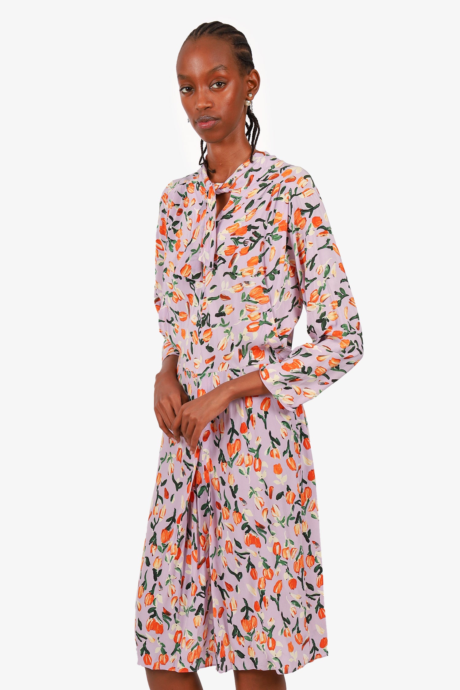 Refresh availabilityMarni Lilac/Orange Silk Floral Print Dress. Rear zip closure and front hook. Long-sleeves. Ruched sleeves. Tonal stitching.