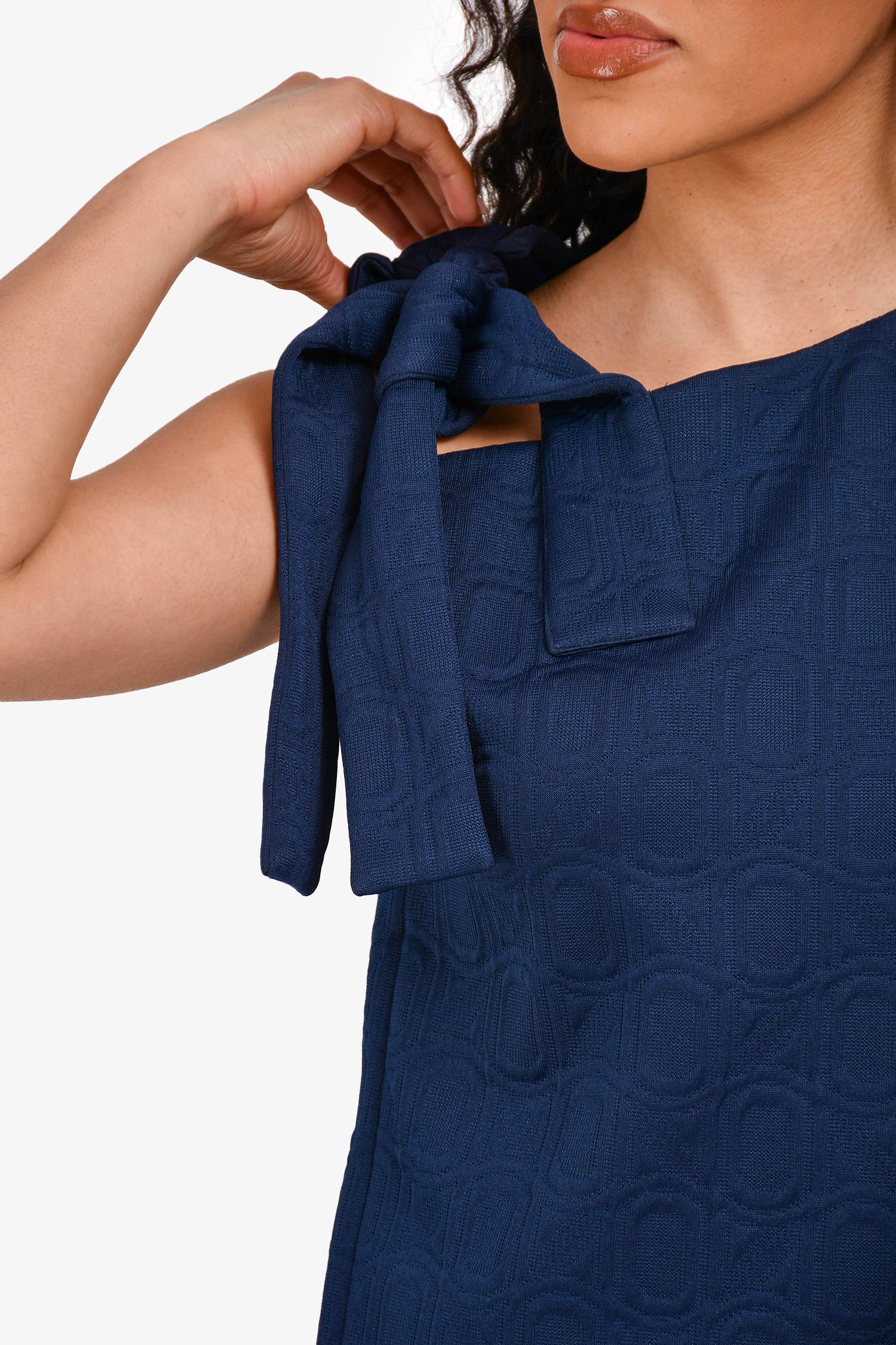 Refresh availabilityMarni Navy Sleeveless Midi Dress with Neck Tie. Asymmetrical neckline with self-tie detail on the side. Sleeveless. Concealed side zip closure. Unlined. Tonal stitching.