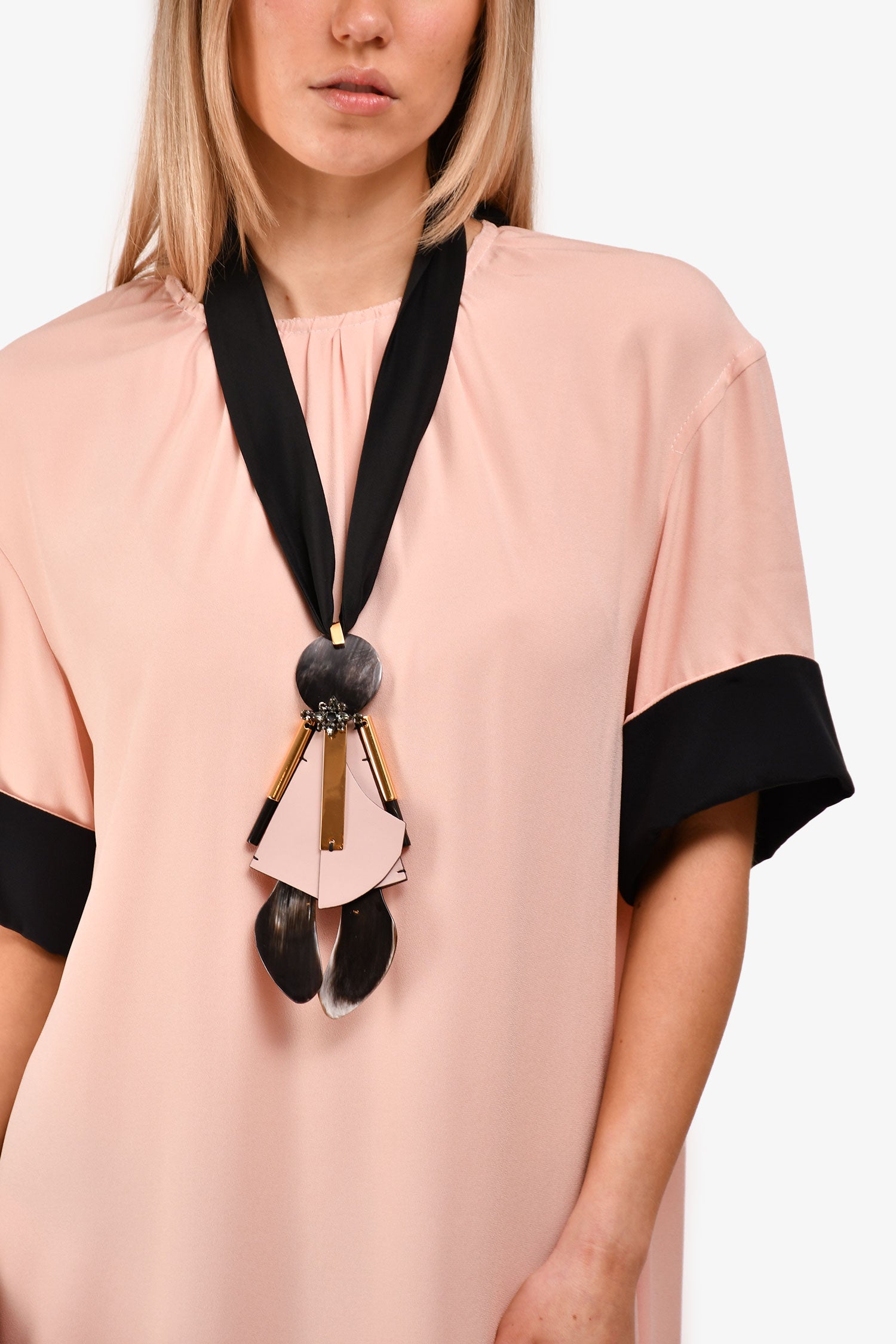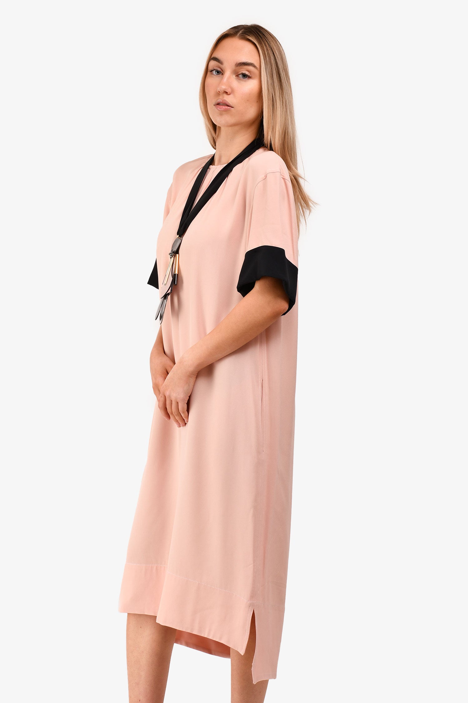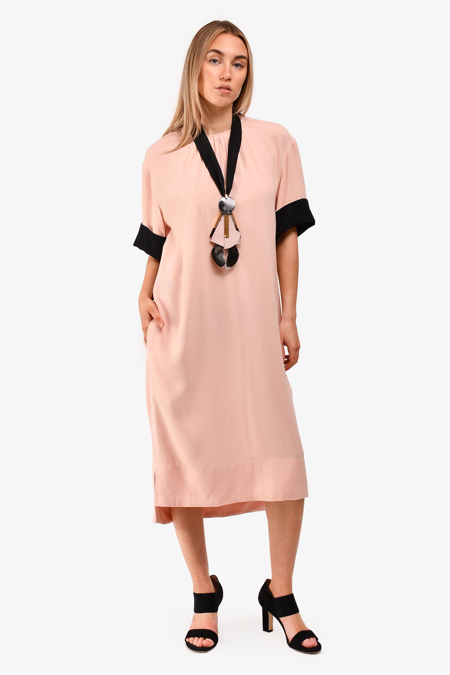 Refresh availabilityMarni Pink/Black Midi Shift Dress With Pendant Ribbon Necklace Set. Round neckline with zipper closure. Two front pockets. Tie-back necklace. Tonal stitching.