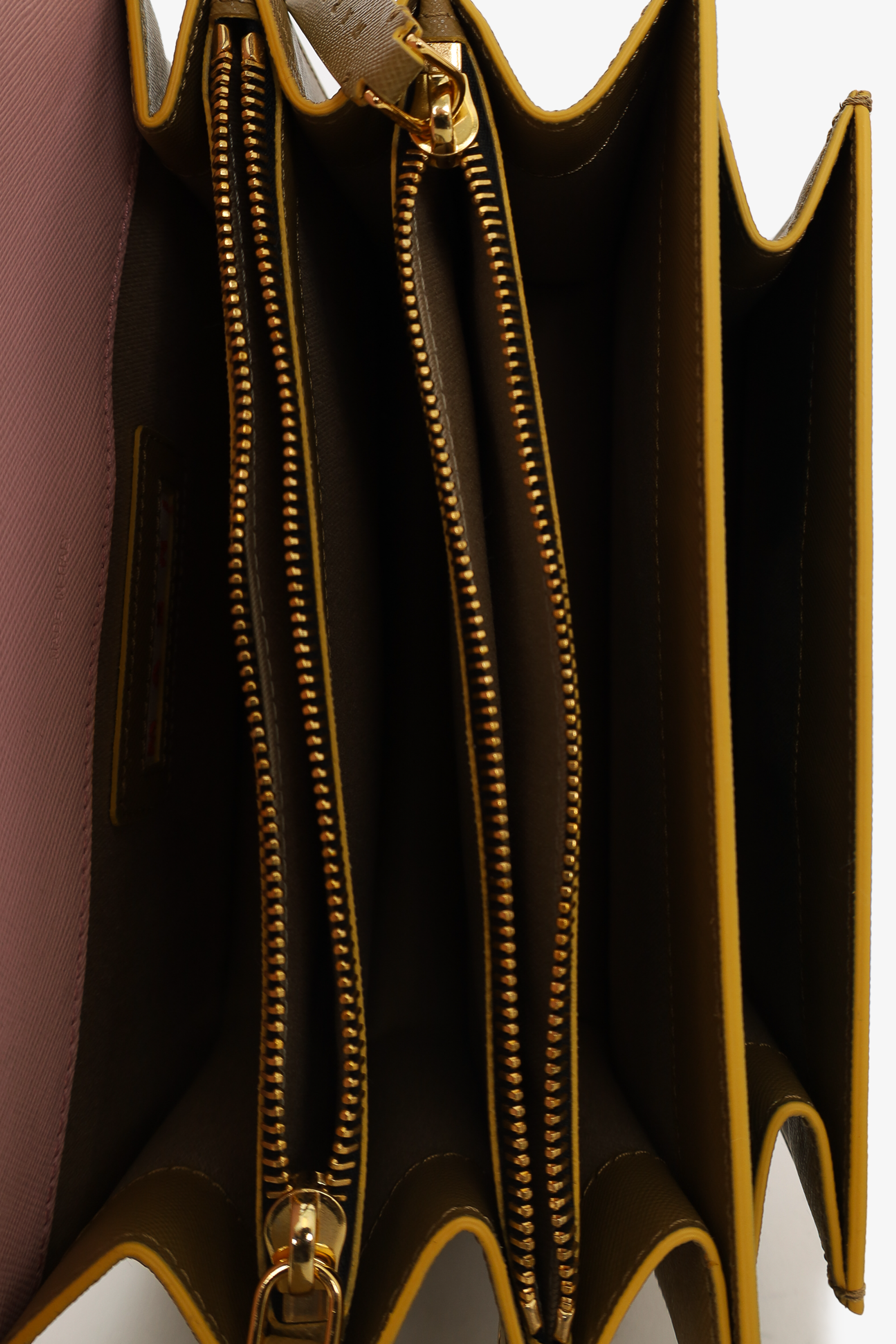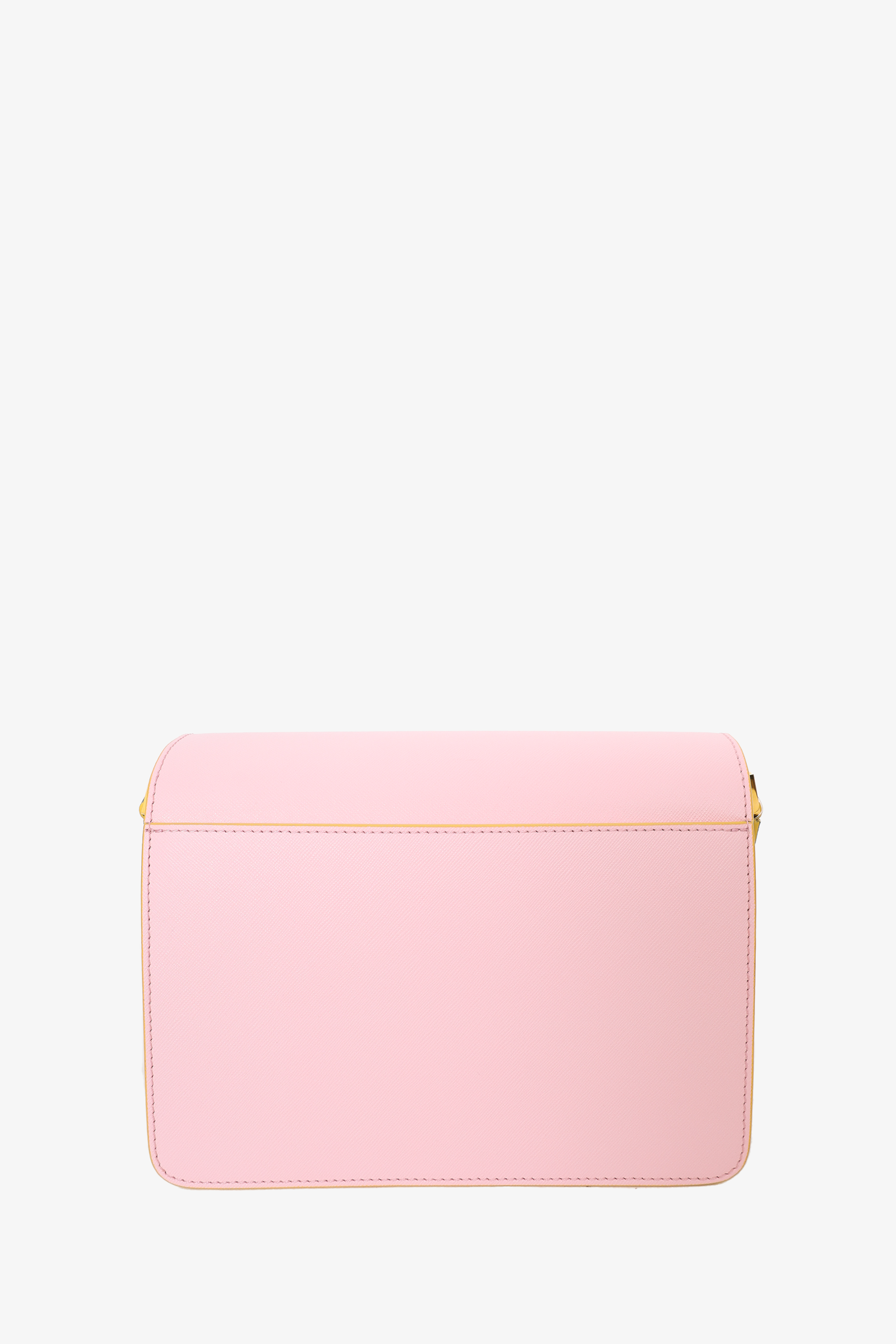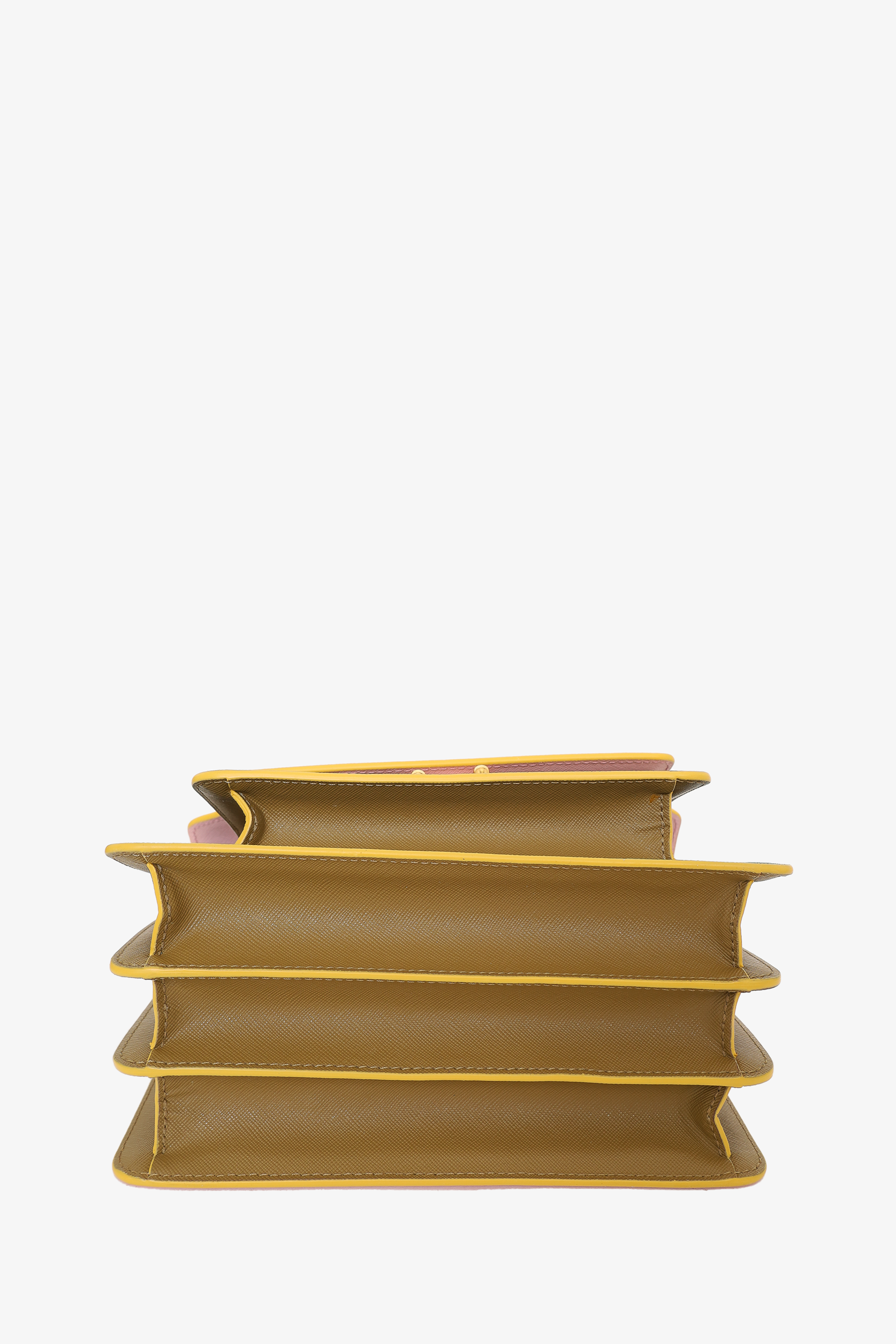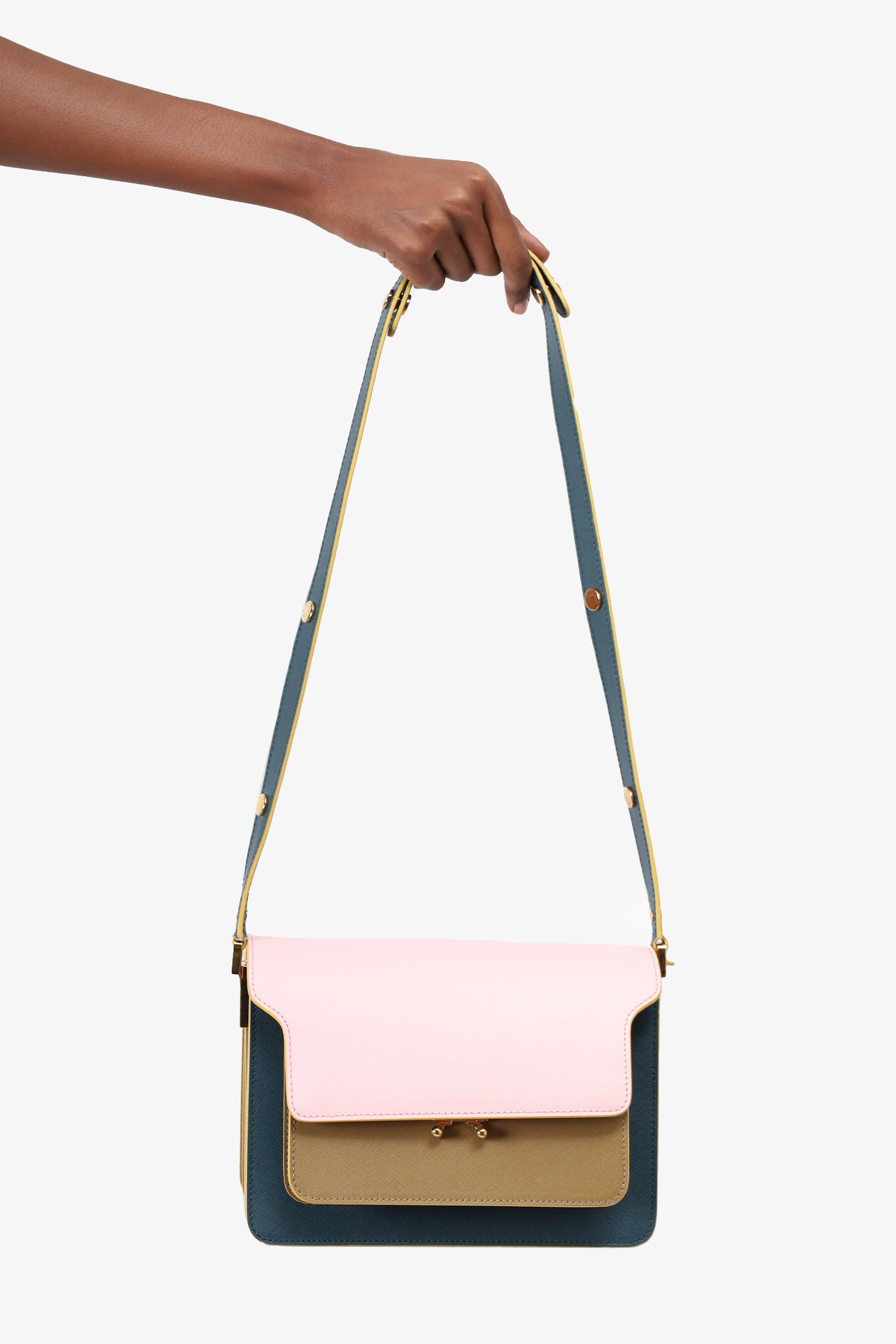 Refresh availabilityMarni Pink/Brown/Blue Leather Trunk Bag. Push snap closure. Rear exterior slip pocket. Adjustable crossbody strap with snap buttons. 4 open compartments. 2 compartments. Gold tone hardware. Tonal stitching.