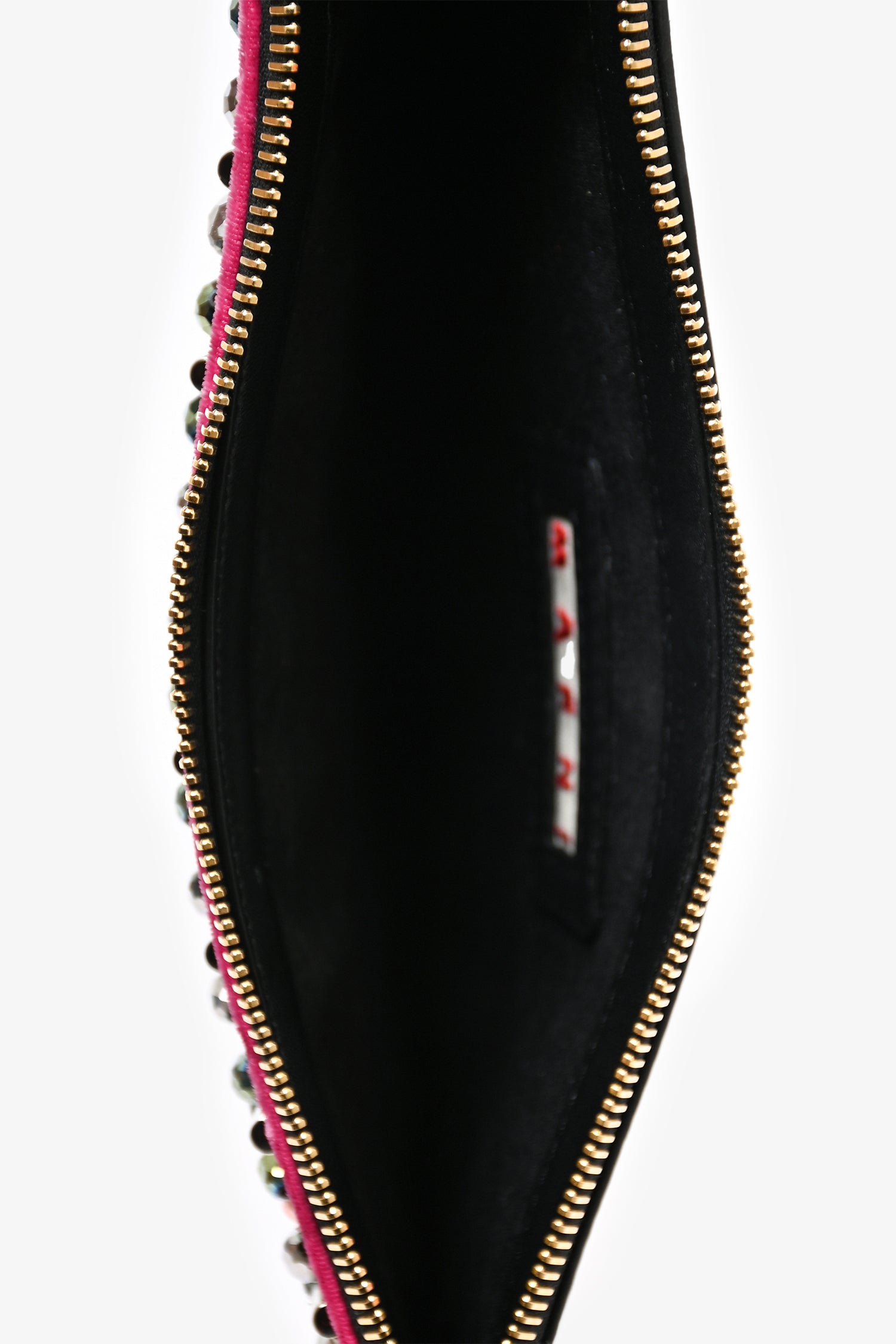 Refresh availabilityMarni Pink Velvet Crystal Embellished Wristlet. Gold-tone hardware. Tonal stitching. Velvet exterior with embellishment. Lined interior. Leather back exterior with logo debossed stamp.