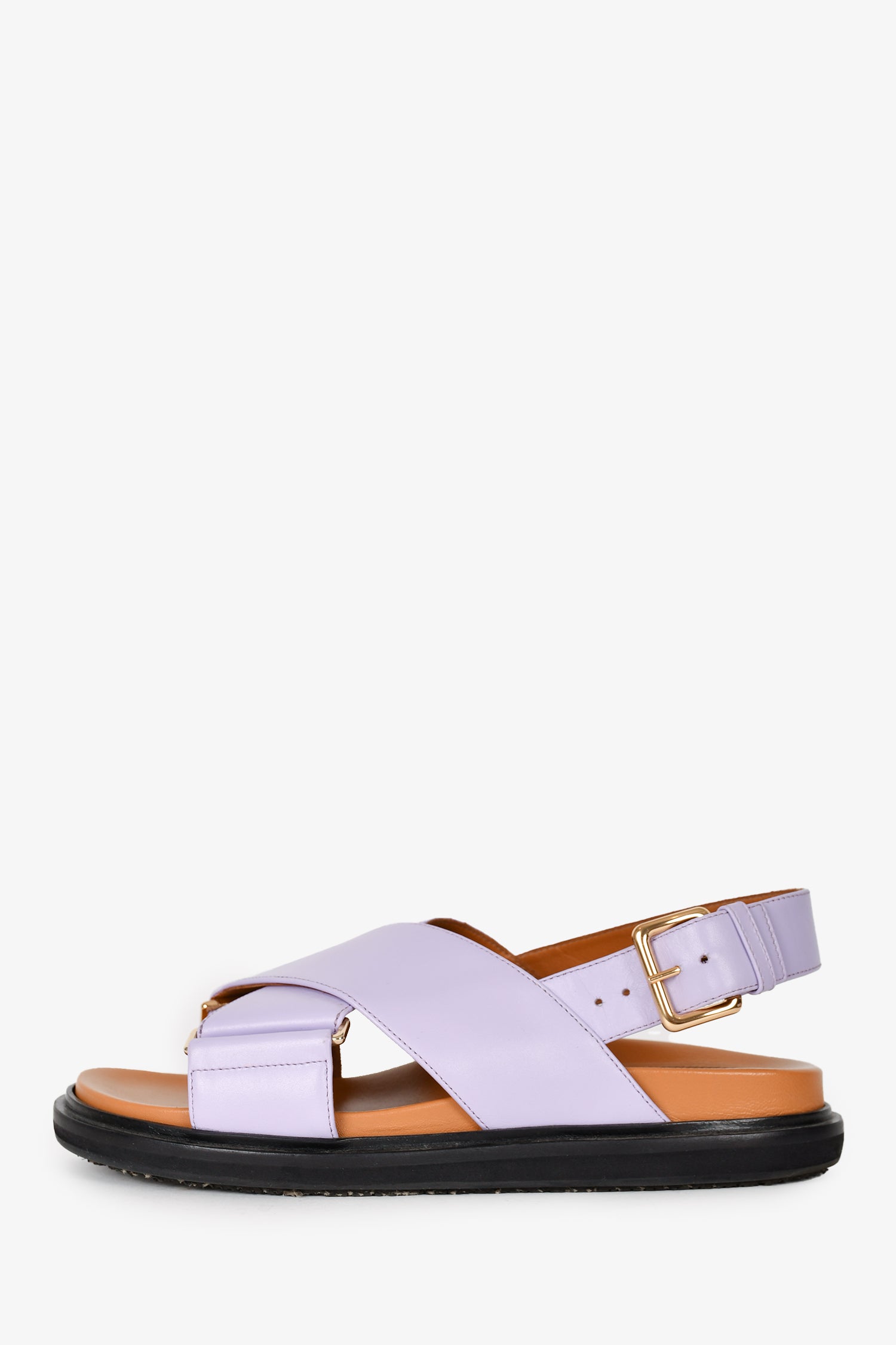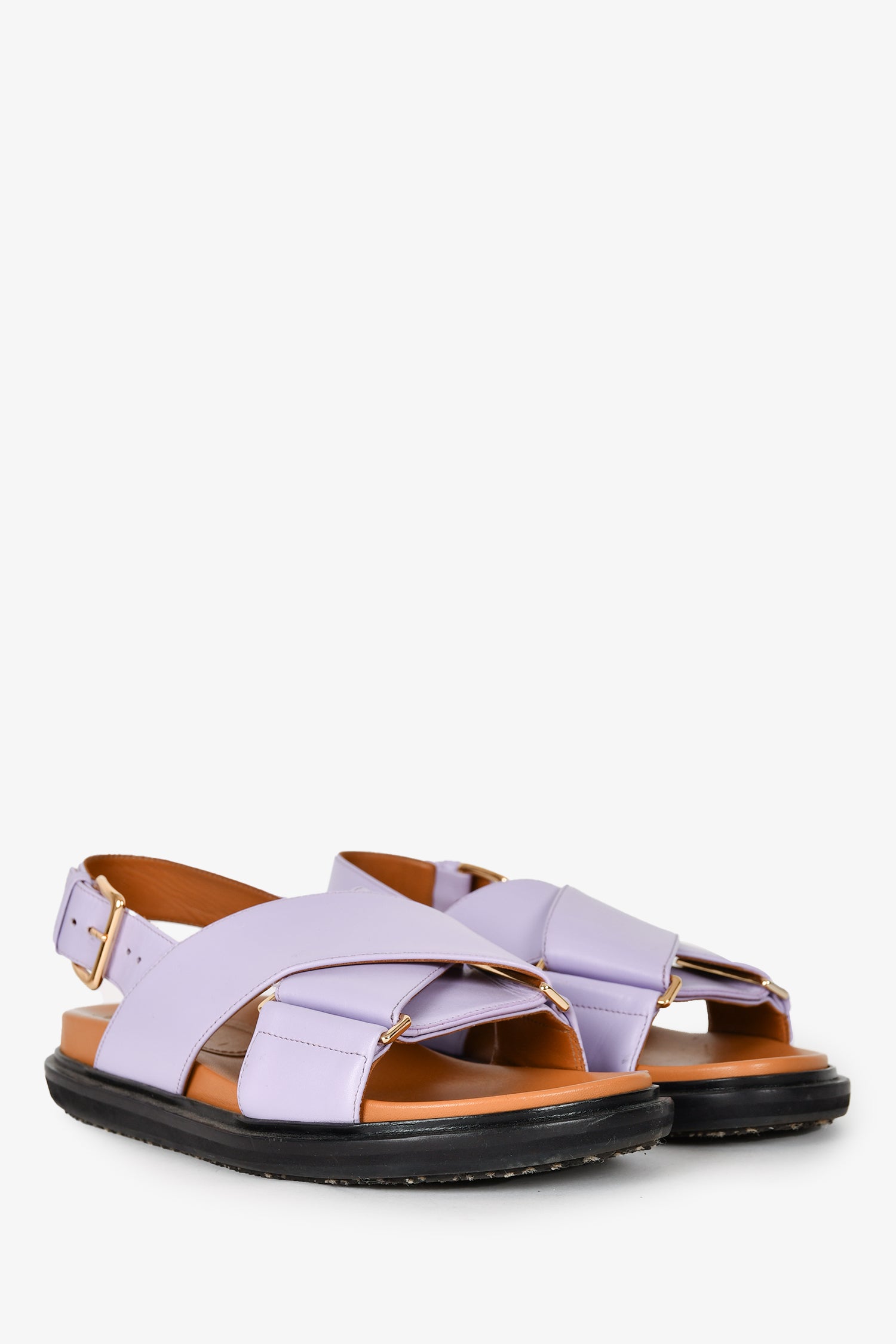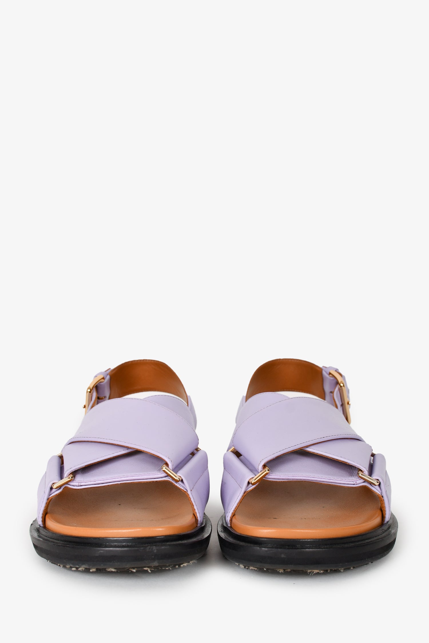 Refresh availabilityMarni Purple Leather 'Fussbett' Slingback Sandals. Open toe. Ankle strap with buckle closure. Gold-tone hardware.