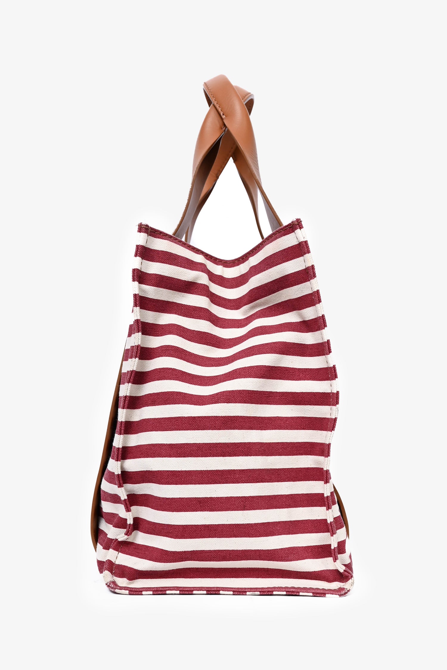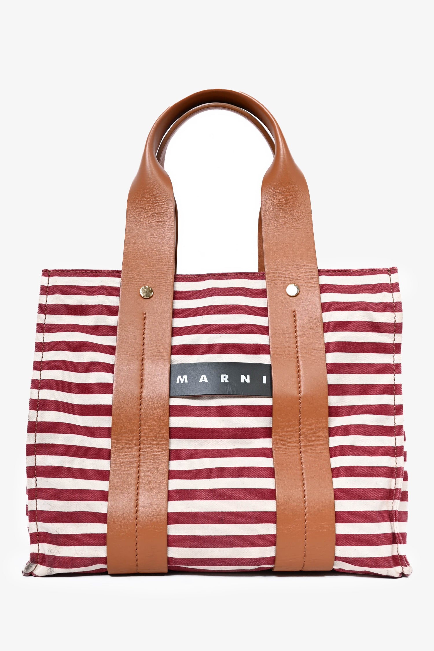 Marni Red/White Striped Canvas with Tan Leather Strap Tote