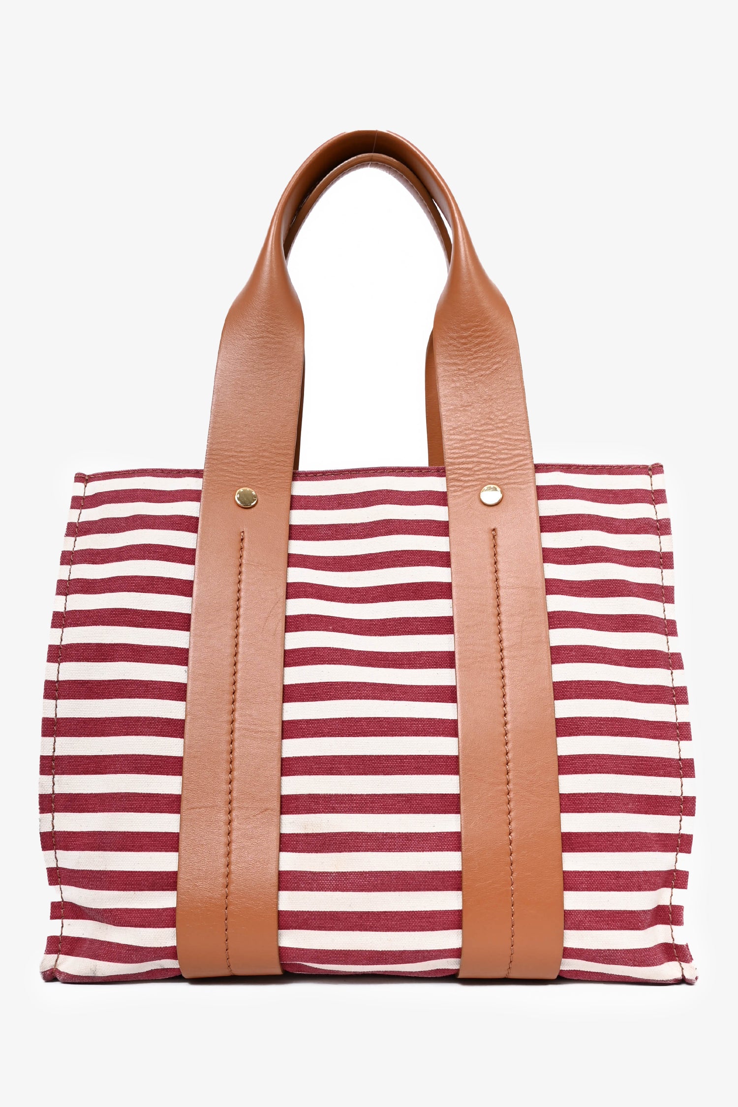 Refresh availabilityMarni Red/White Striped Canvas with Tan Leather Strap Tote. Contrast topstitching. Tan top handles.