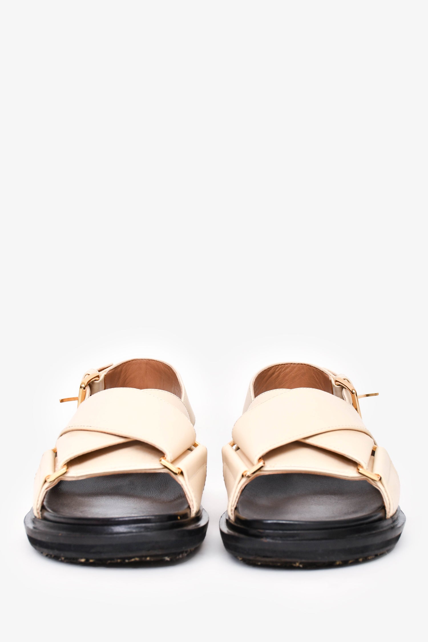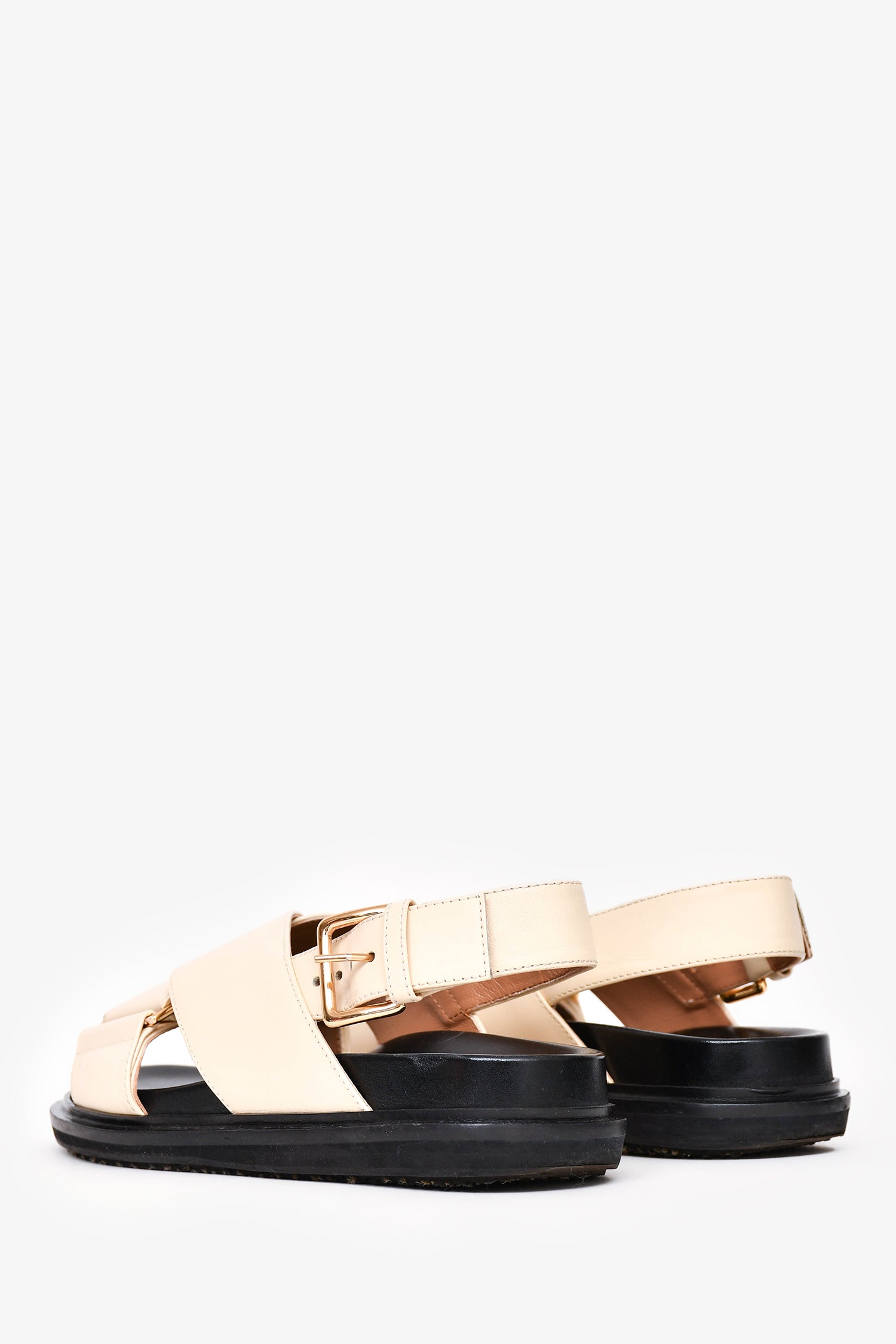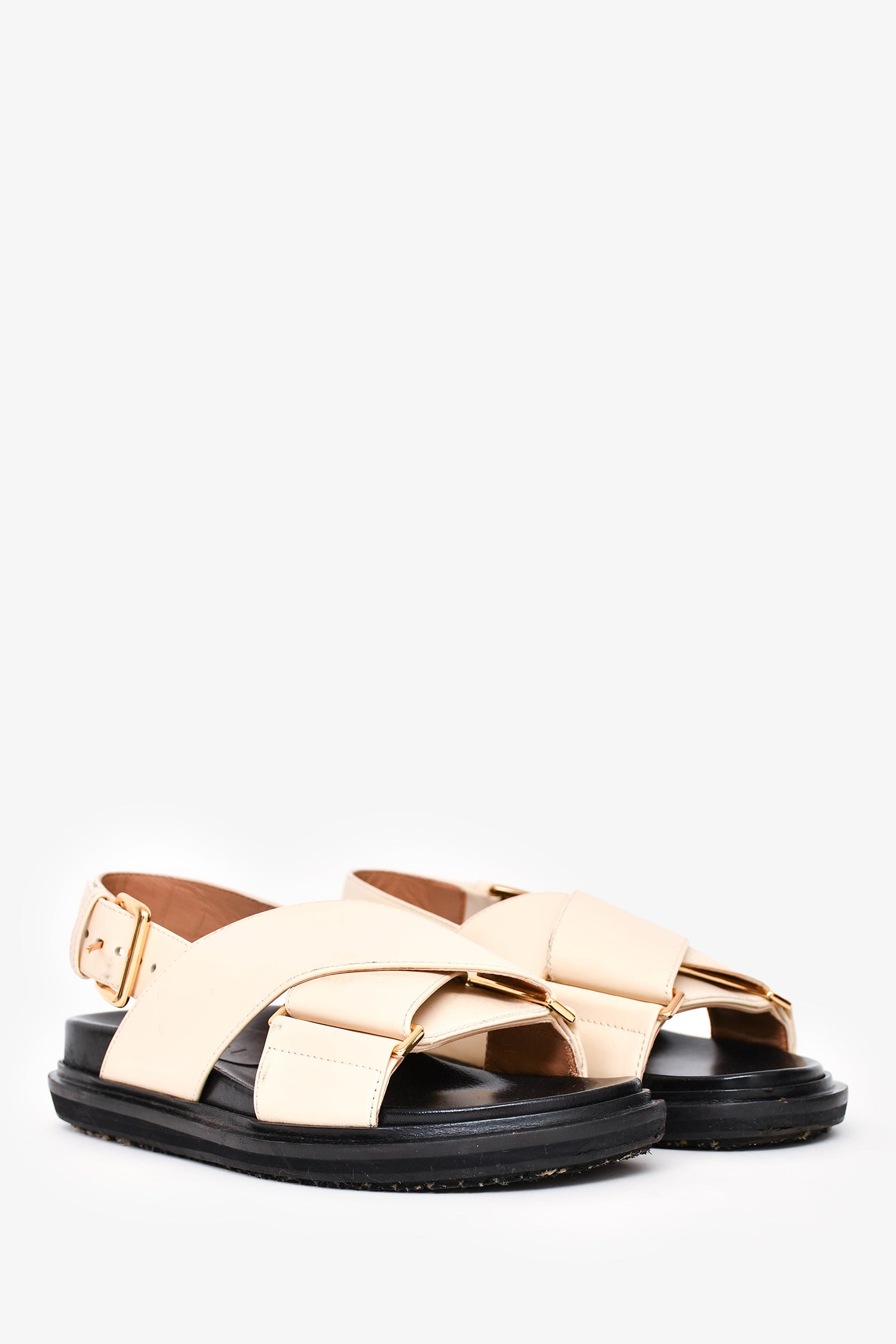 Refresh availabilityMarni White Leather Crossover Sandals. Buckle closure on the ankle. Gold-tone hardware. Tonal stitching.
