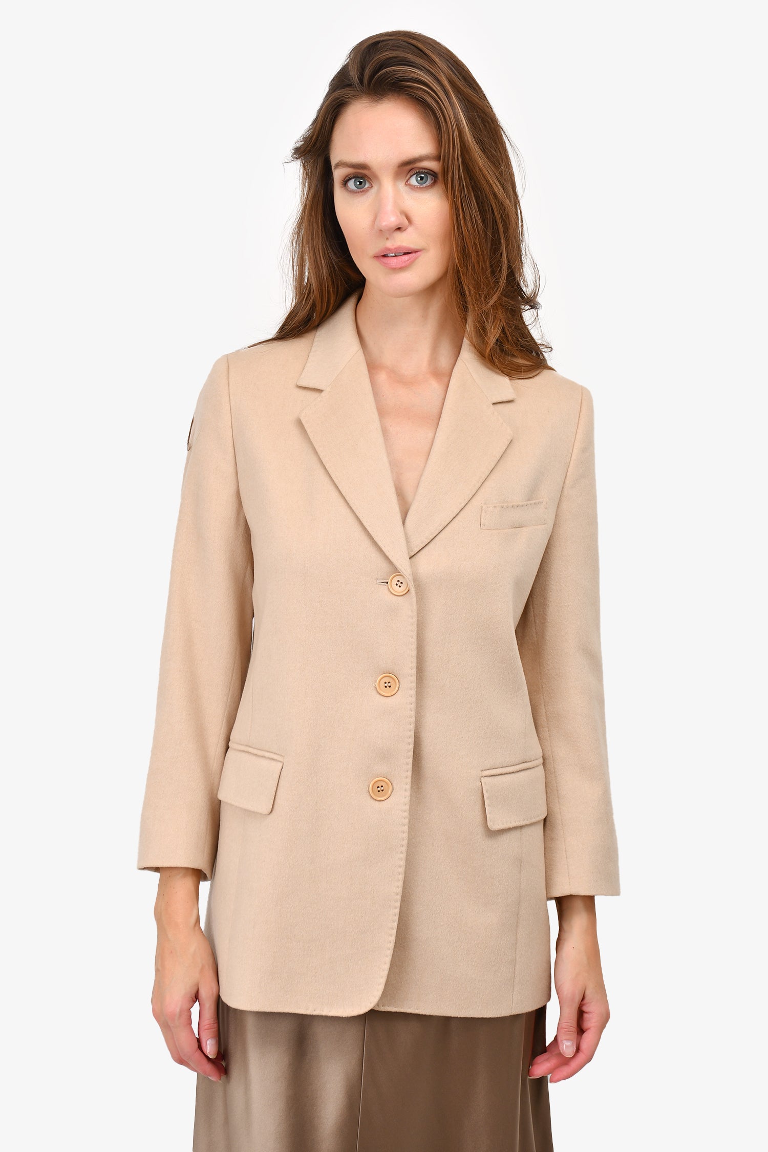 Refresh availabilityMax Mara Beige Camel Hair Blazer. Tonal stitching. Front button closure. Lined interior. 3 front welt pockets.