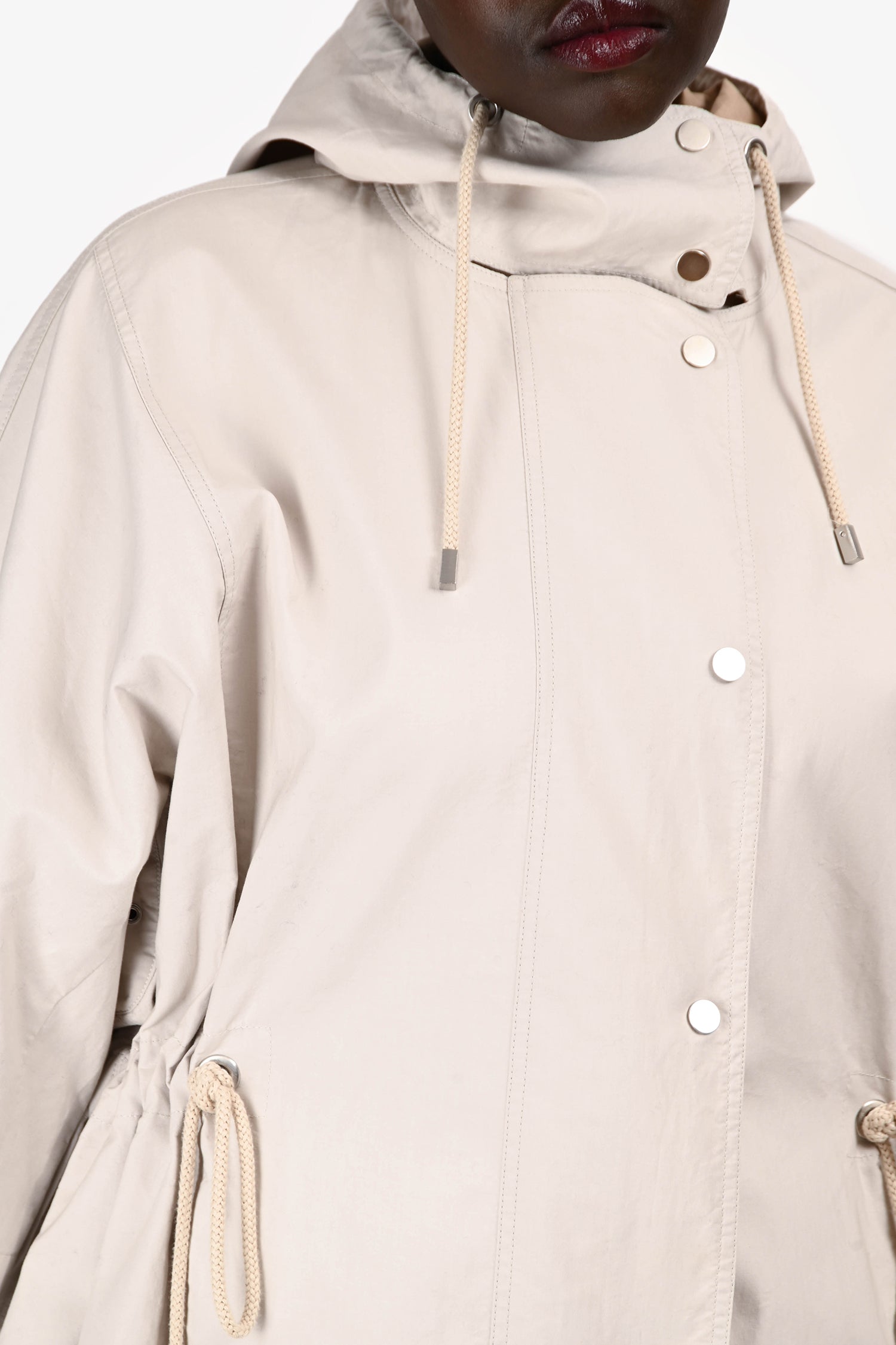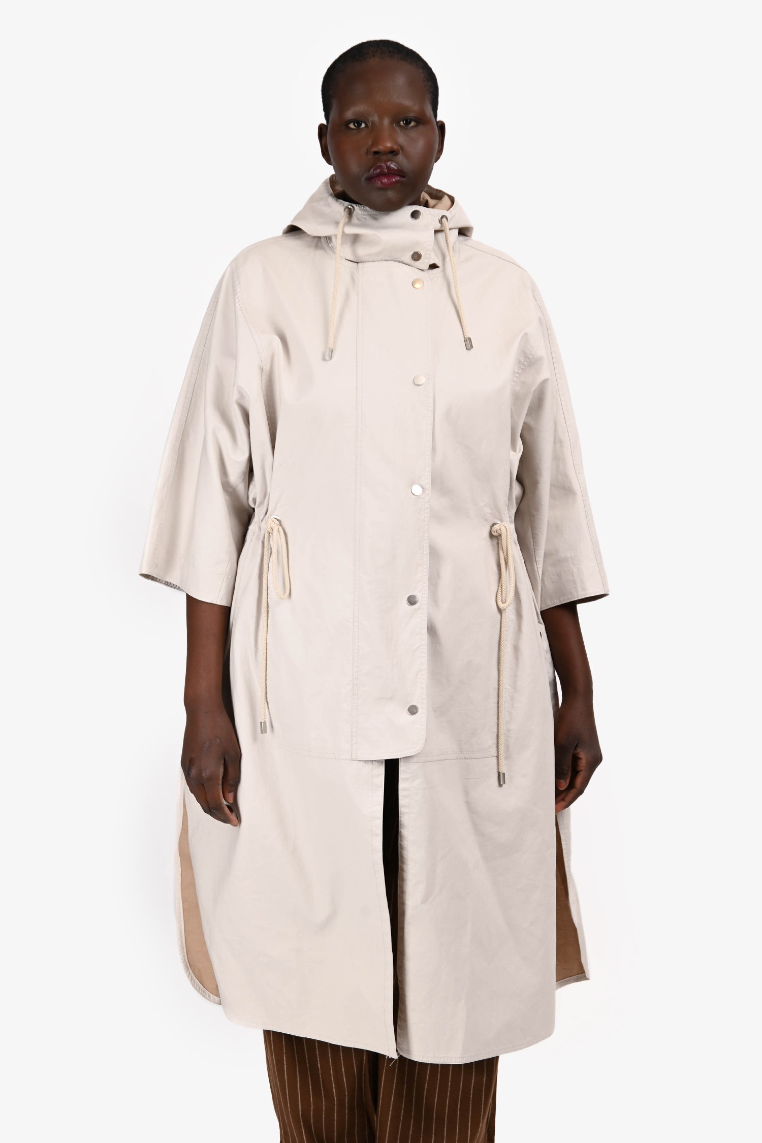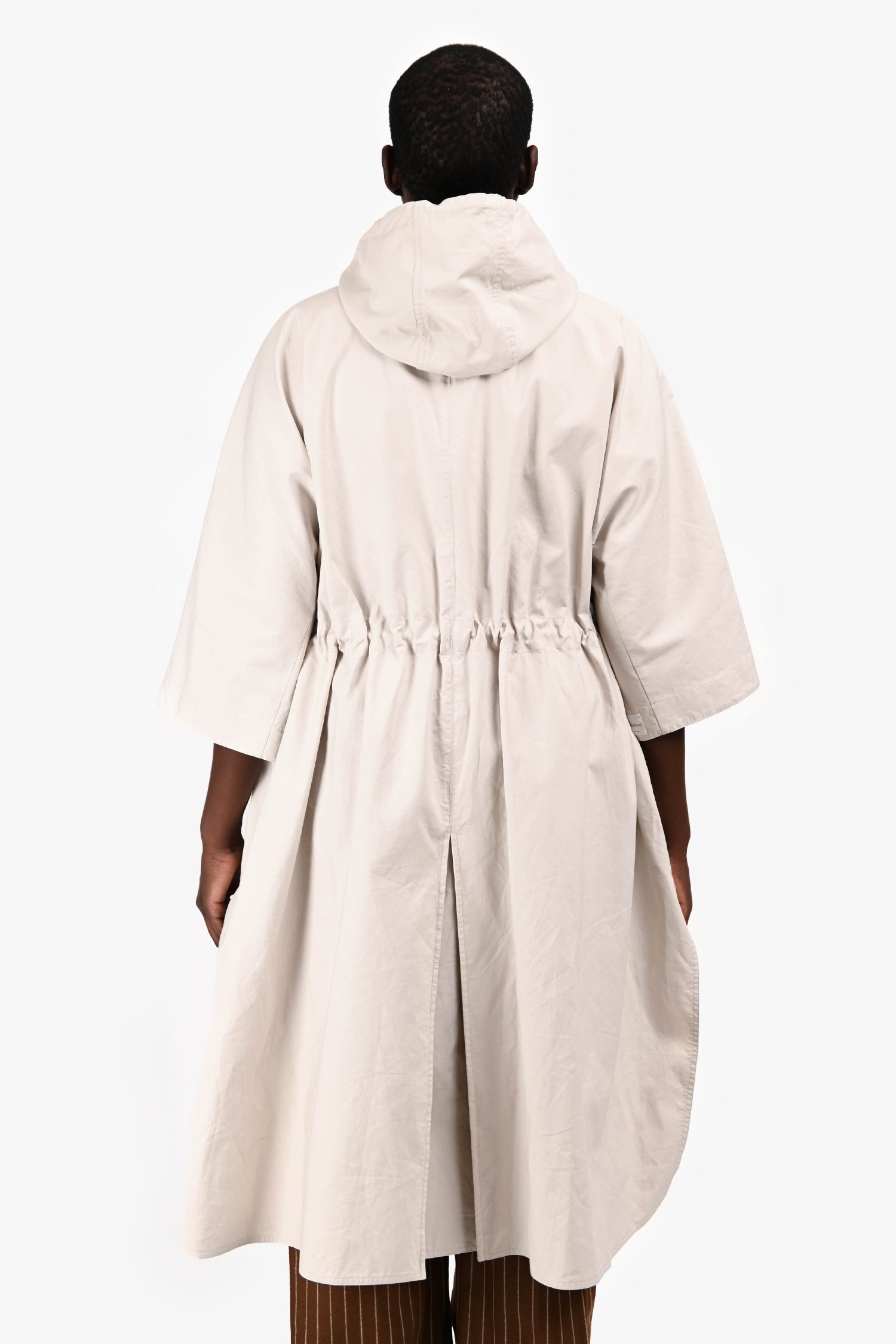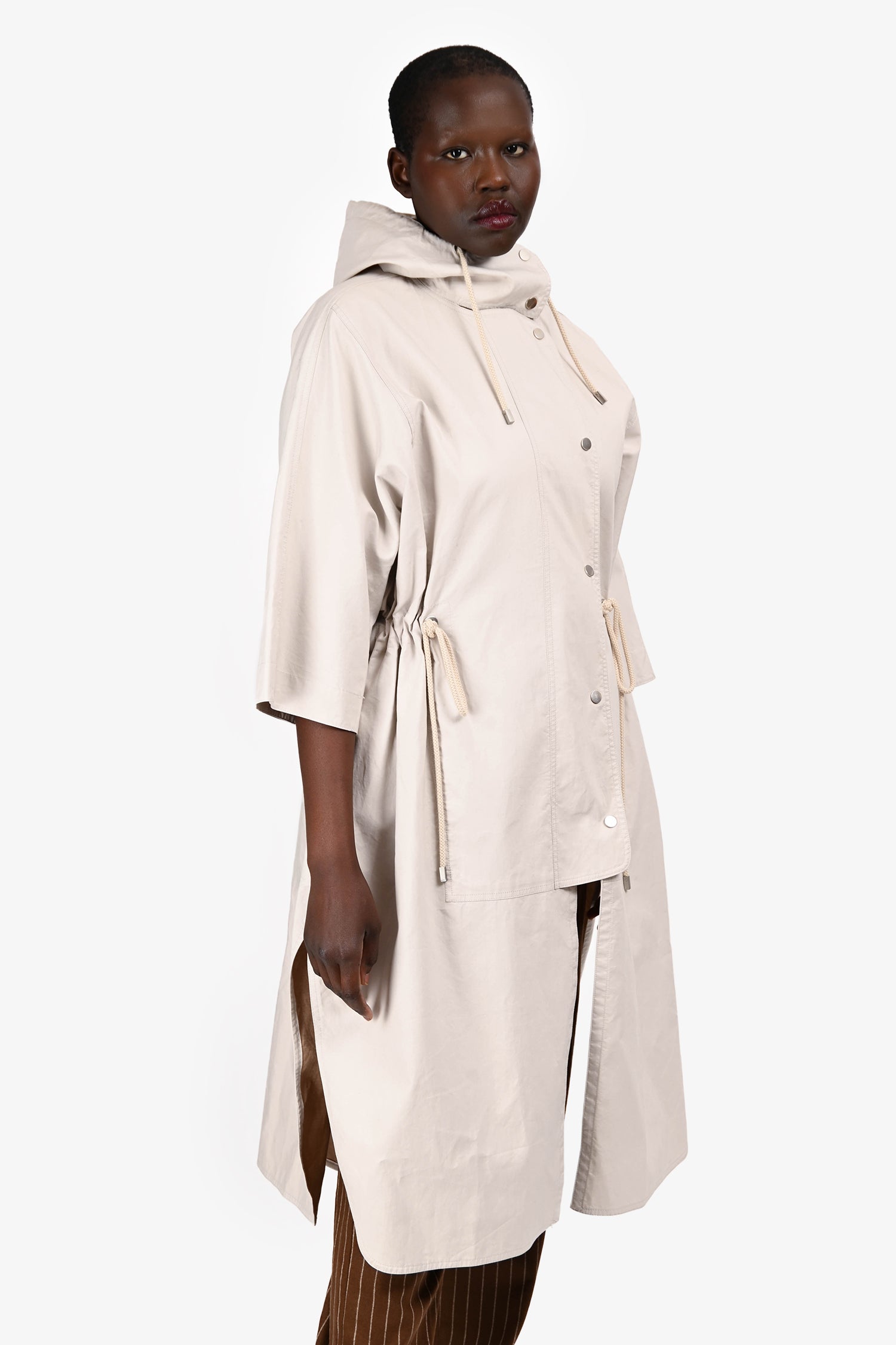 Refresh availabilityMax Mara Beige Cotton ‘The Cube’ Cinched Coat. Slip-on. Hooded neckline with drawstring. Front zip closure with snap placket. 2 exterior slip pockets with snap closures. Adjustable cinched waist. Unlined. Silver-tone hardware. Tonal stitching.