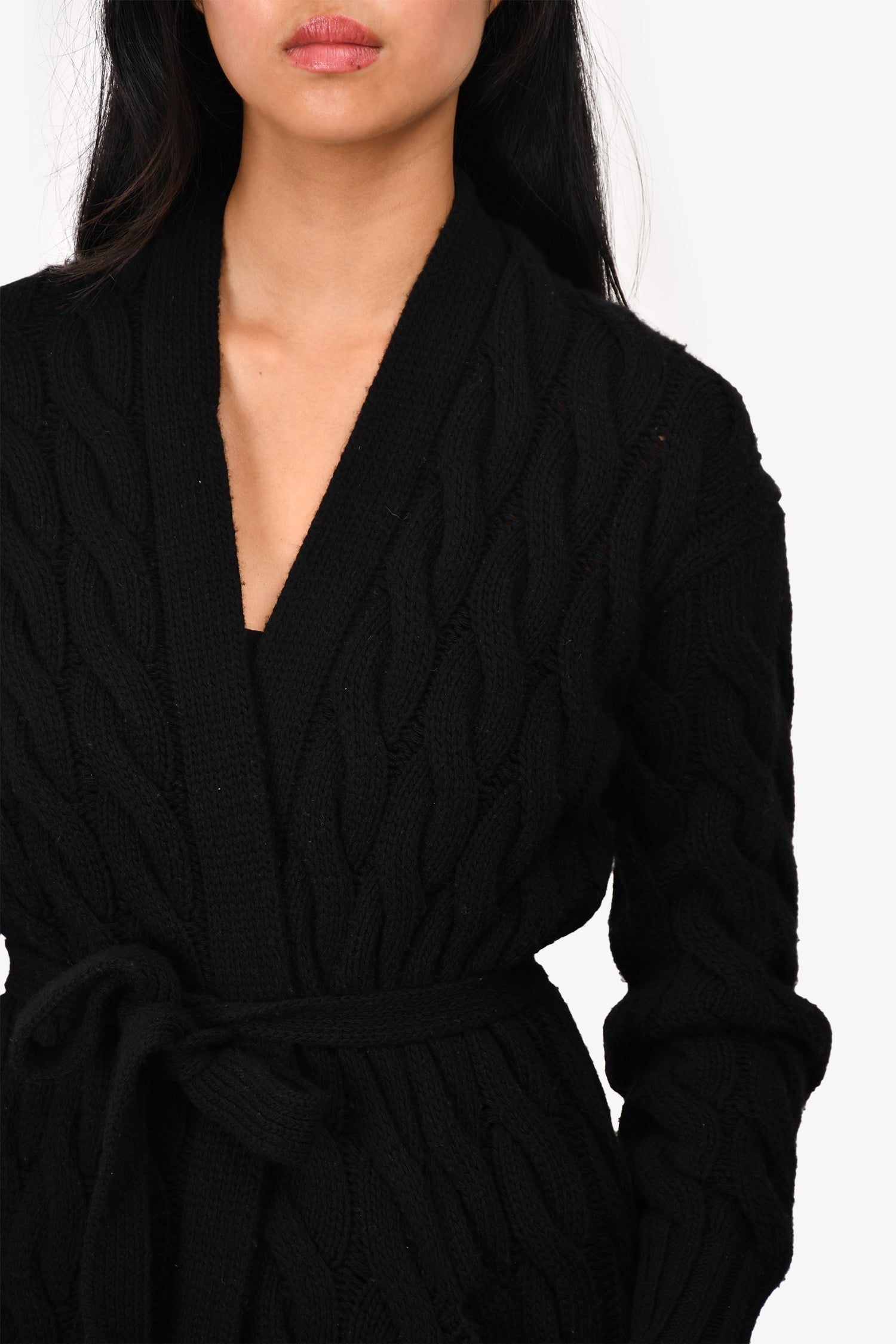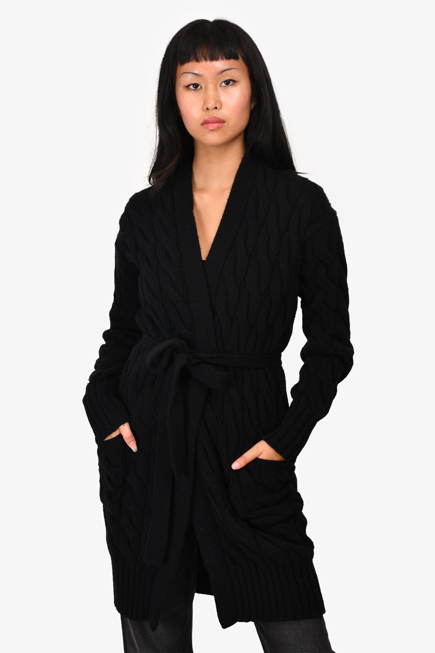Max Mara Black Cable Knit Wool/Cashmere Belted Cardigan Size S