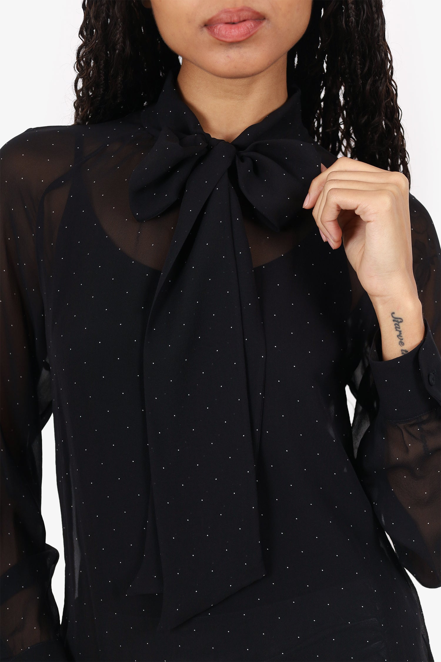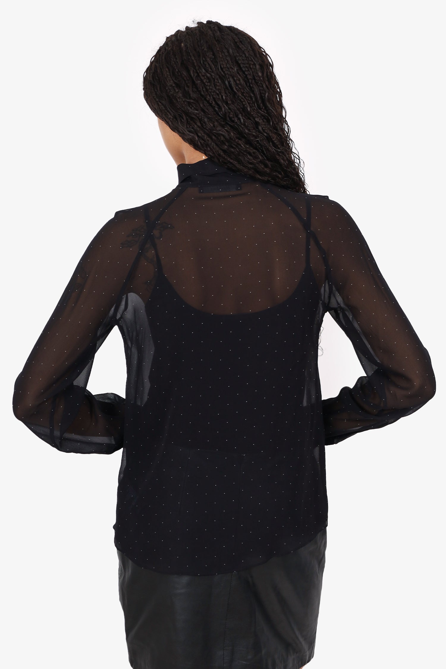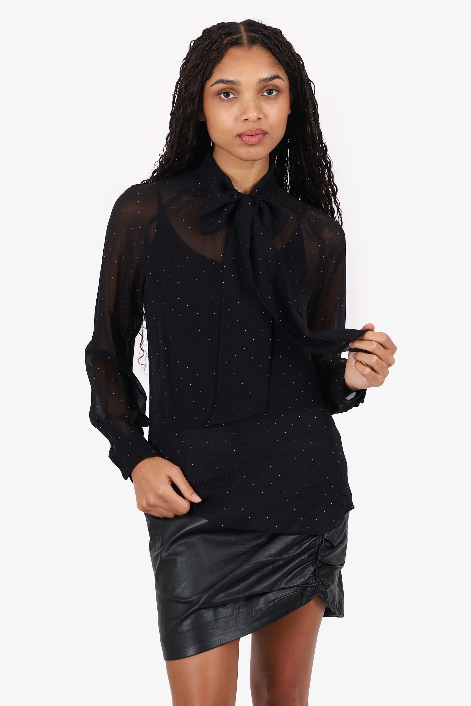 Refresh availabilityMax Mara Black Silk Polka Dot Tie Blouse With Slip. Pull-on. Mock-neckline with tie-up closure. Sleeve cuffs with button-up closure. Includes interior slip. Tonal stitching.