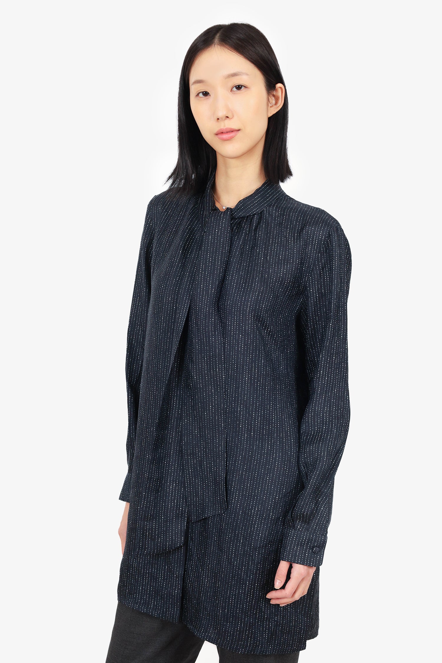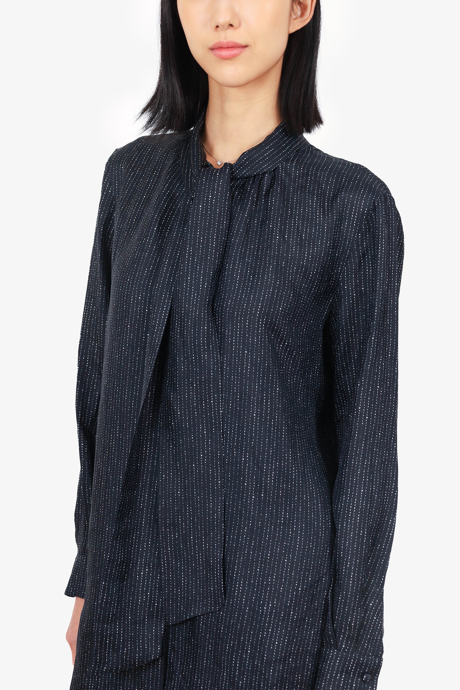 Refresh availabilityMax Mara Black Silk Striped Pussy Bow Blouse. Collared neckline with self-tie bow. Front and cuff button-up closure. Unlined. Tonal stitching.