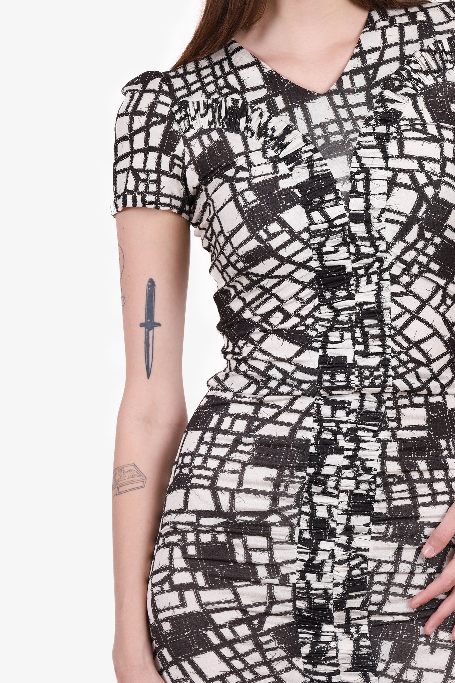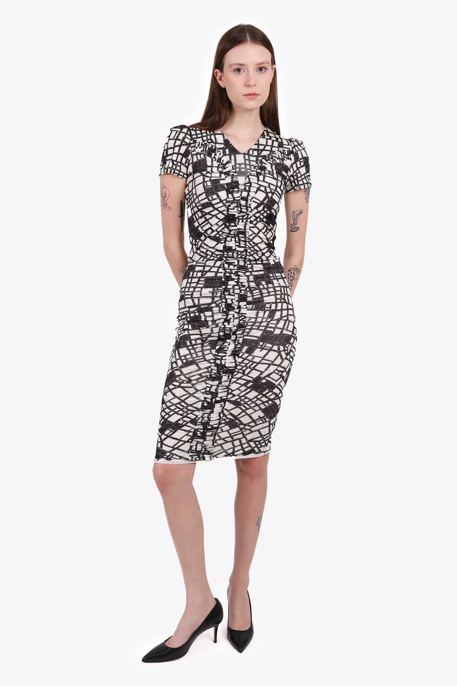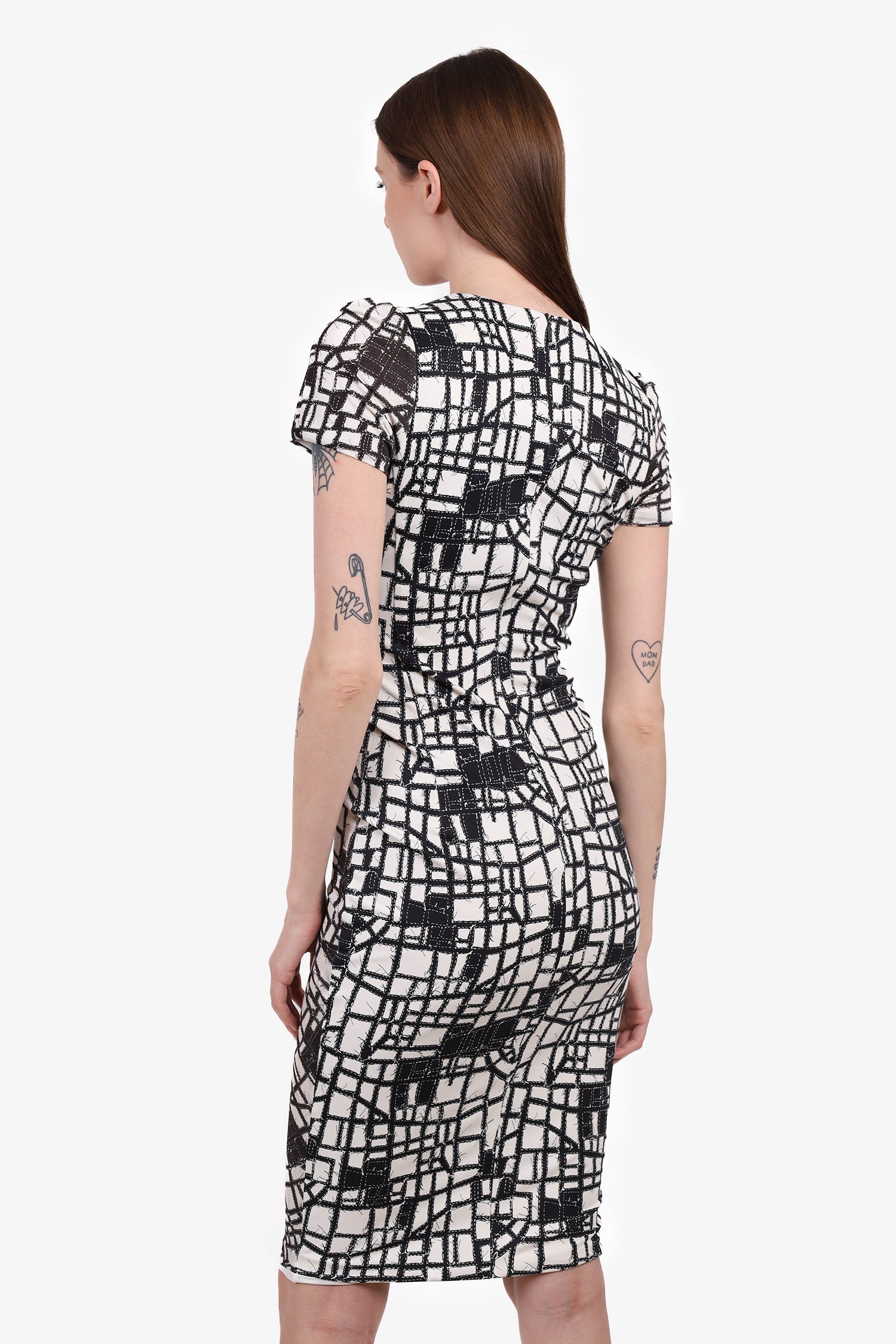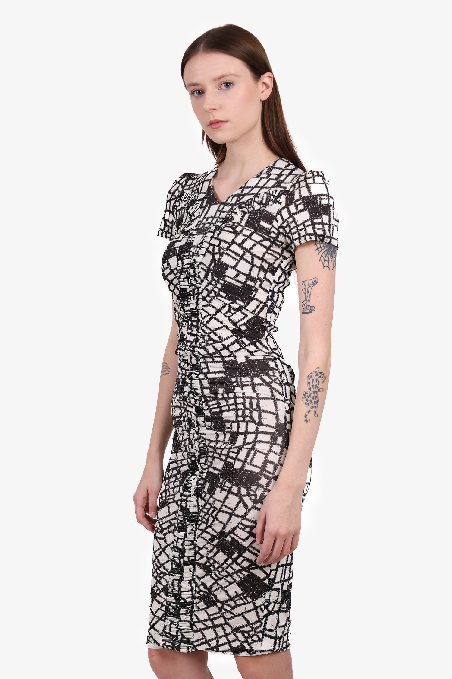 Refresh availabilityMax Mara Black/White Pattern Short Sleeve Dress With Ruching. Back zipper and hook closure. Lined. Tonal stitching. Subtle V-neck.