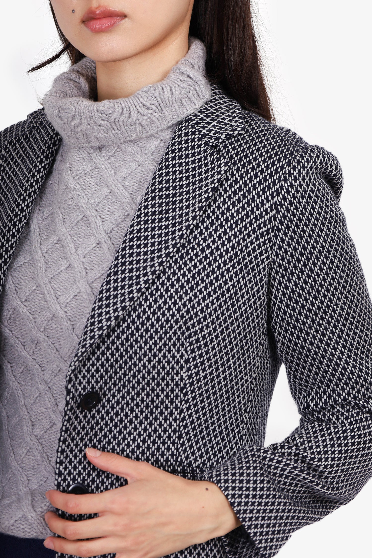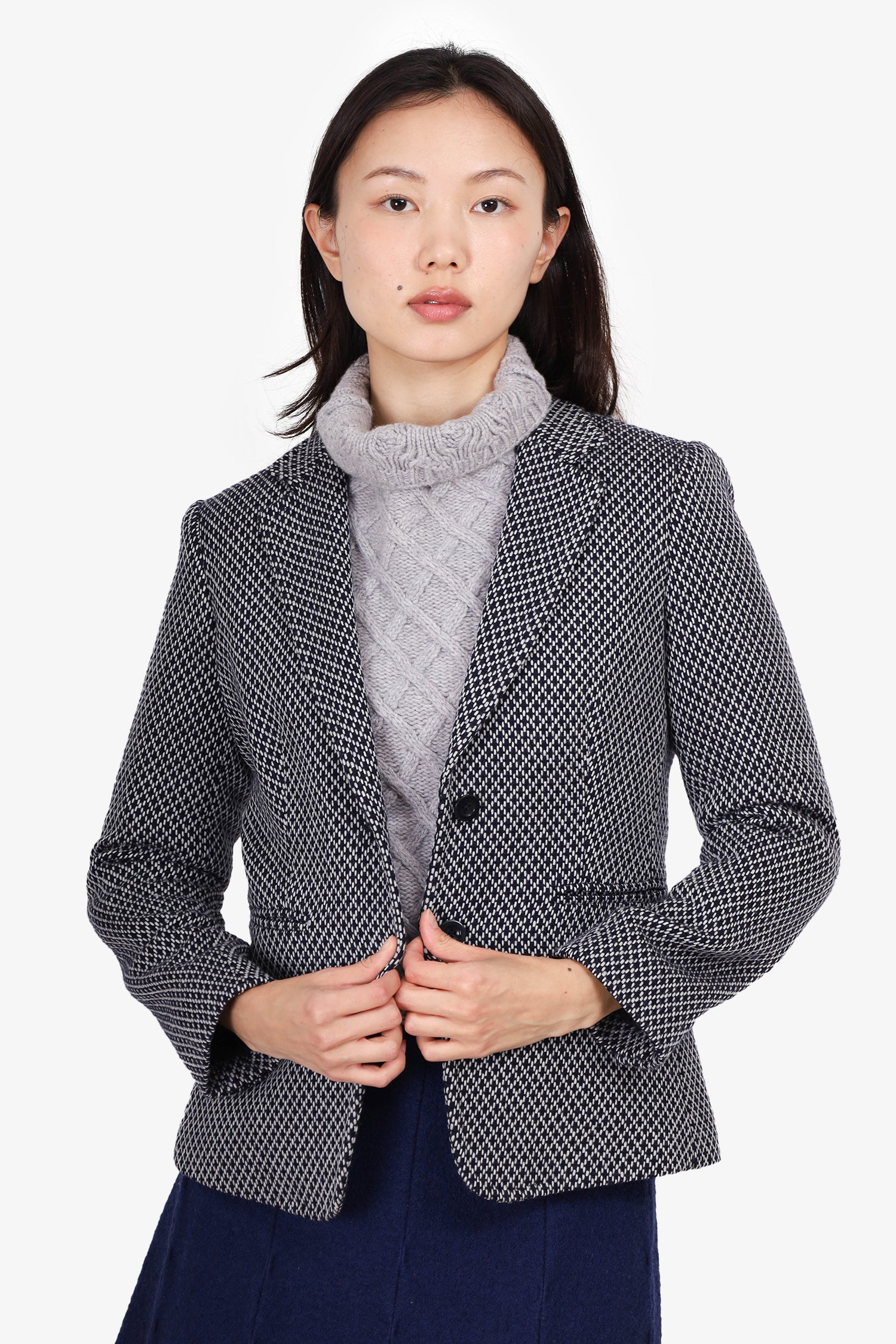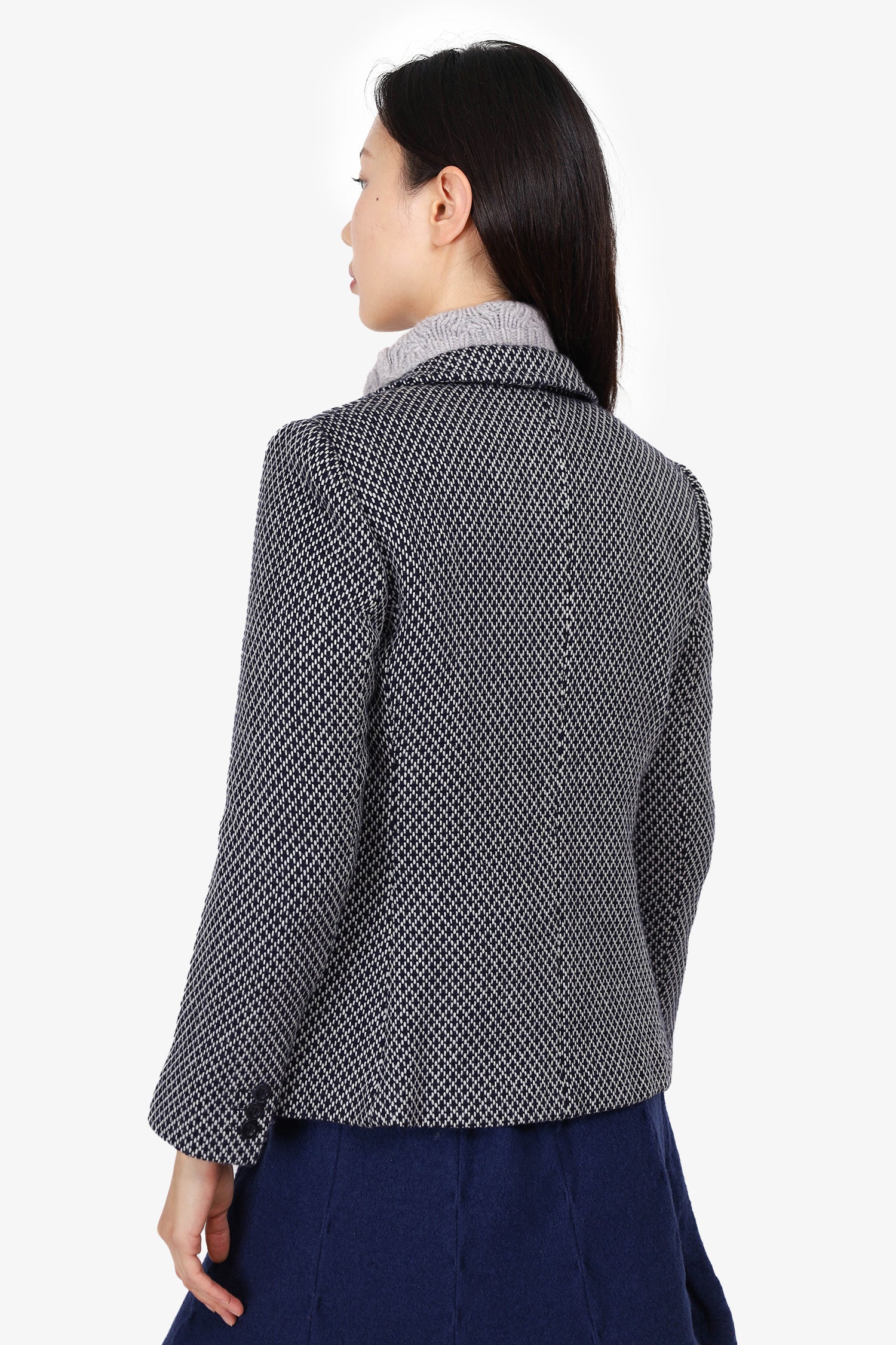 Refresh availabilityMax Mara Black/White Wool Printed Blazer. Collared v-neckline. Double button-up closure on front. 2 slip pockets on front. 3 button-up closure on sleeve cuffs. Partially lined. Tonal stitching.