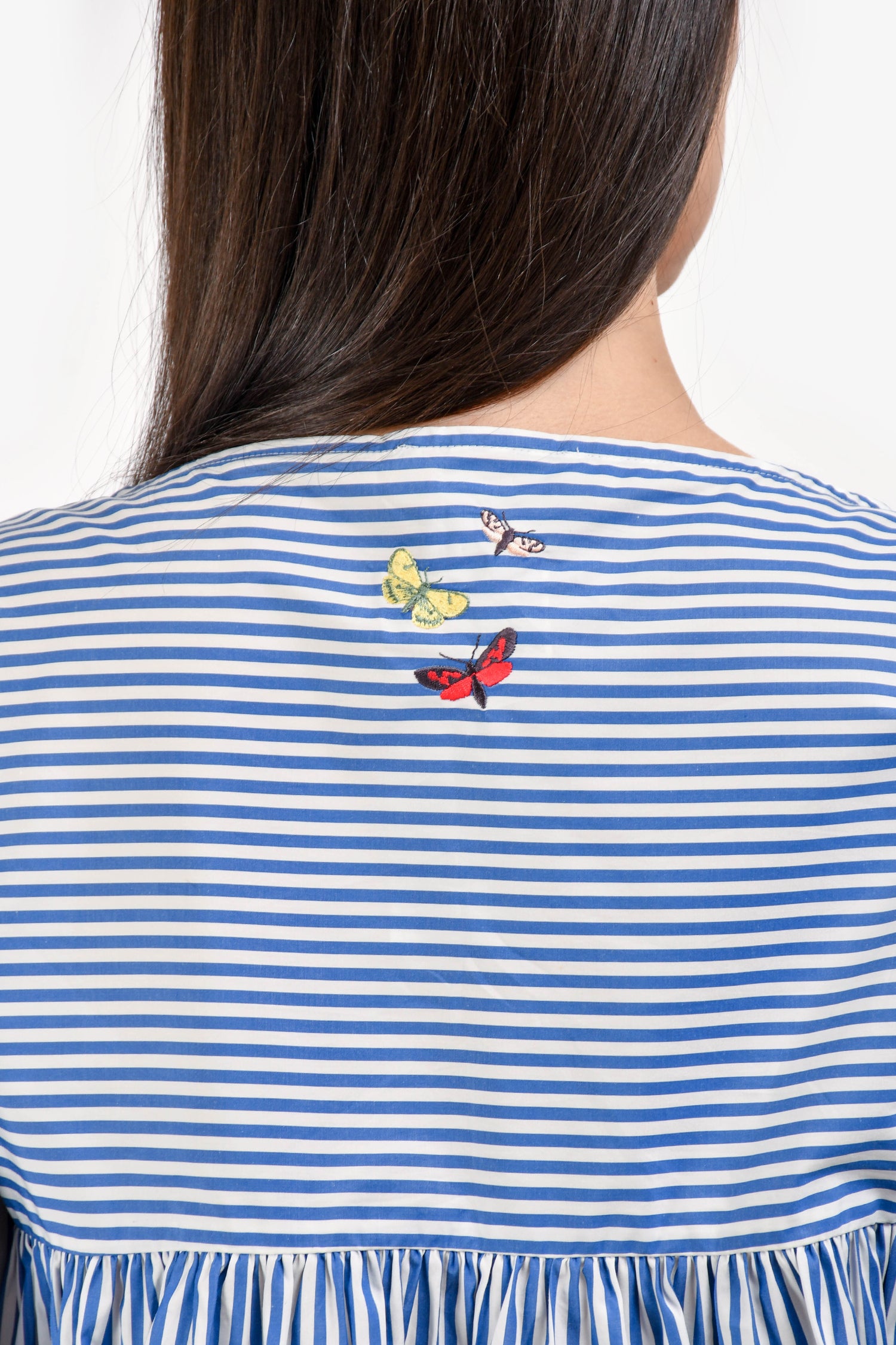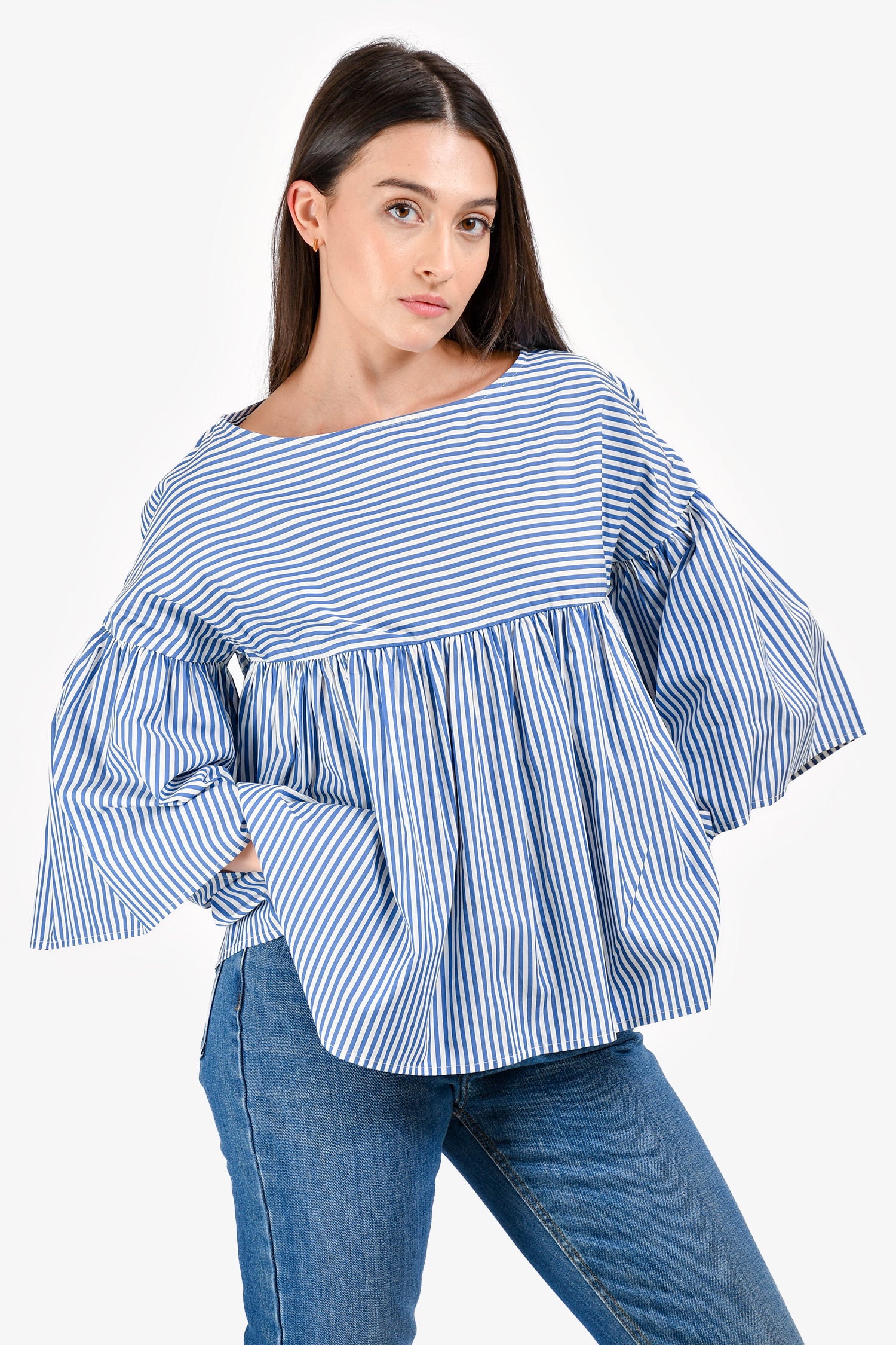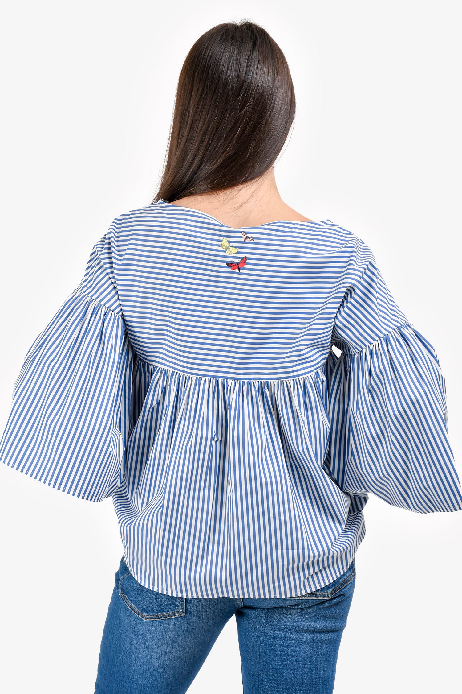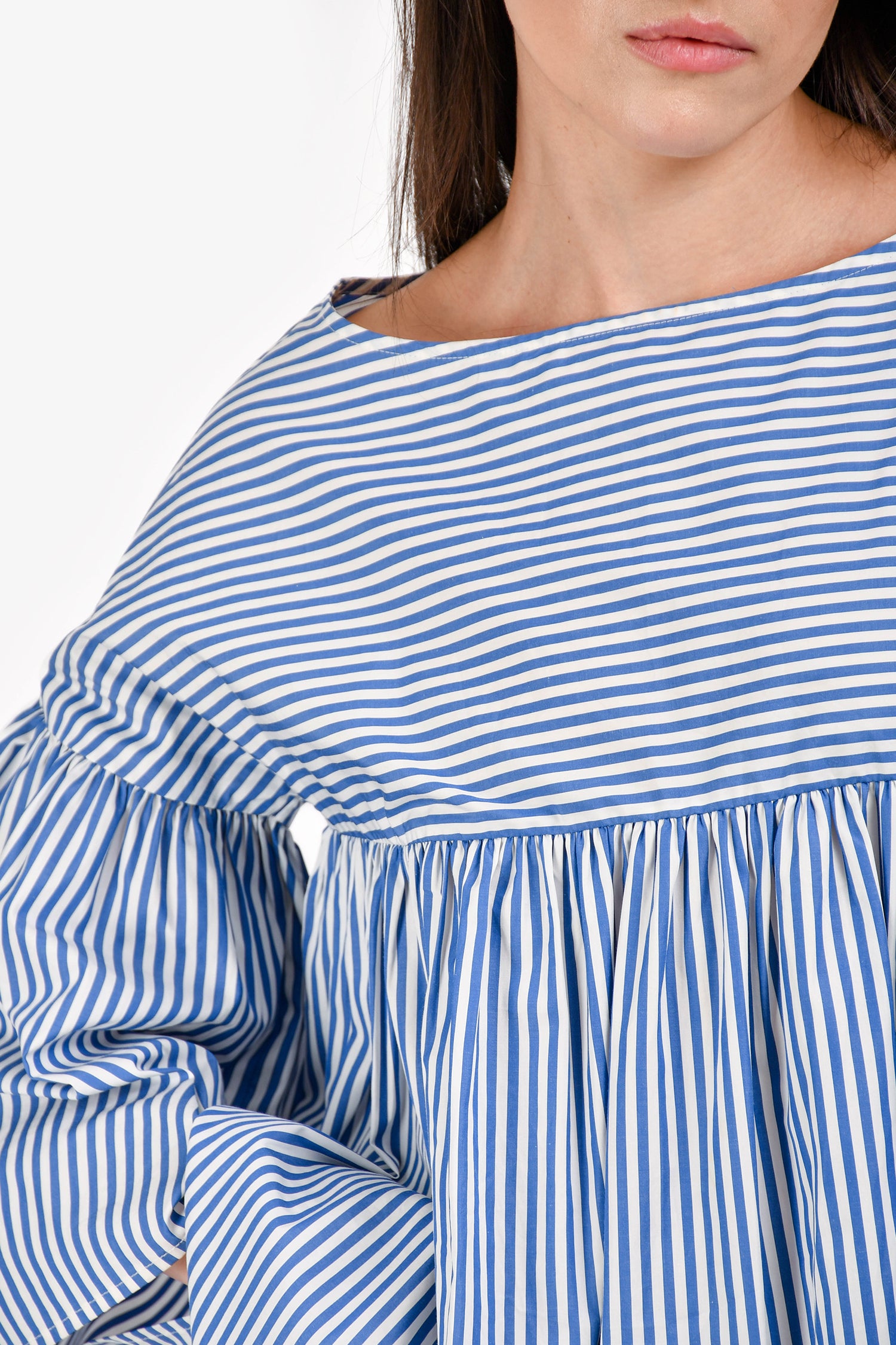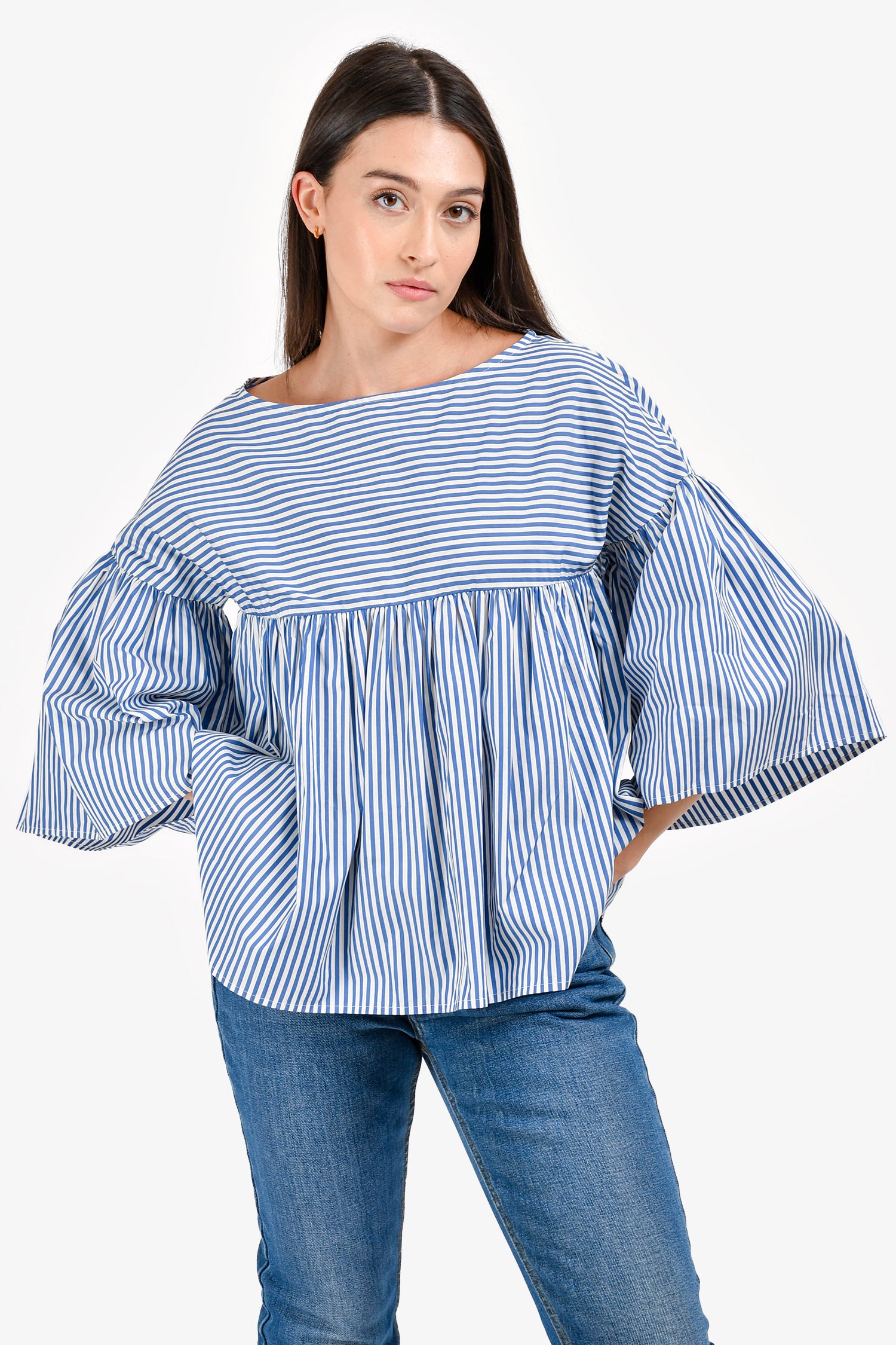 Refresh availabilityMax Mara Blue/White Stripe 3/4 Length Sleeve Top. Boat neckline. Pull-on style. Tonal stitching.