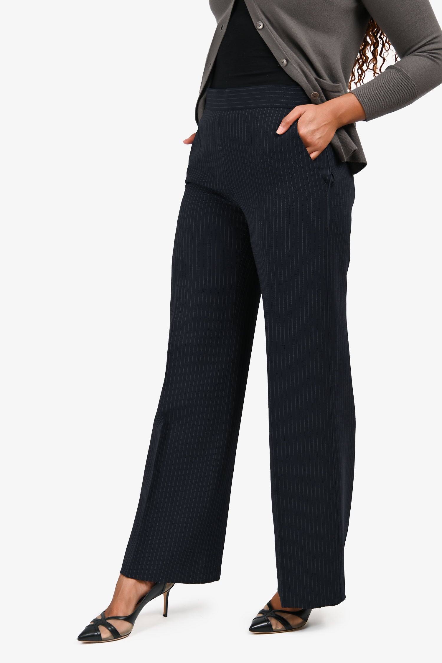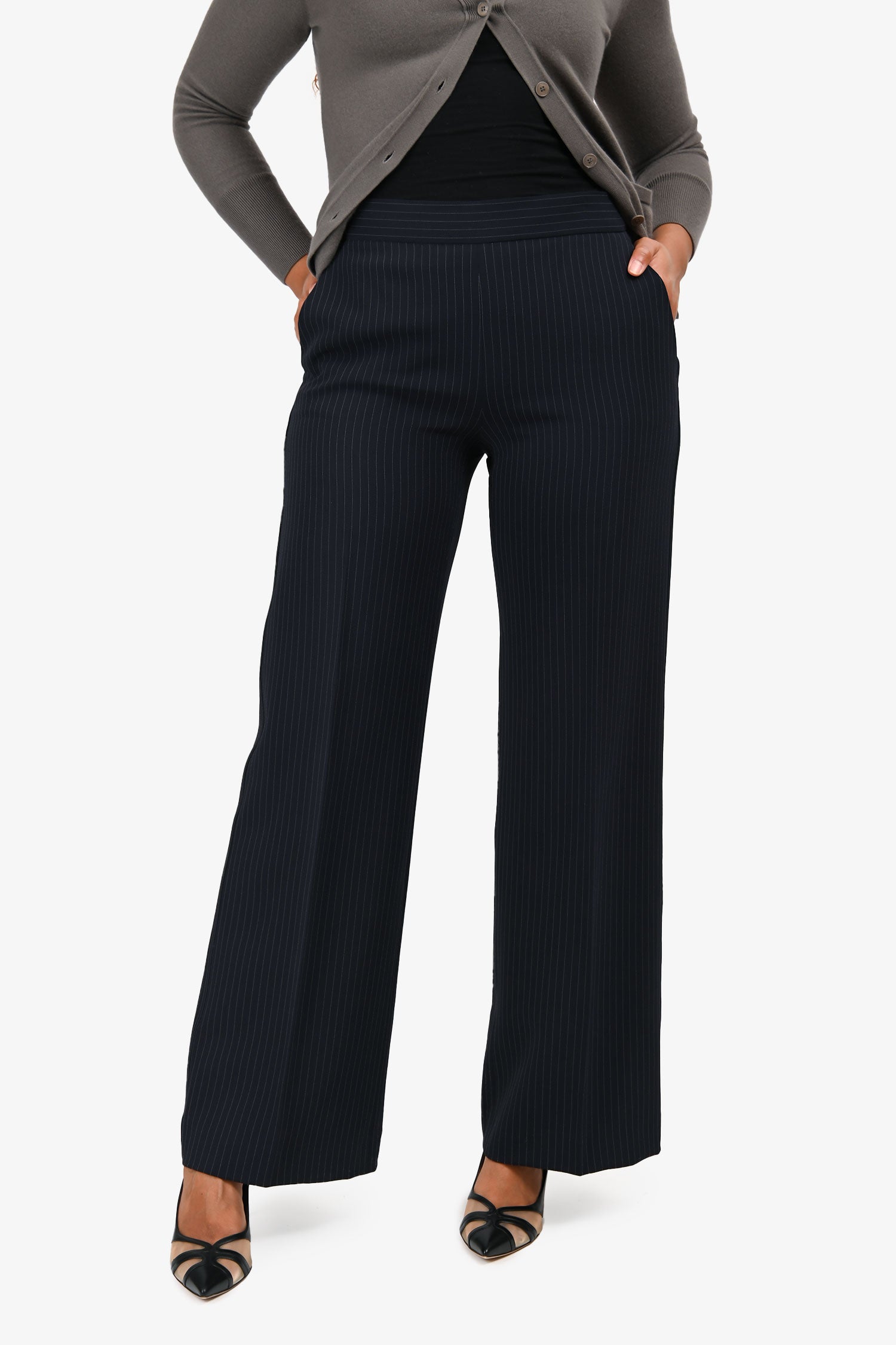 Refresh availabilityMax Mara Navy Pinstripe Wide Leg Trousers. Pull-on. Side zip closure. 2 slip pockets. Tonal stitching.