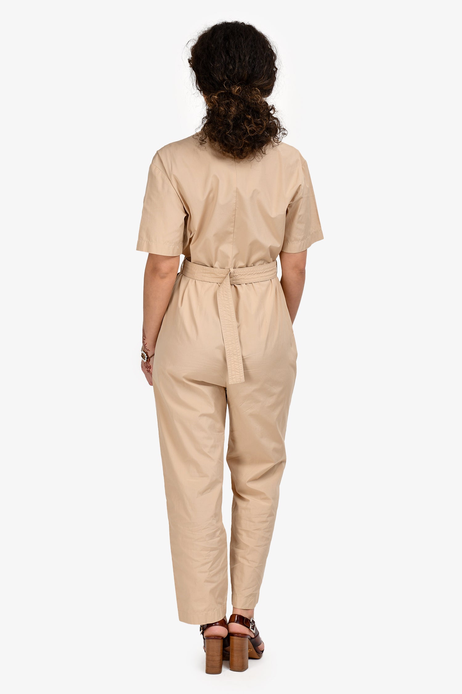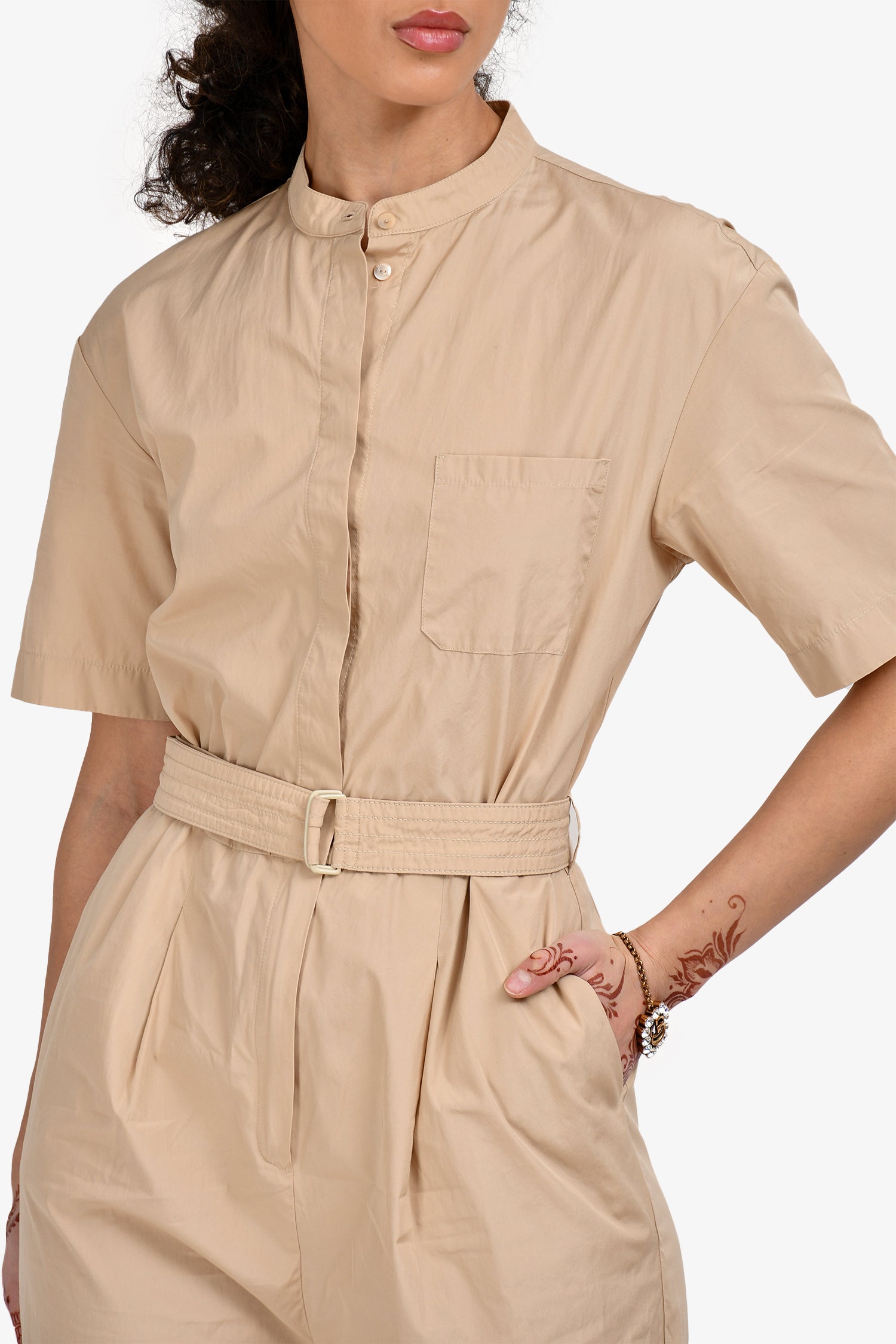 Refresh availabilityMax Mara Studio Cream Cotton Short Sleeve Belted Jumpsuit. Front button-down closure and zip closure. Waist belt with buckle closure. 3 front slip pockets. Unlined. Tonal stitching.