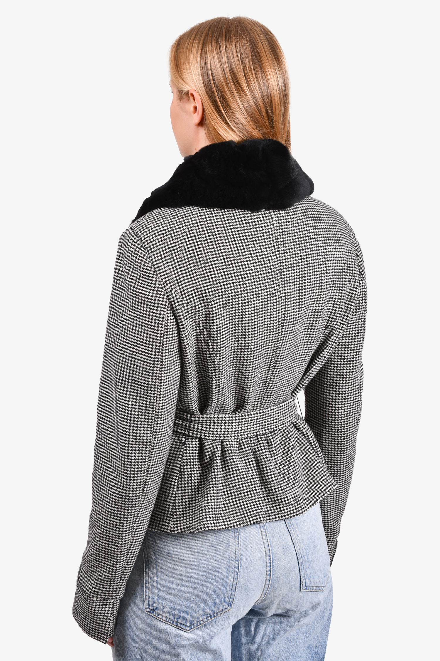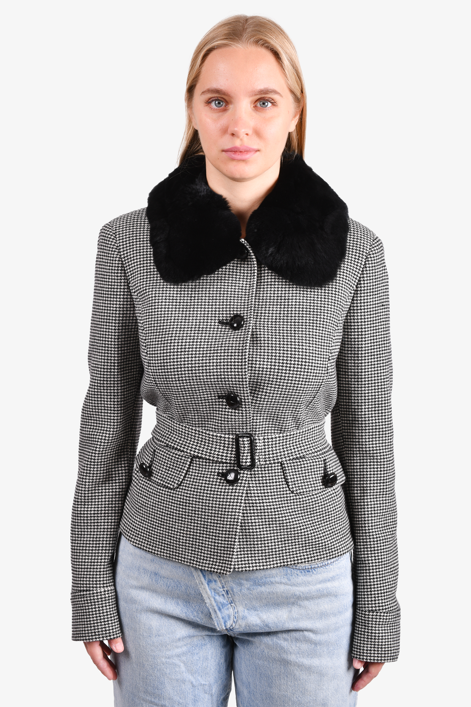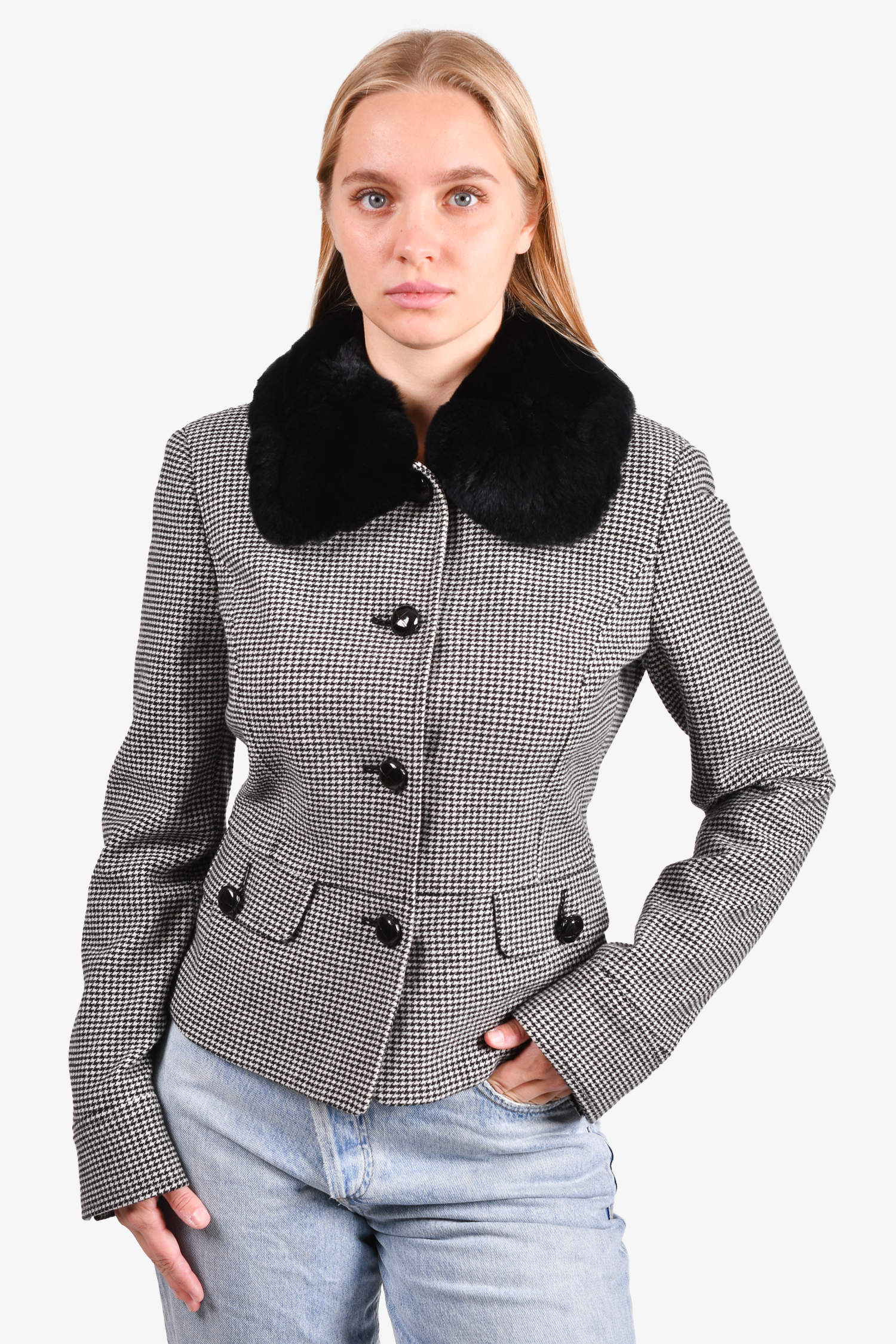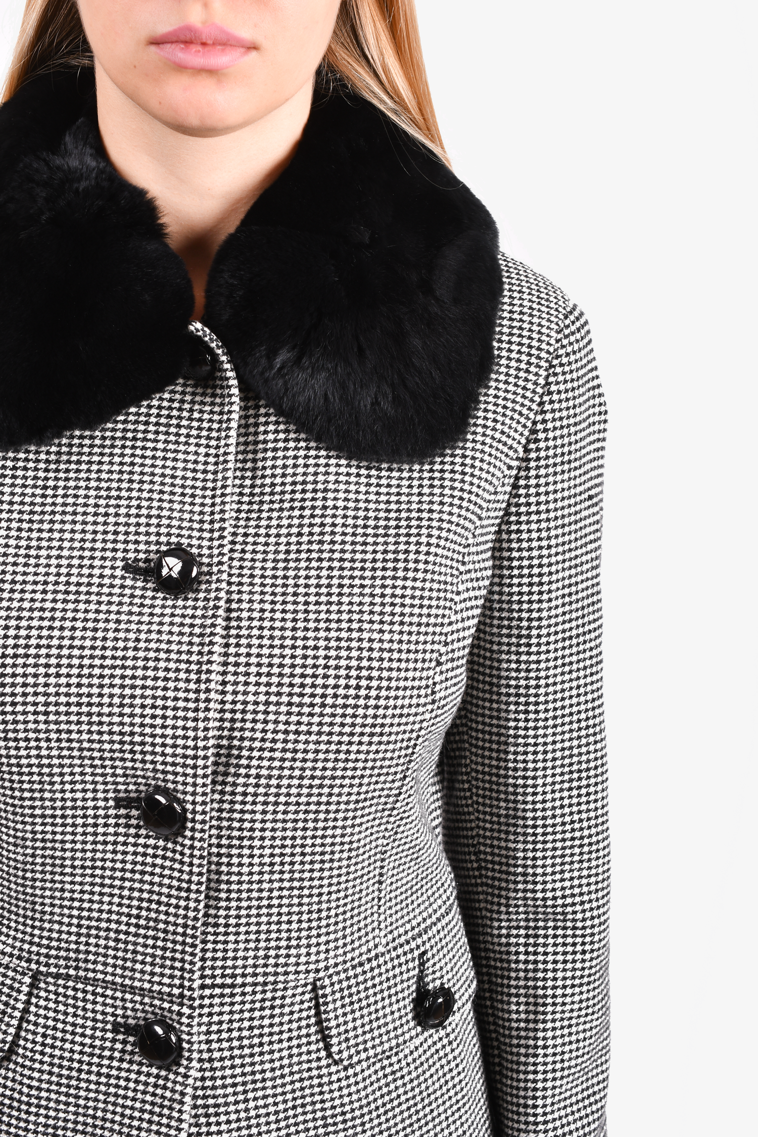 Refresh availabilityMax Mara Weekend Black/White Houndstooth Jacket. Front button-up closure. Front pockets with button closure. Lined. Removable fur collar. Tonal stitching.