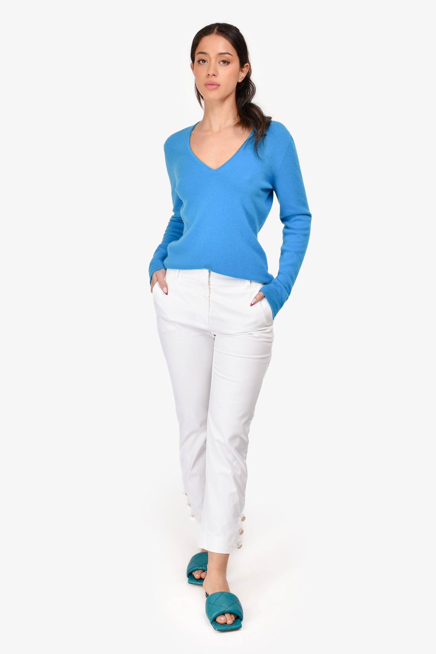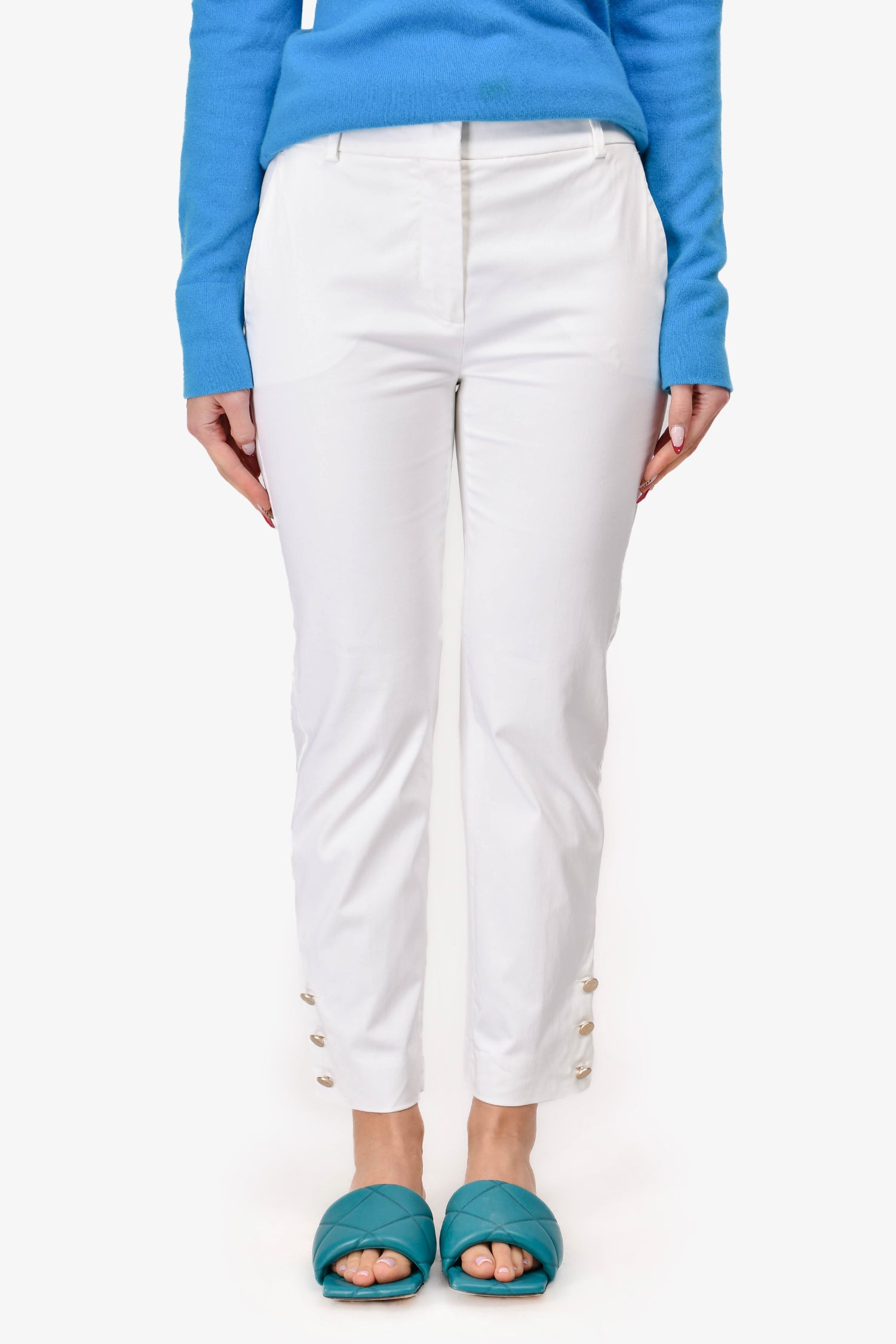 Refresh availabilityMax Mara White Cotton Slim Pants. Front fly hook closure with zipper. Two front pockets. Button detailing at the hem. Silver-tone hardware. Tonal stitching.