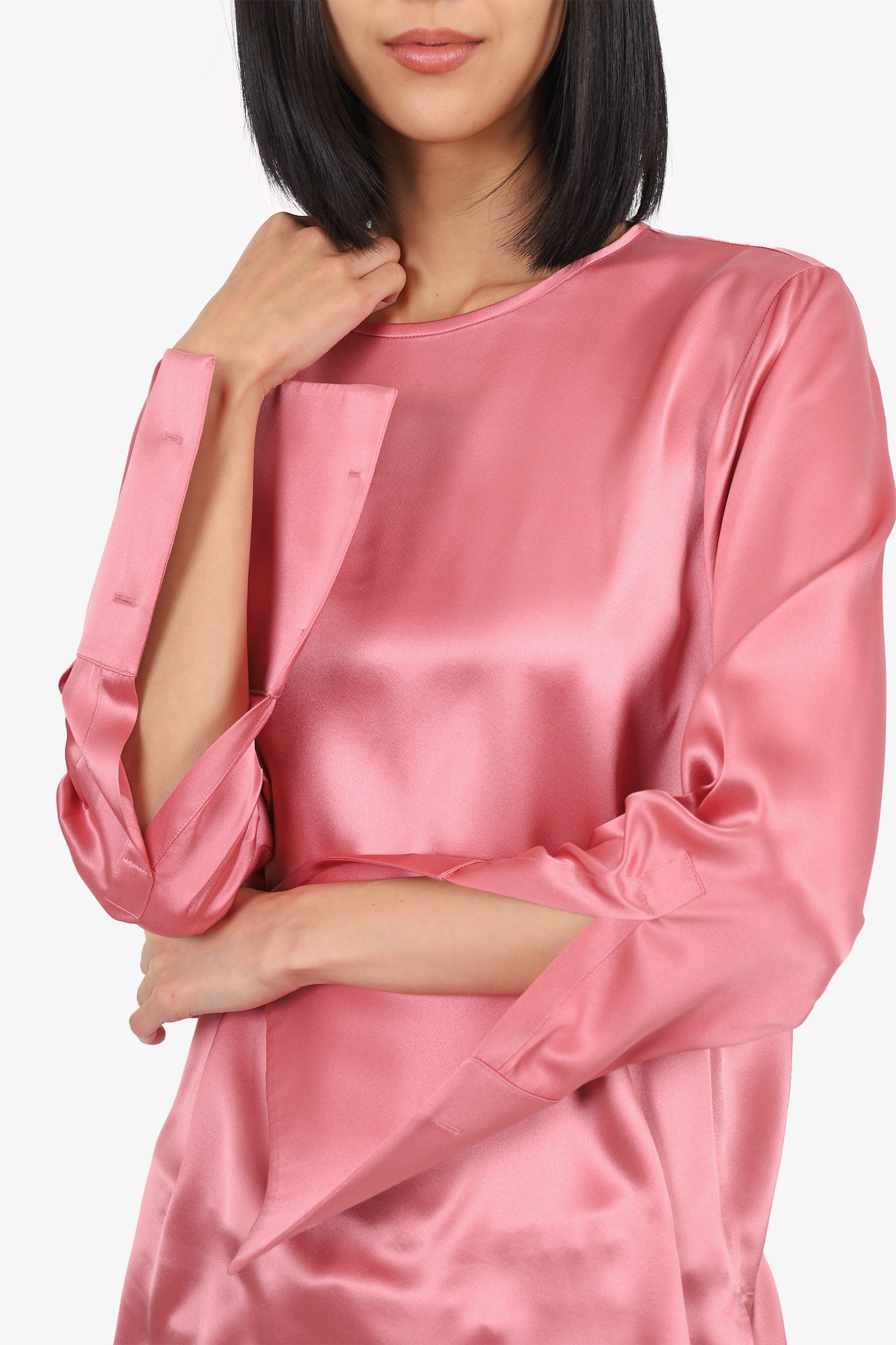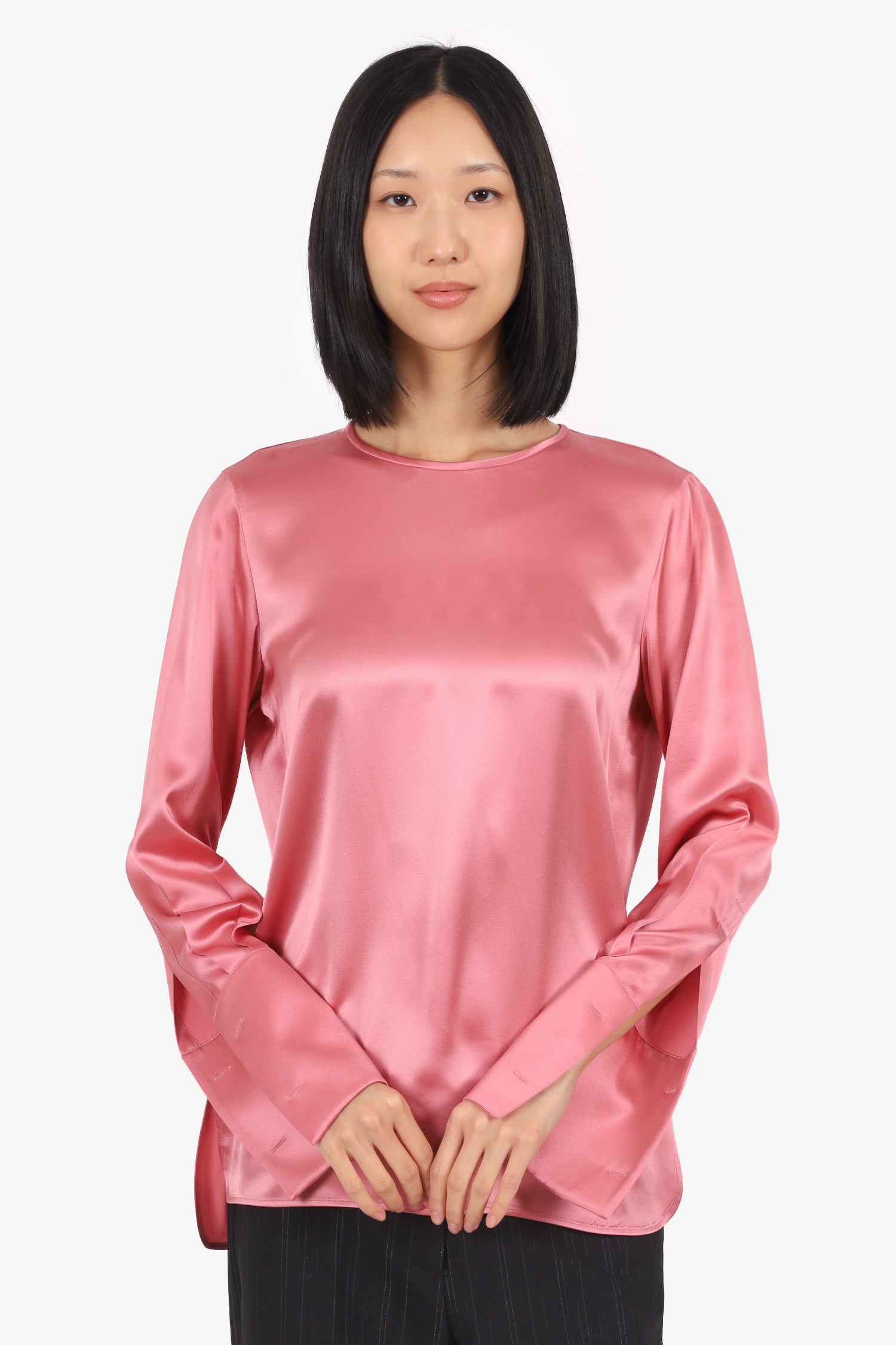 Refresh availabilityMaxMara Pink Silk Blouse. Pull-on. Round neckline. Rear keyhole with button-up closure. Slits at sleeve cuffs and bottom sides. Tonal stitching.