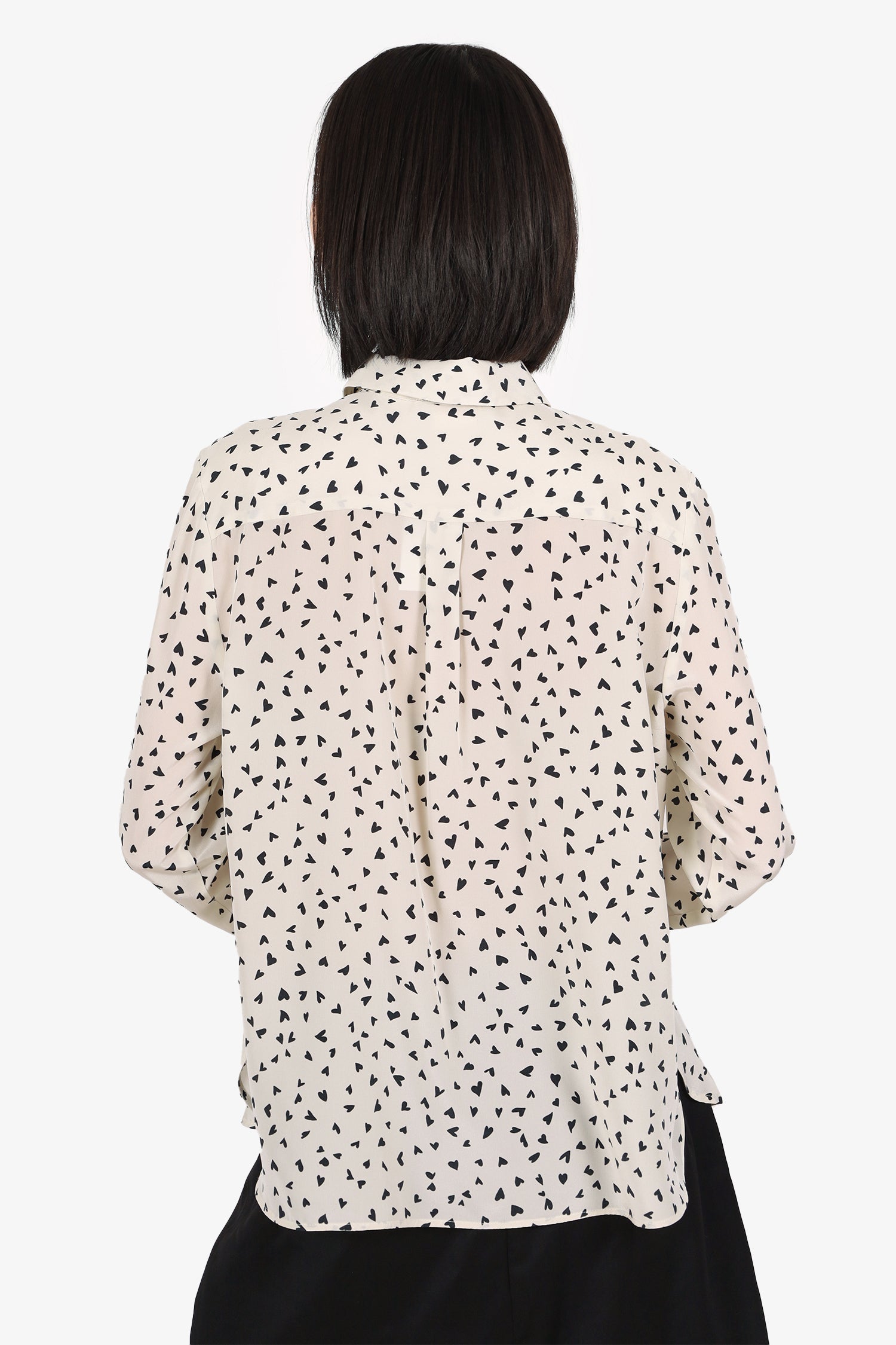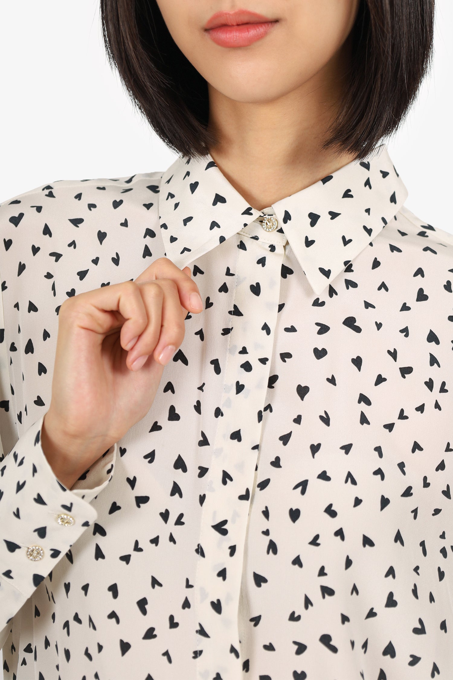 Refresh availabilityMaxMara Studio Silk Cream/Black Heart Printed Button Up Blouse. Pull-on. Collared-neckline. Front button-up closure. Sleeve cuffs with button-up closure. Gold-tone hardware. Tonal stitching.