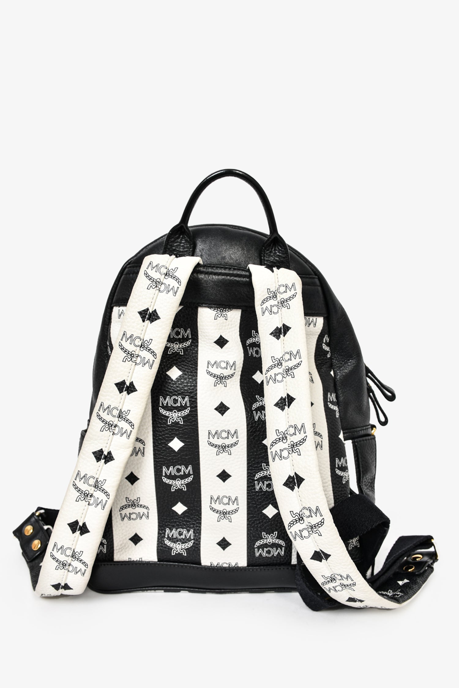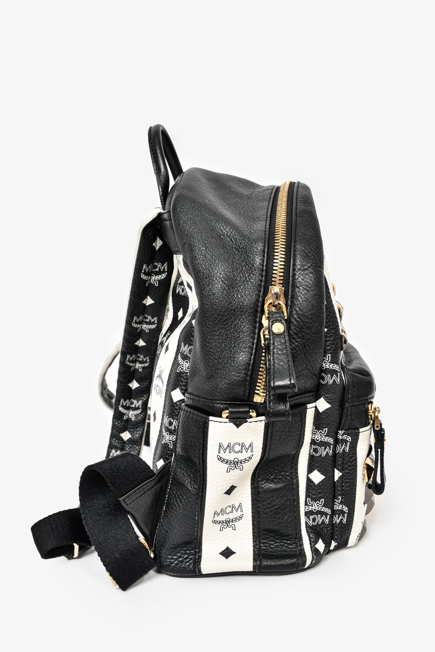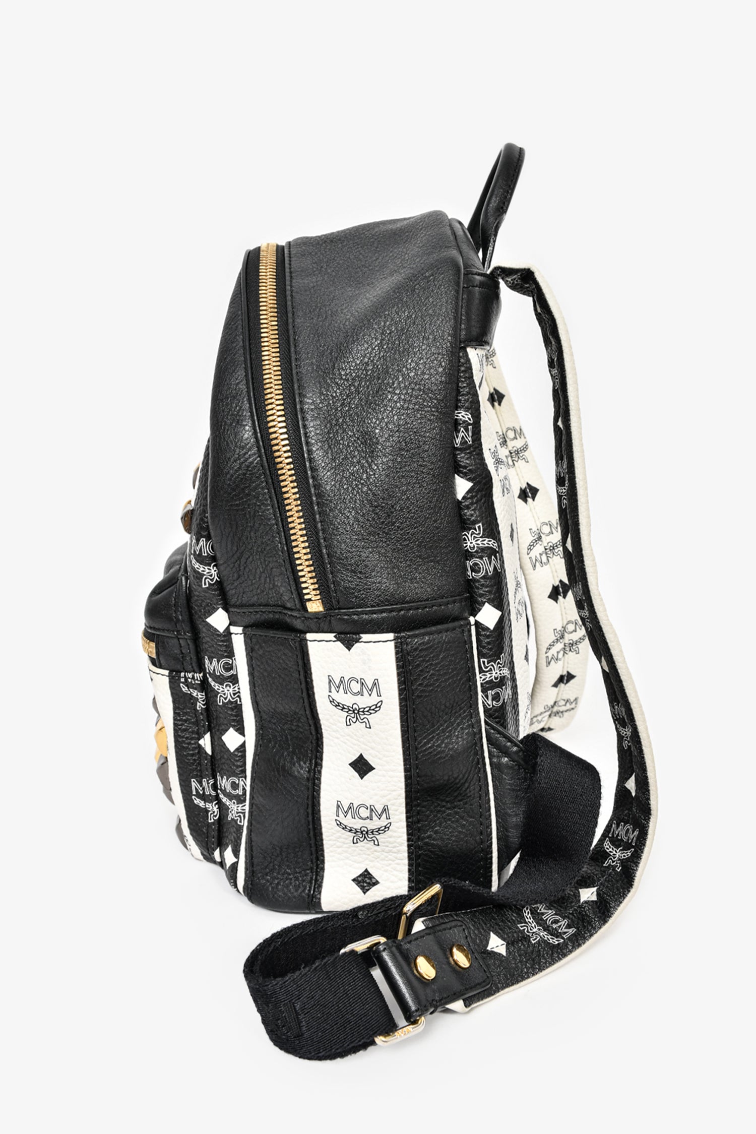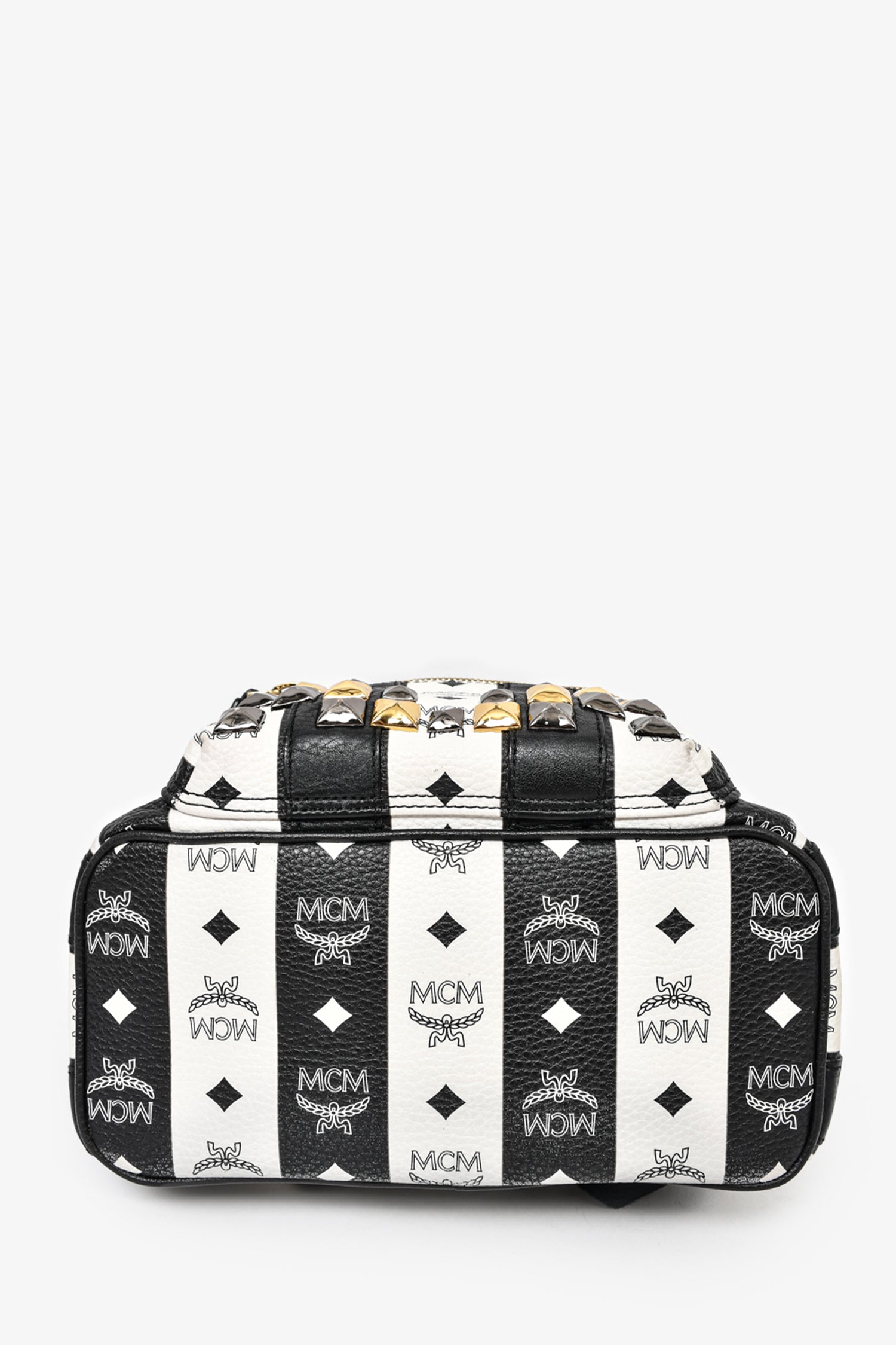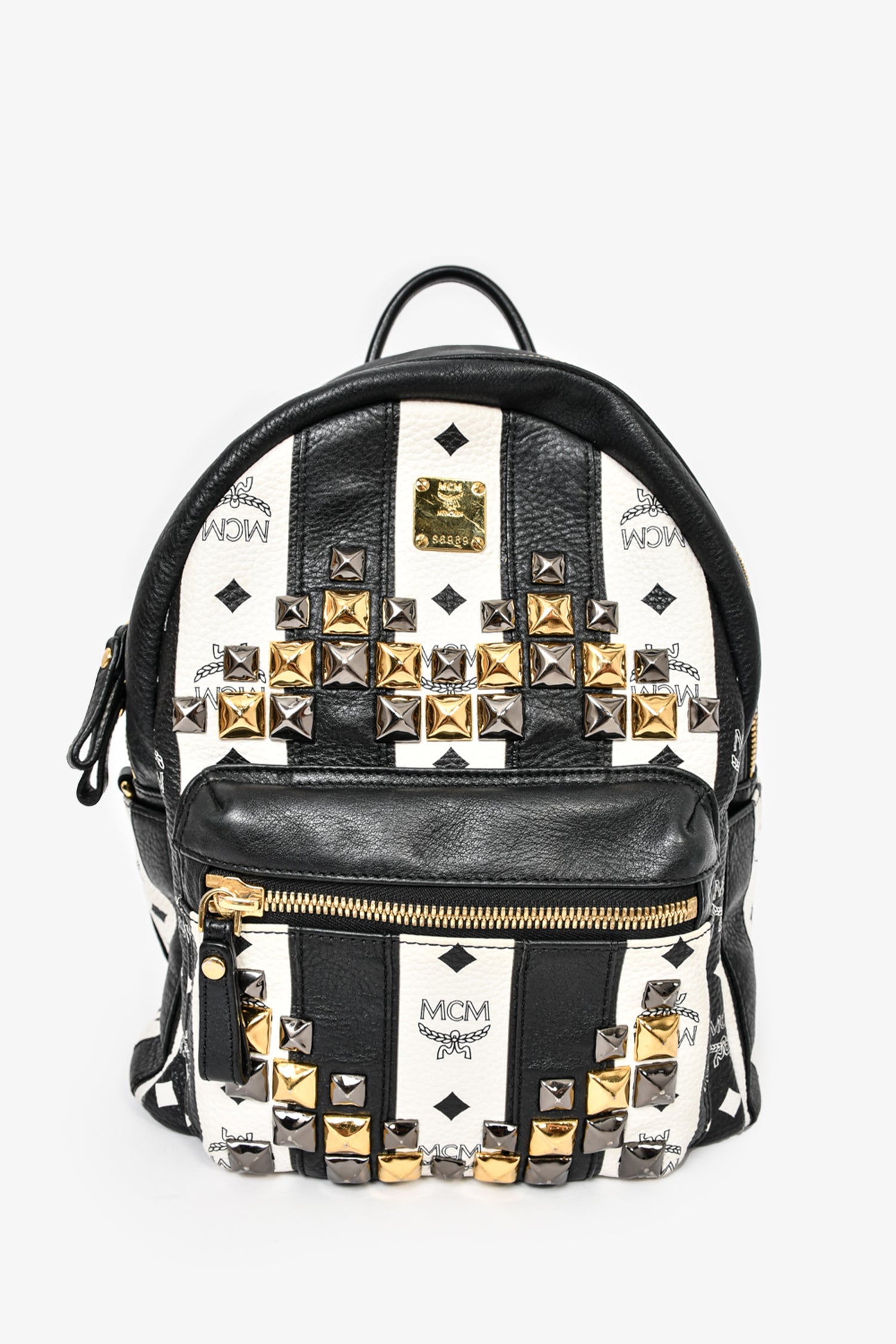Refresh availabilityMCM Black/White Leather Striped Studded Backpack. Front zip pocket. Front zip closure. Single rolled top handle. Black textile interior lining. 4 interior pockets; 3 slip and 1 with zip closure. Adjustable straps. Gold-tone hardware. Tonal stitching.