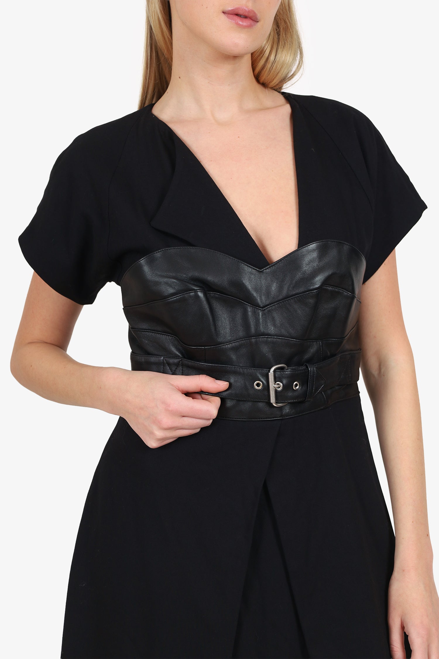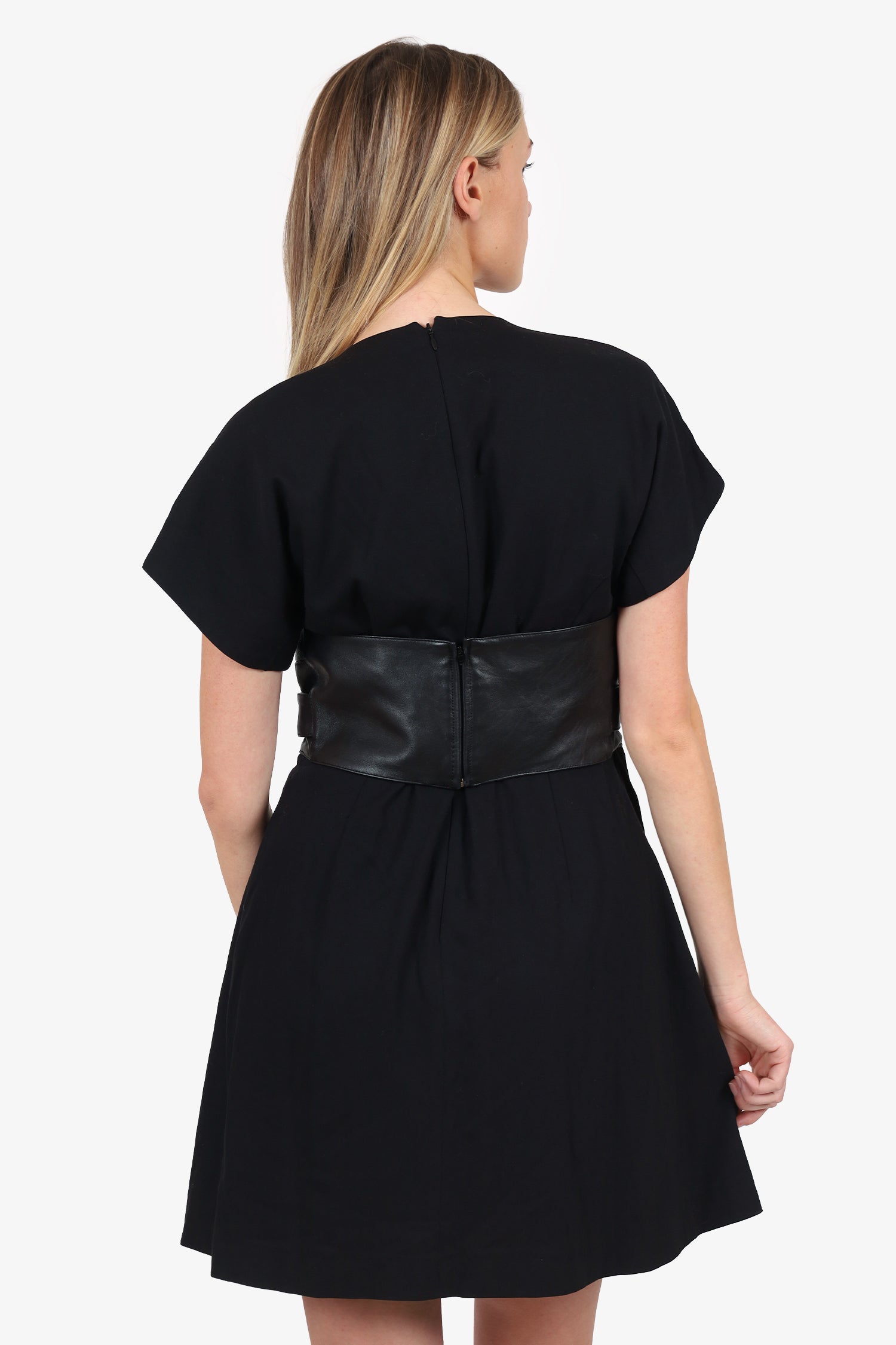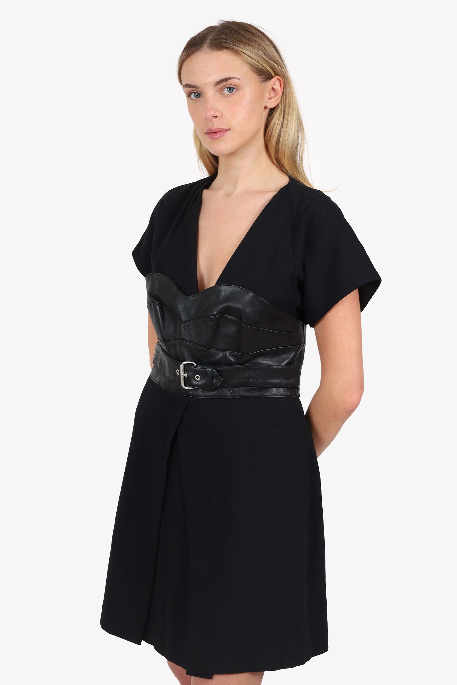 Refresh availabilityMCQ Alexander McQueen Black Leather/Wood Belted Mini Dress. Slip-on. V-neckline. Rear zip with hook closure. Belt with adjustable pull-through buckle and zip closure. Lined interior. Silver-tone hardware. Tonal stitching.