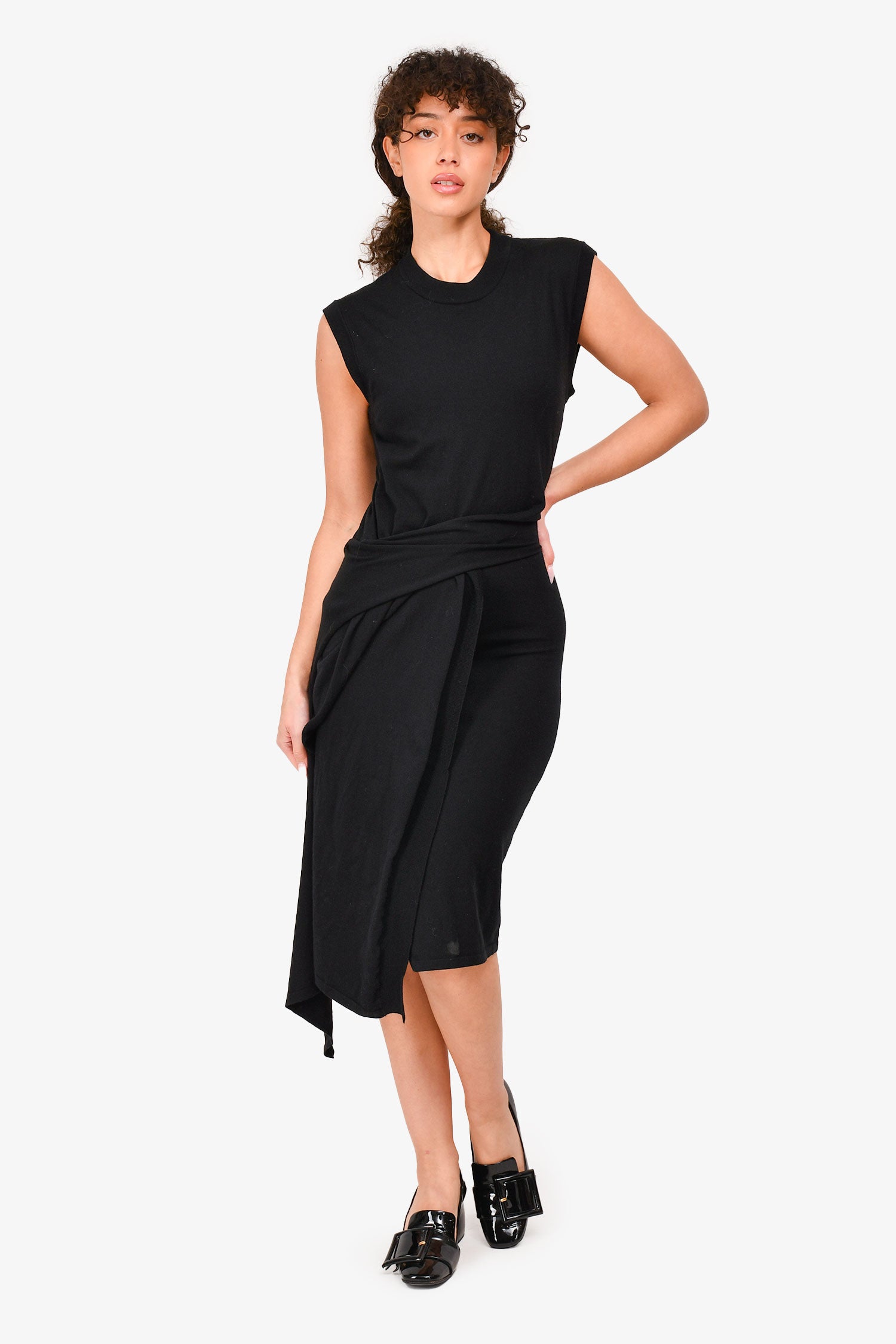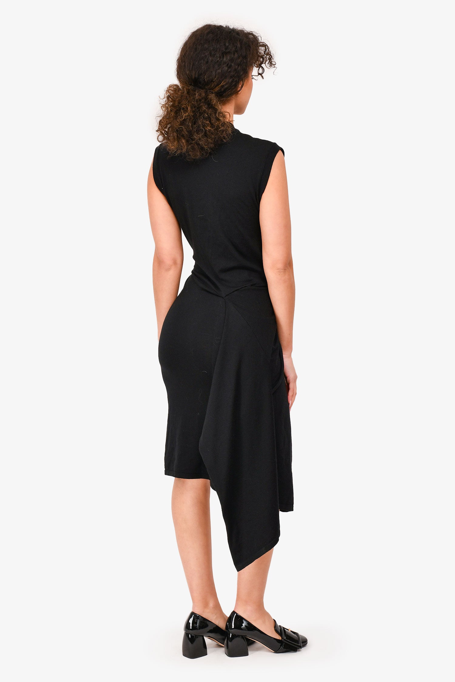 Refresh availabilityMcQ by Alexander McQueen Black Wool Knit Dress. Ribbed collar, sleeves, and hemming. Wrapped wool overlay. Tonal stitching.