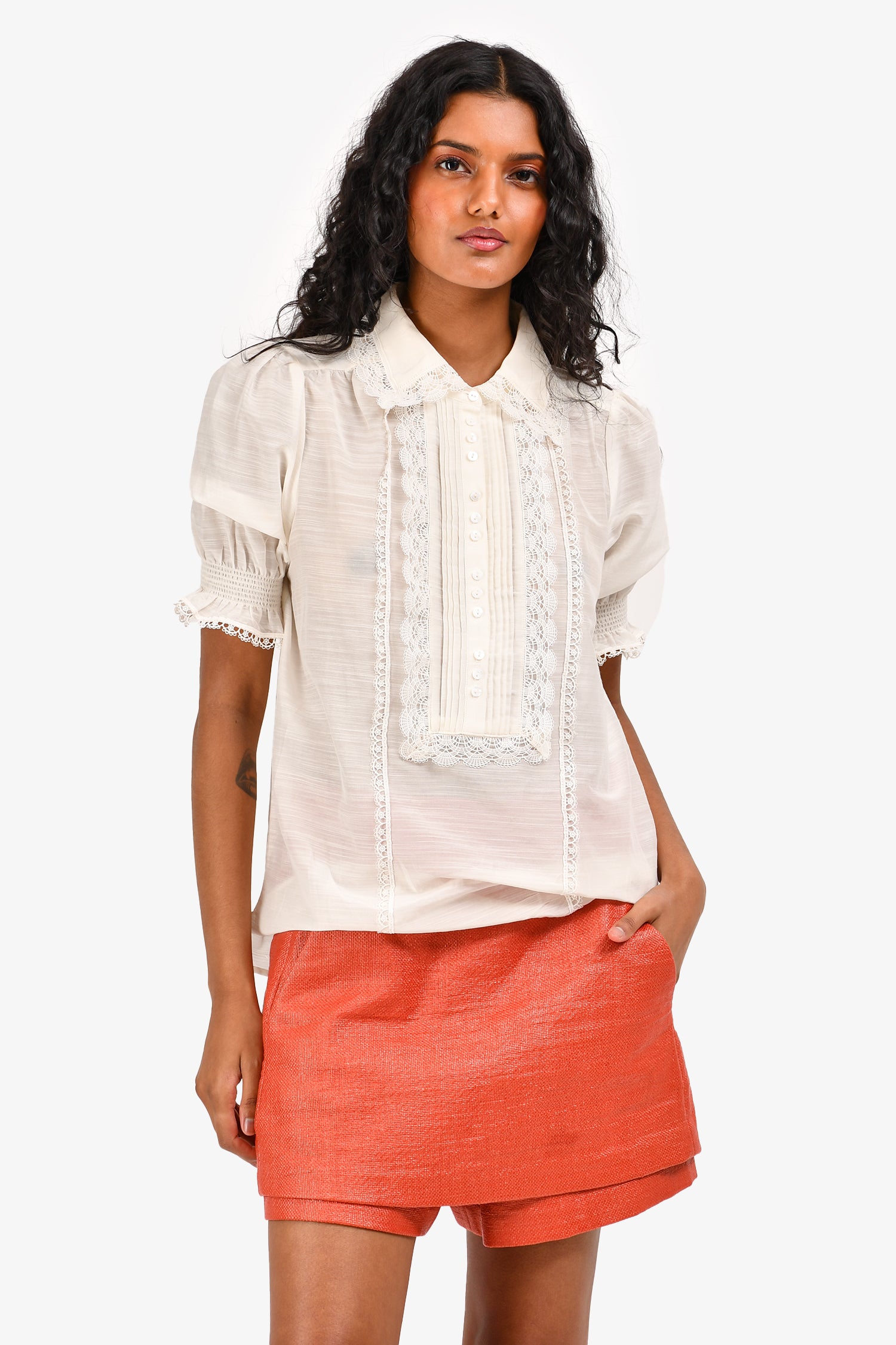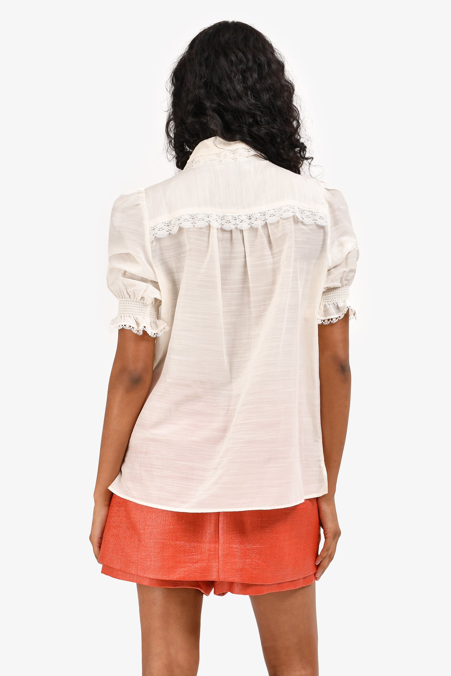 Refresh availabilityMe+Em White Lace Button Up Top. Pointed collar. Front button closure. Long sleeves with elasticized cuffs. Tonal stitching.
