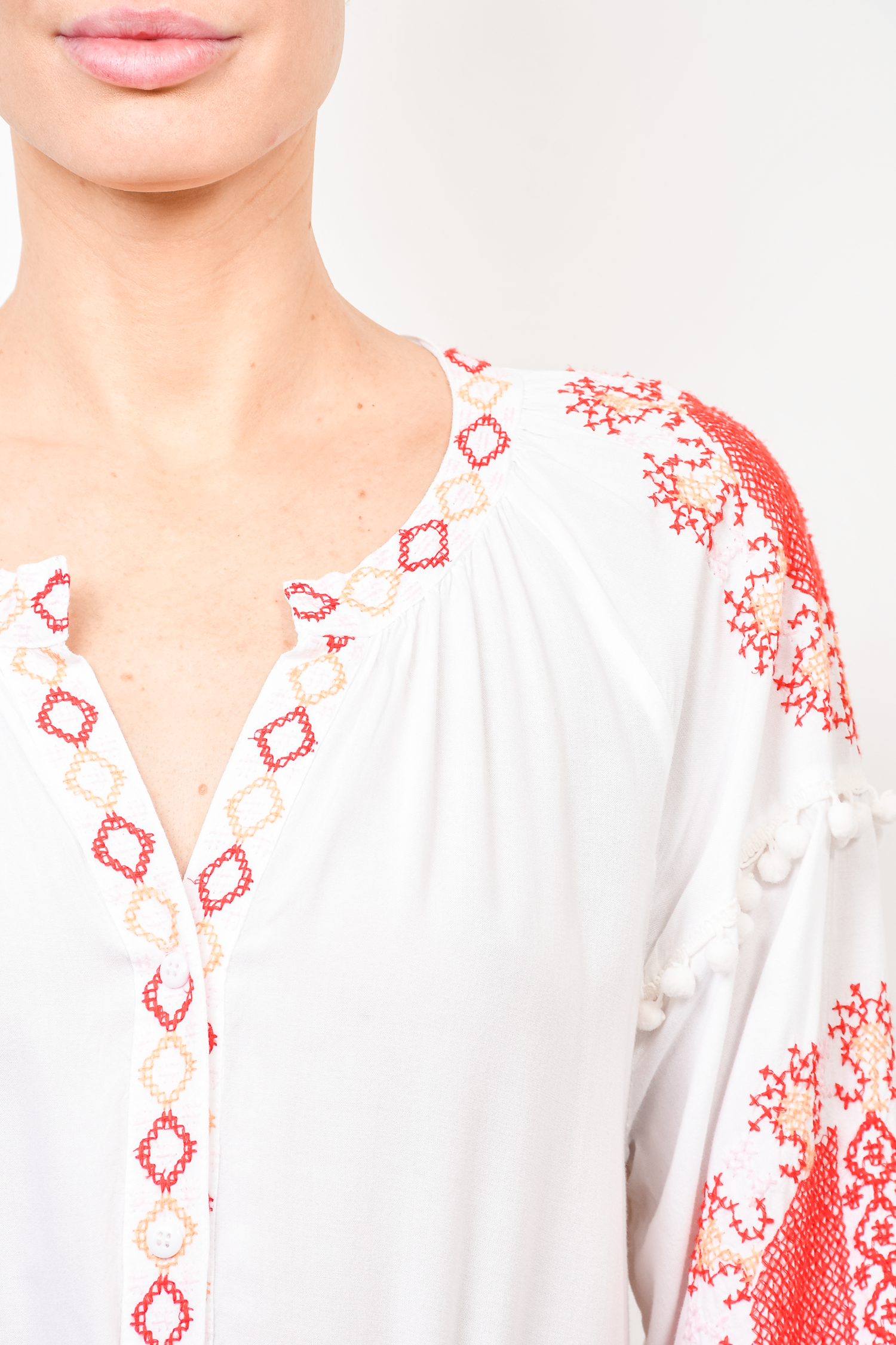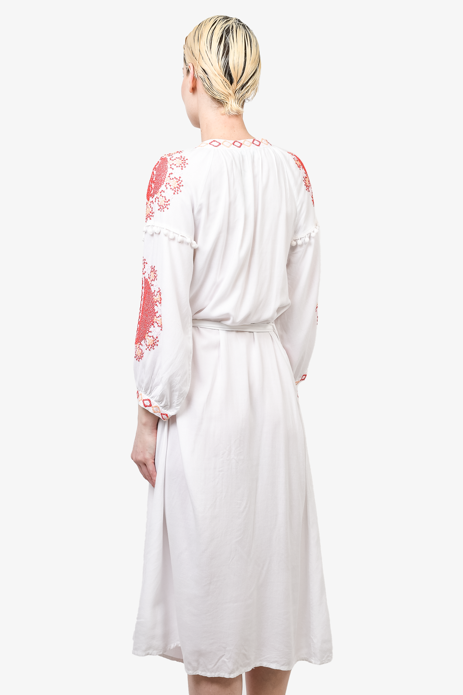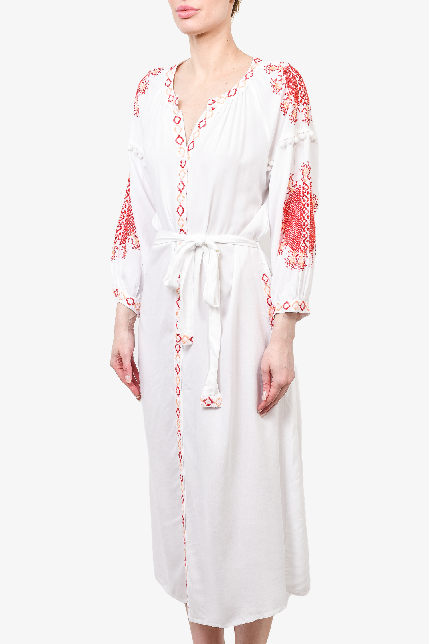 Refresh availabilityMelissa Odabash White + Red Embroidered Midi Dress. V-neck with tonal button closure. Drop shoulder seam. Pom pom tassels on sleeves. Tonal stitching.