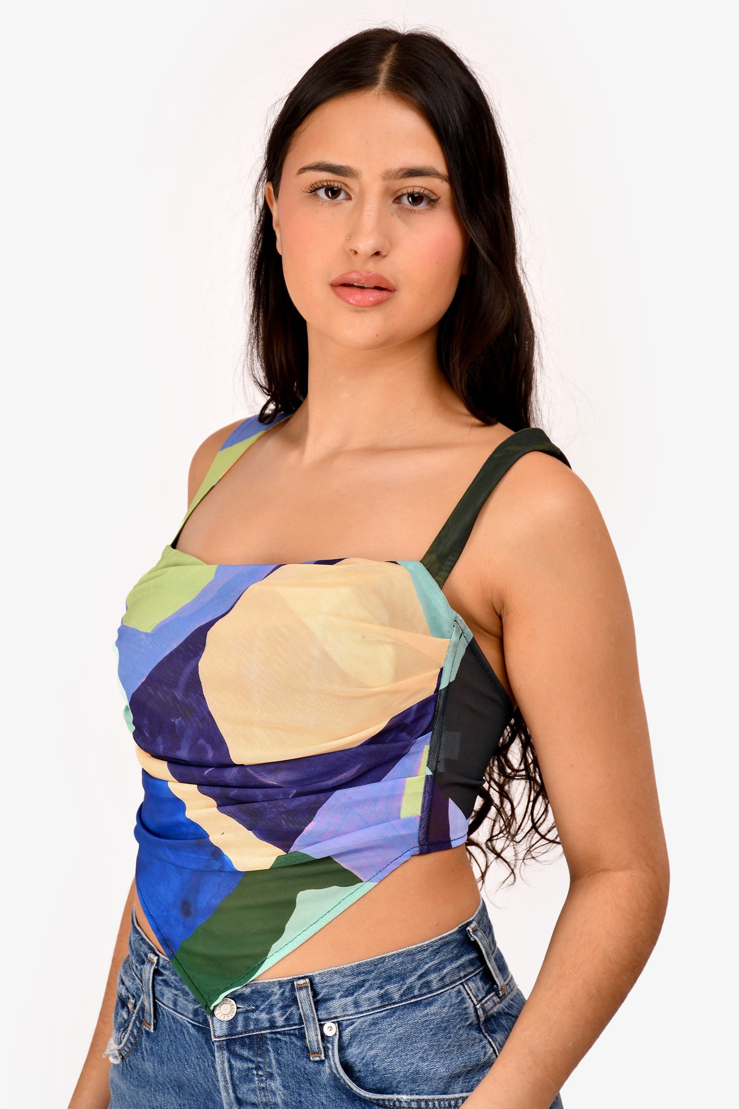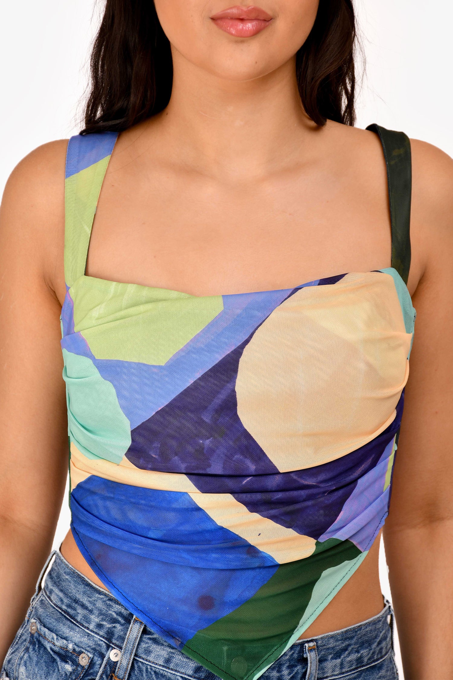 Refresh availabilityMiaou Blue/Purple Printed Mesh 'Tati' Tank Top. Two self-tie straps at the back. Tonal stitching.