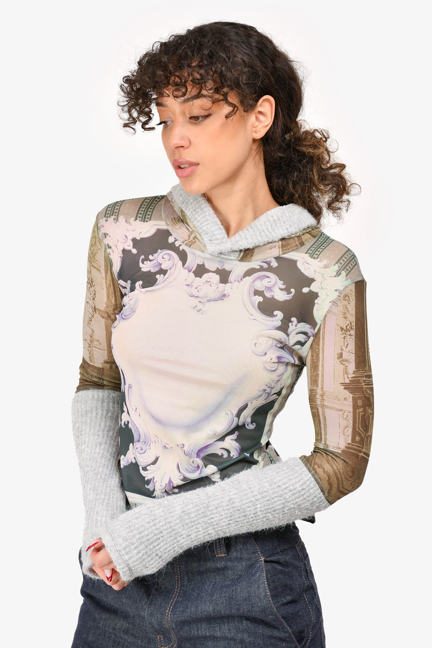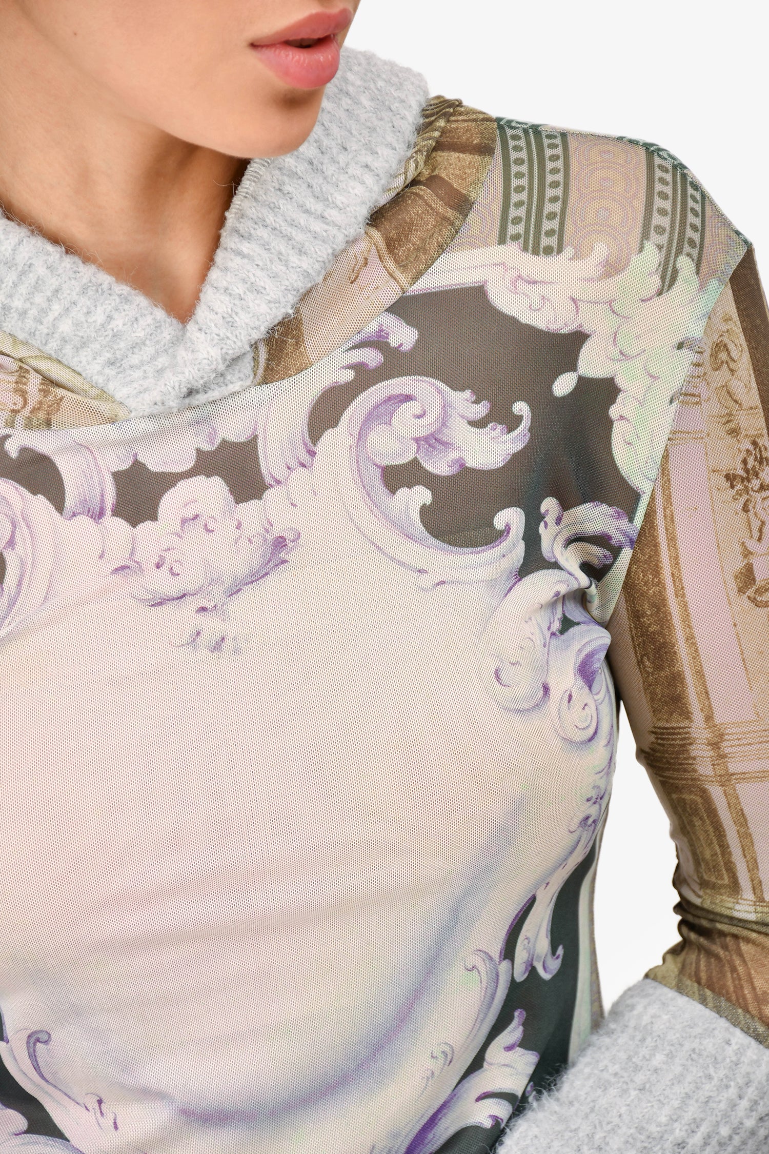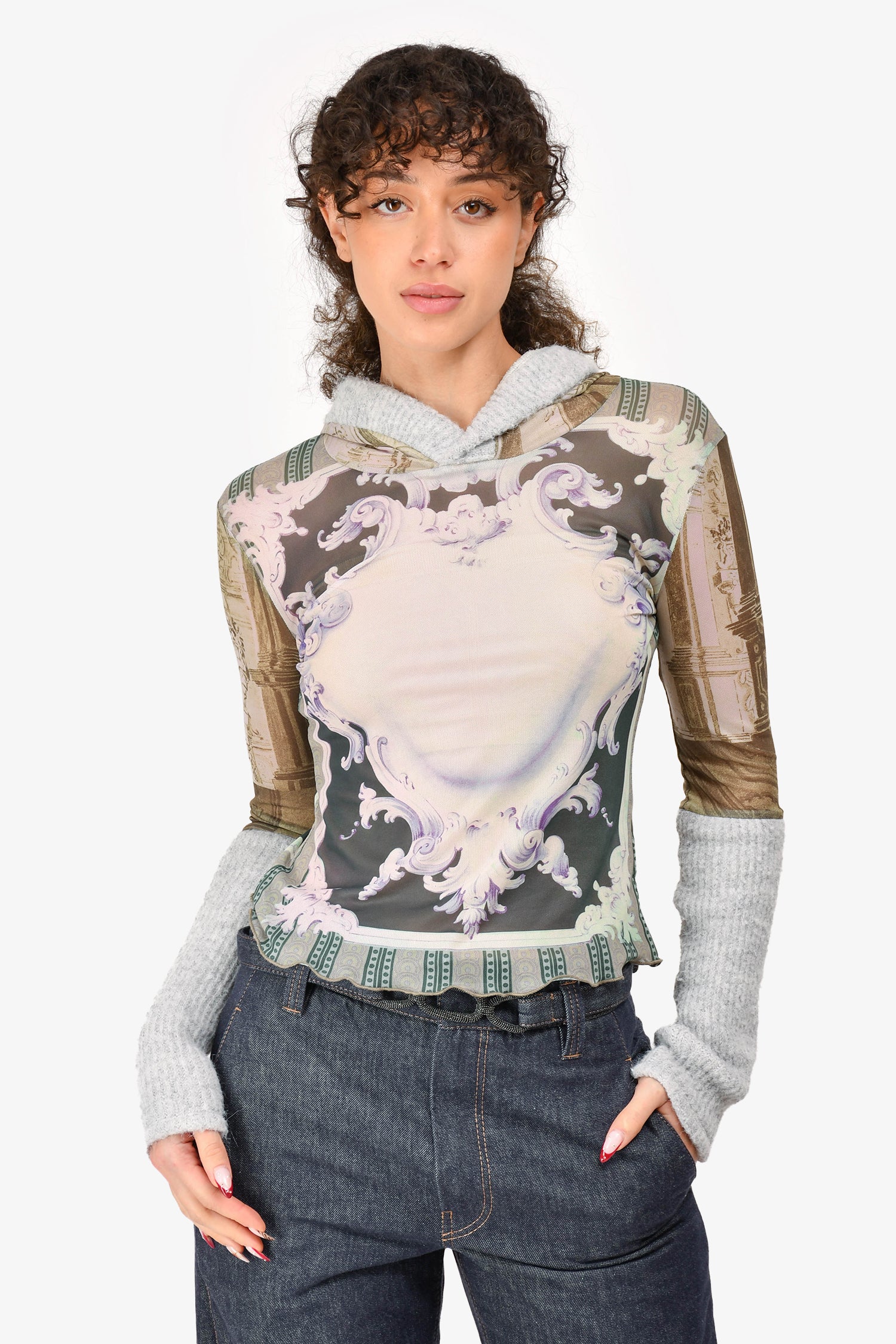Refresh availabilityMiaou Green/Grey Graphic Print Hooded Sheer Long-Sleeve Top. Semi-transparent mesh construction. Fitted silhouette. Attached hood. Tonal stitching.