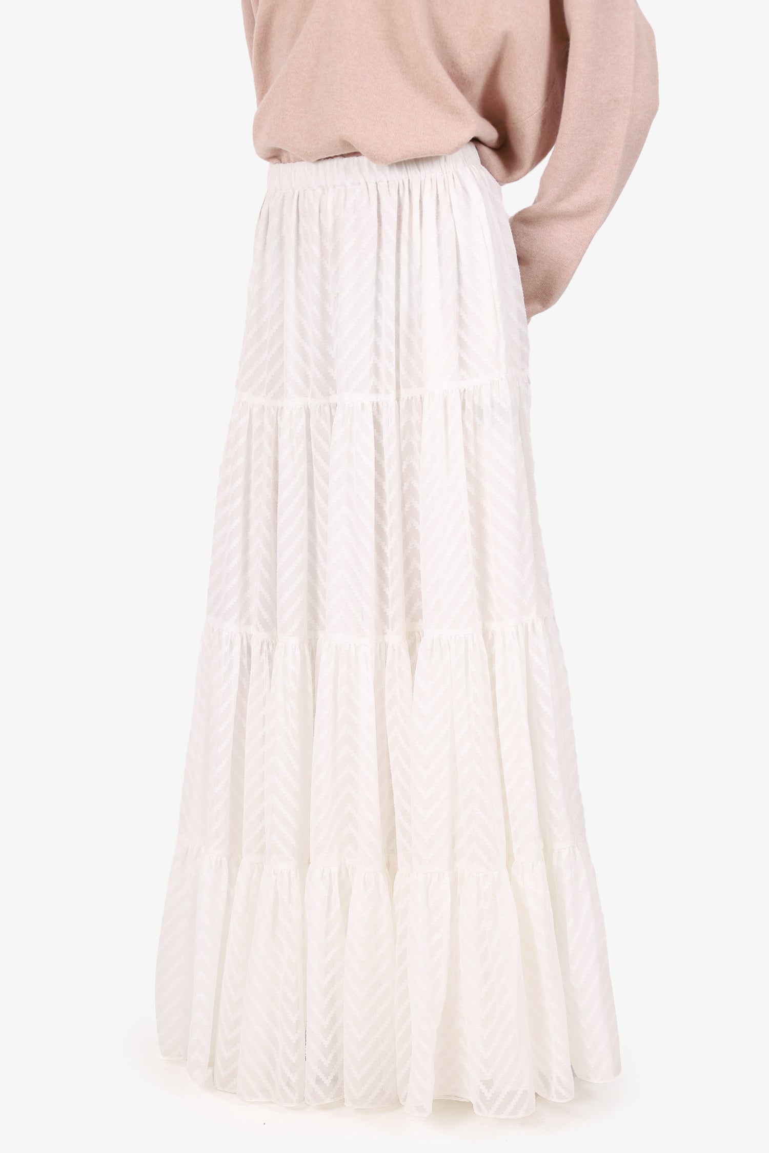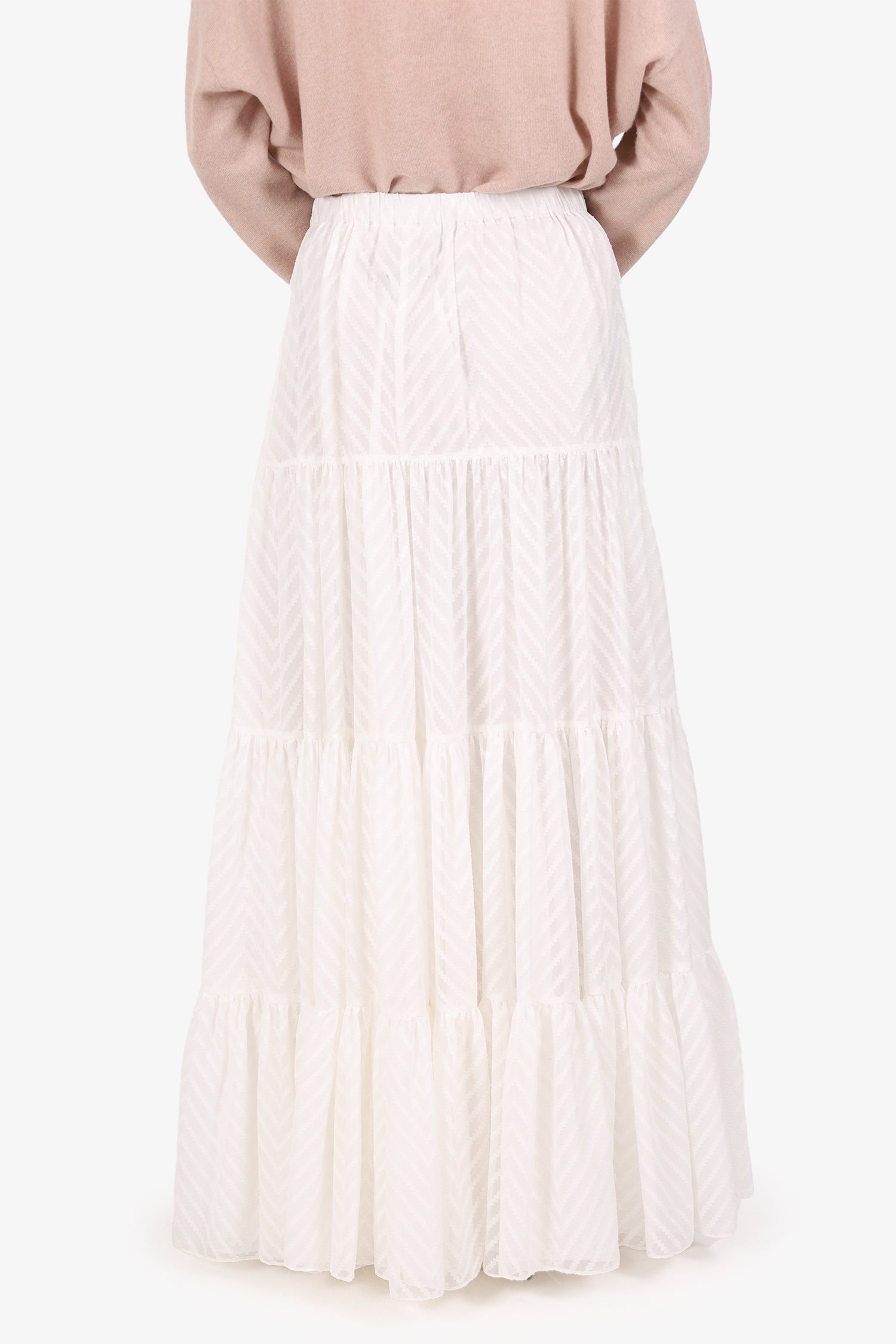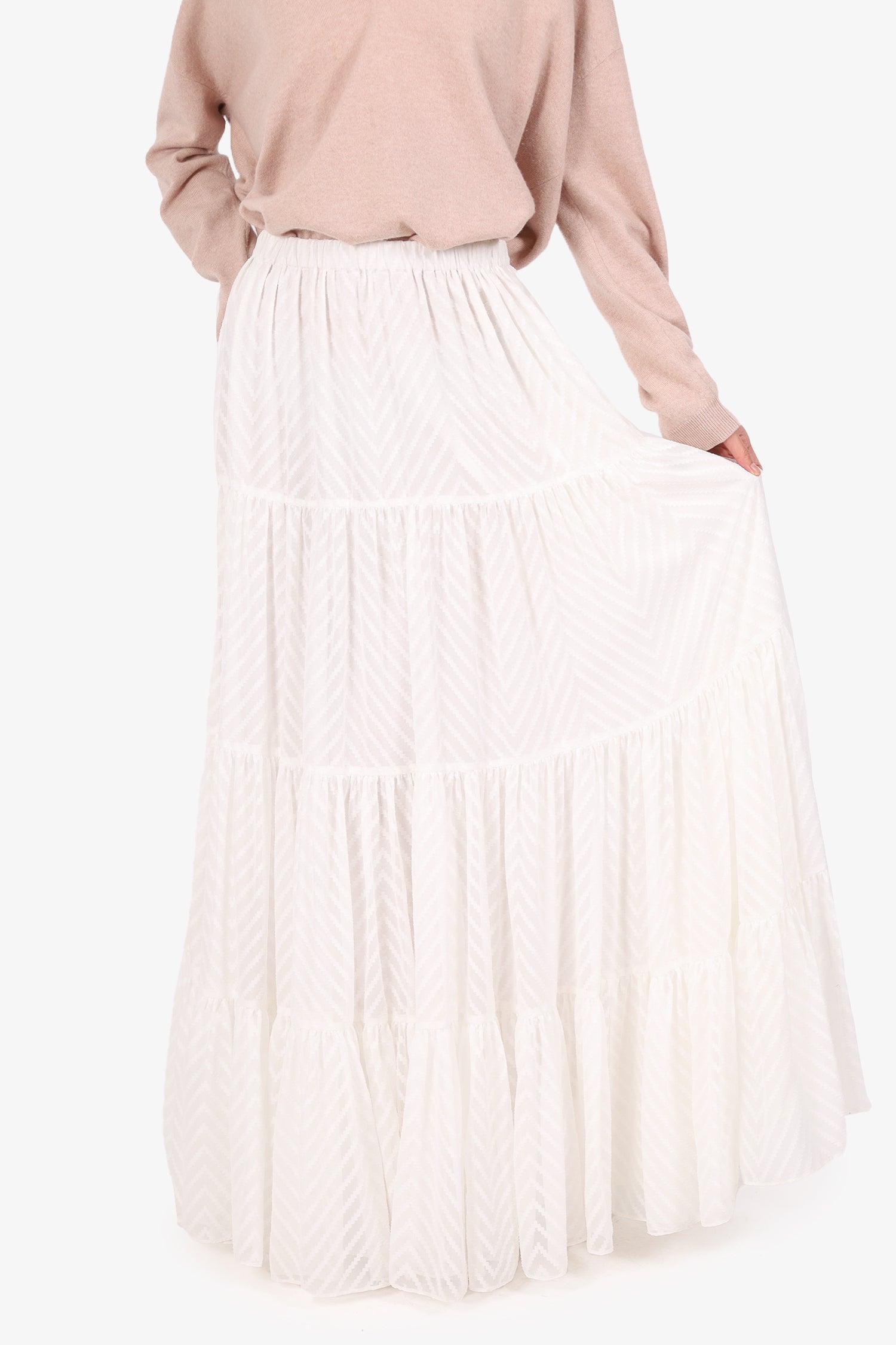 Refresh availabilityMichael Costello x Revolve White Tiered Maxi Skirt. Slip-on. Elasticized waistband. Lined interior. Tonal stitching.