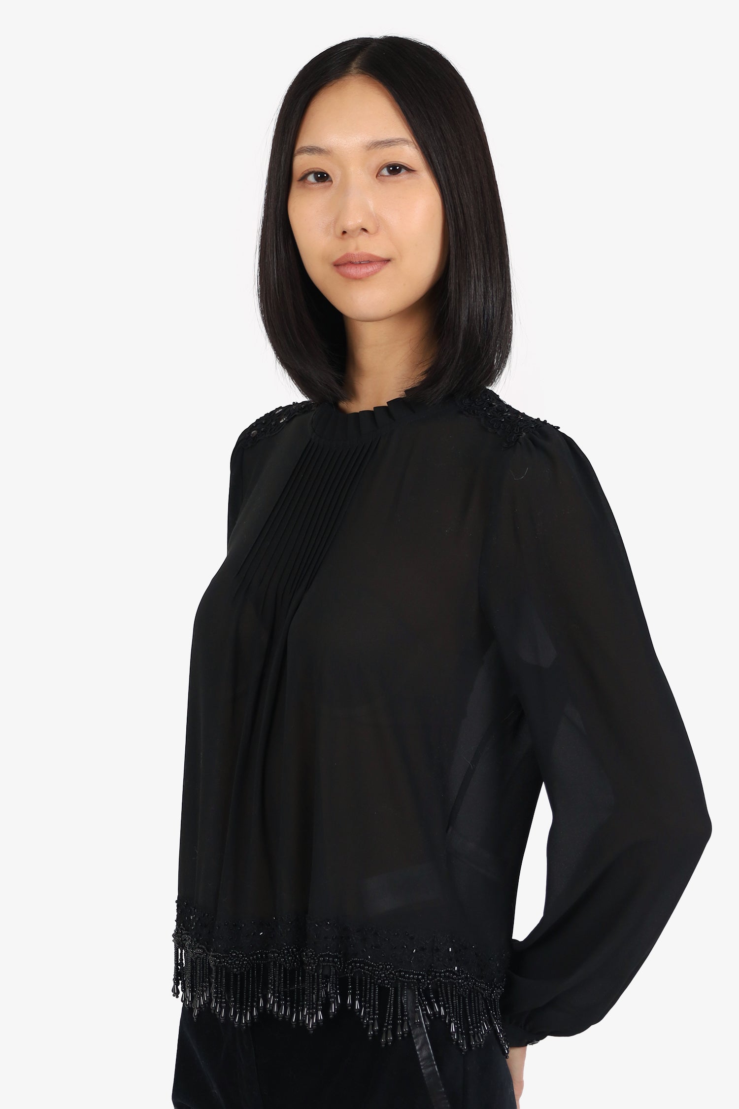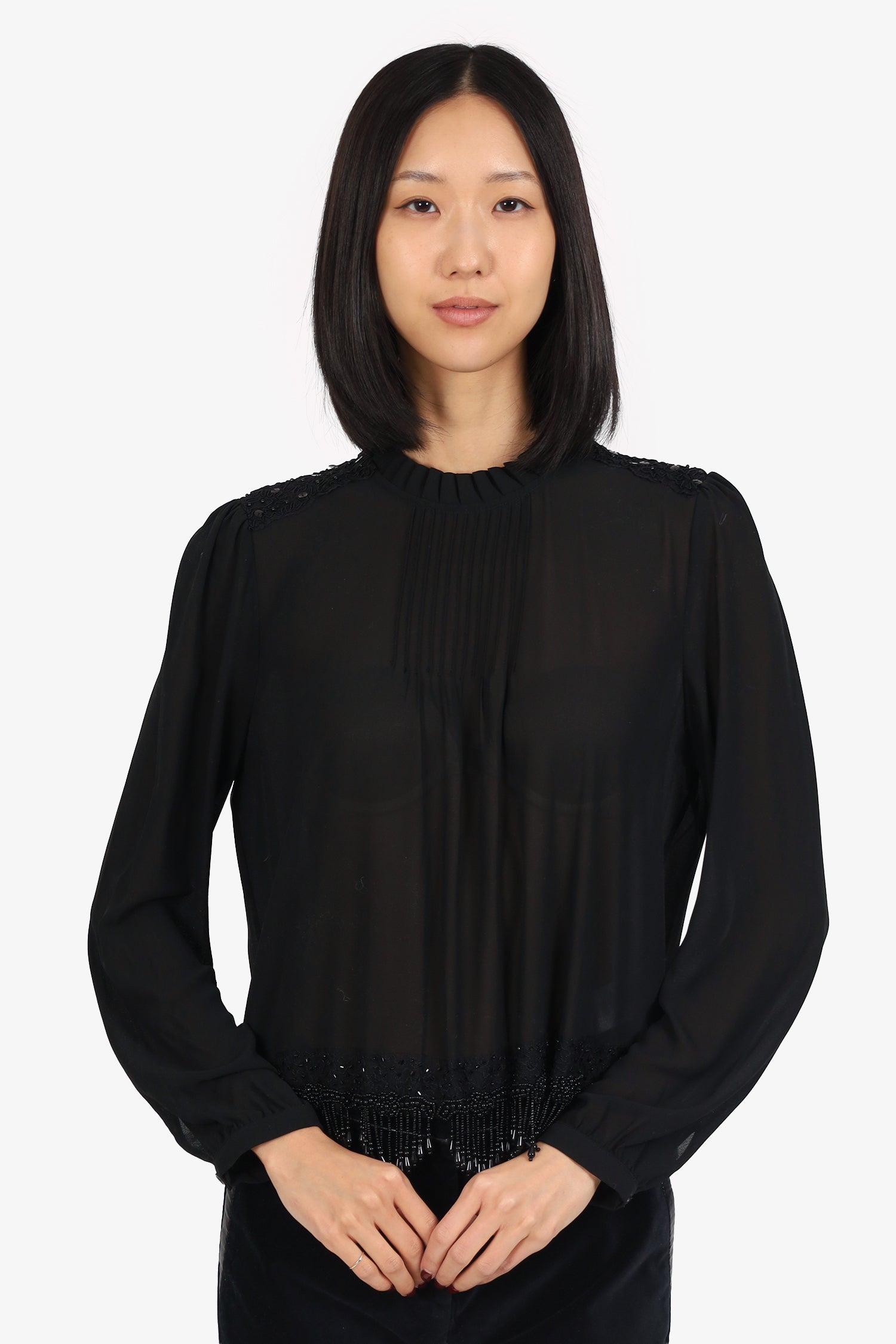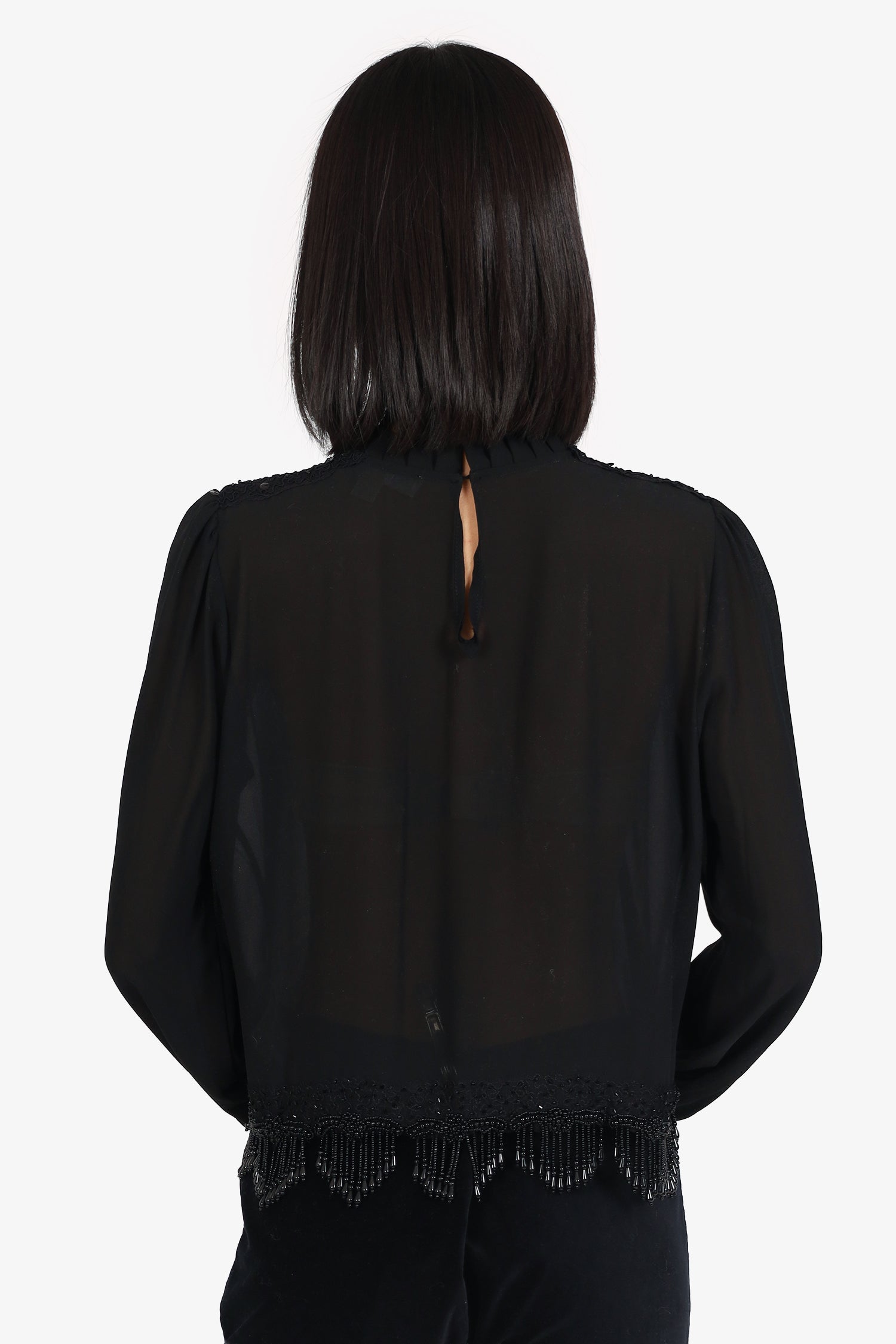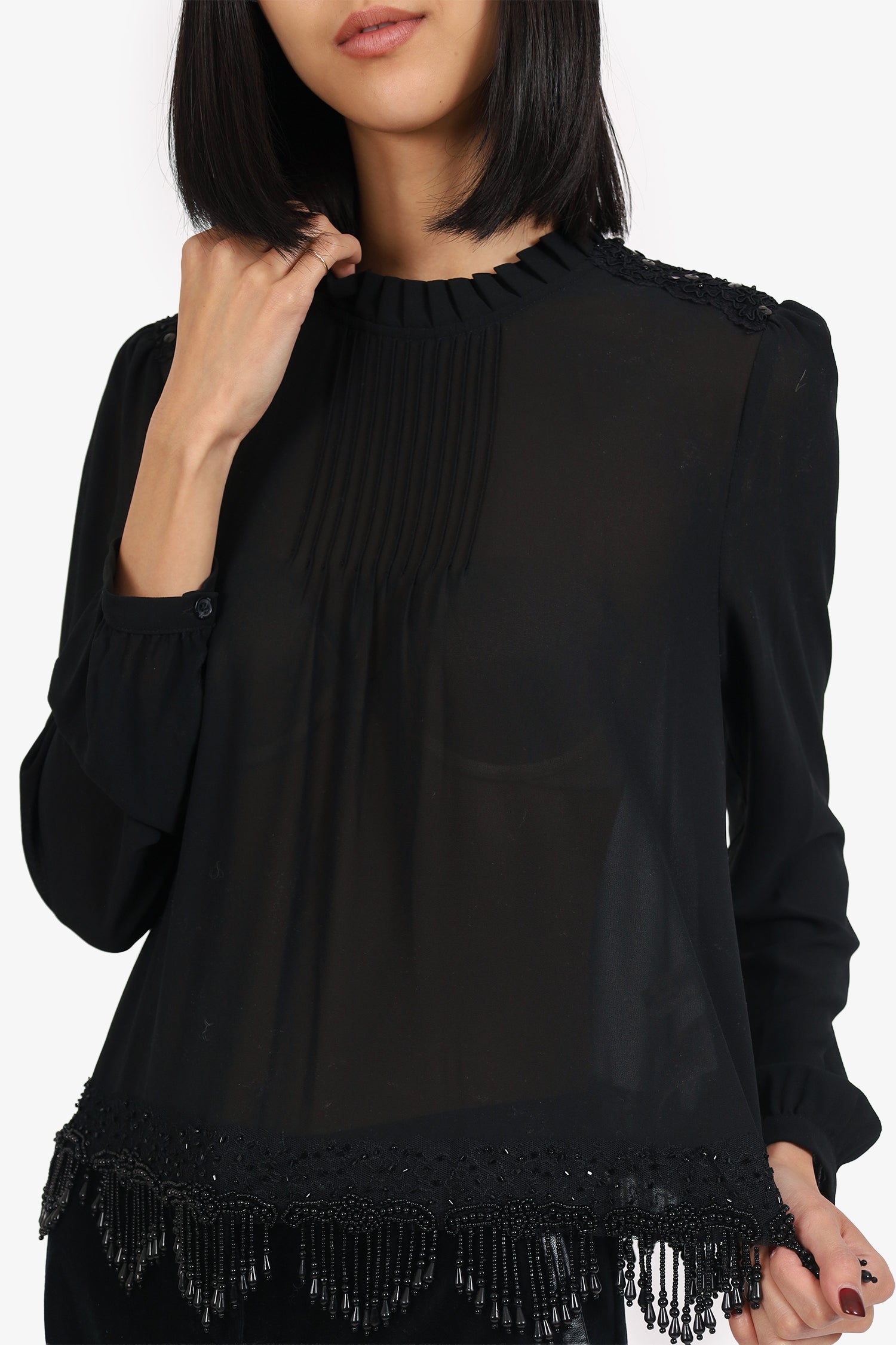 Refresh availabilityMichael Kors Black Sheer Beaded Hem Long Sleeve Top. Pull-on. Round neckline. Rear keyhole with button-up closure. Sleeve cuffs with button-up closure. Semi sheer body. Tonal stitching.