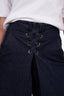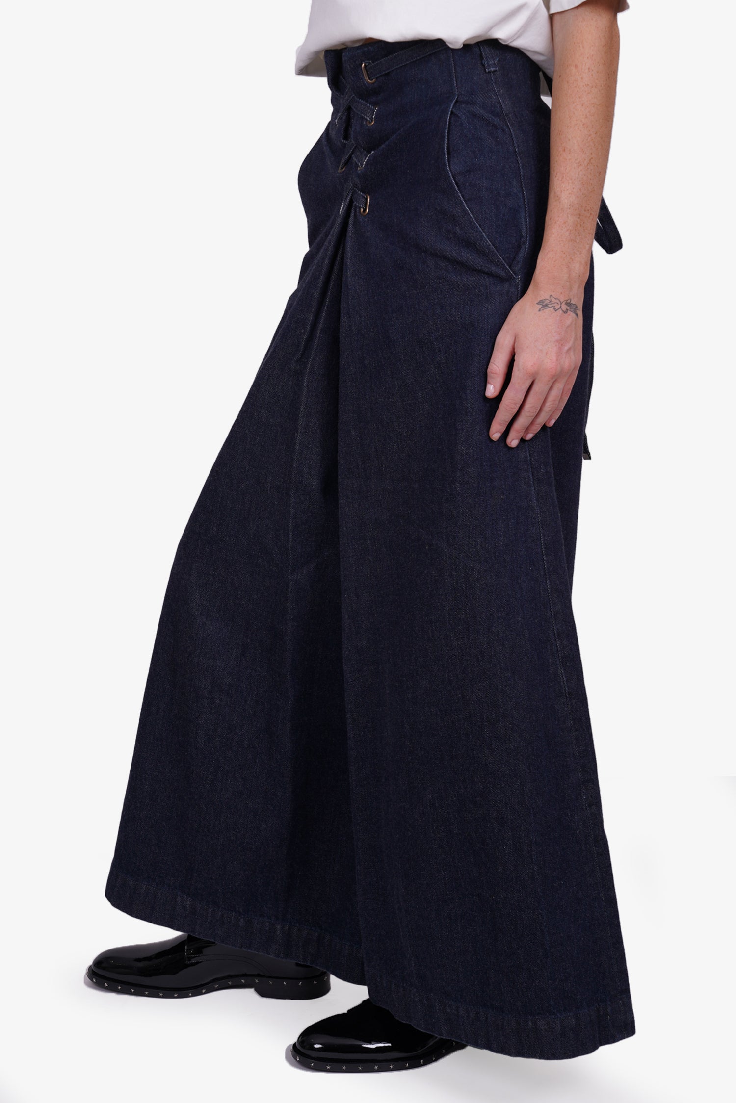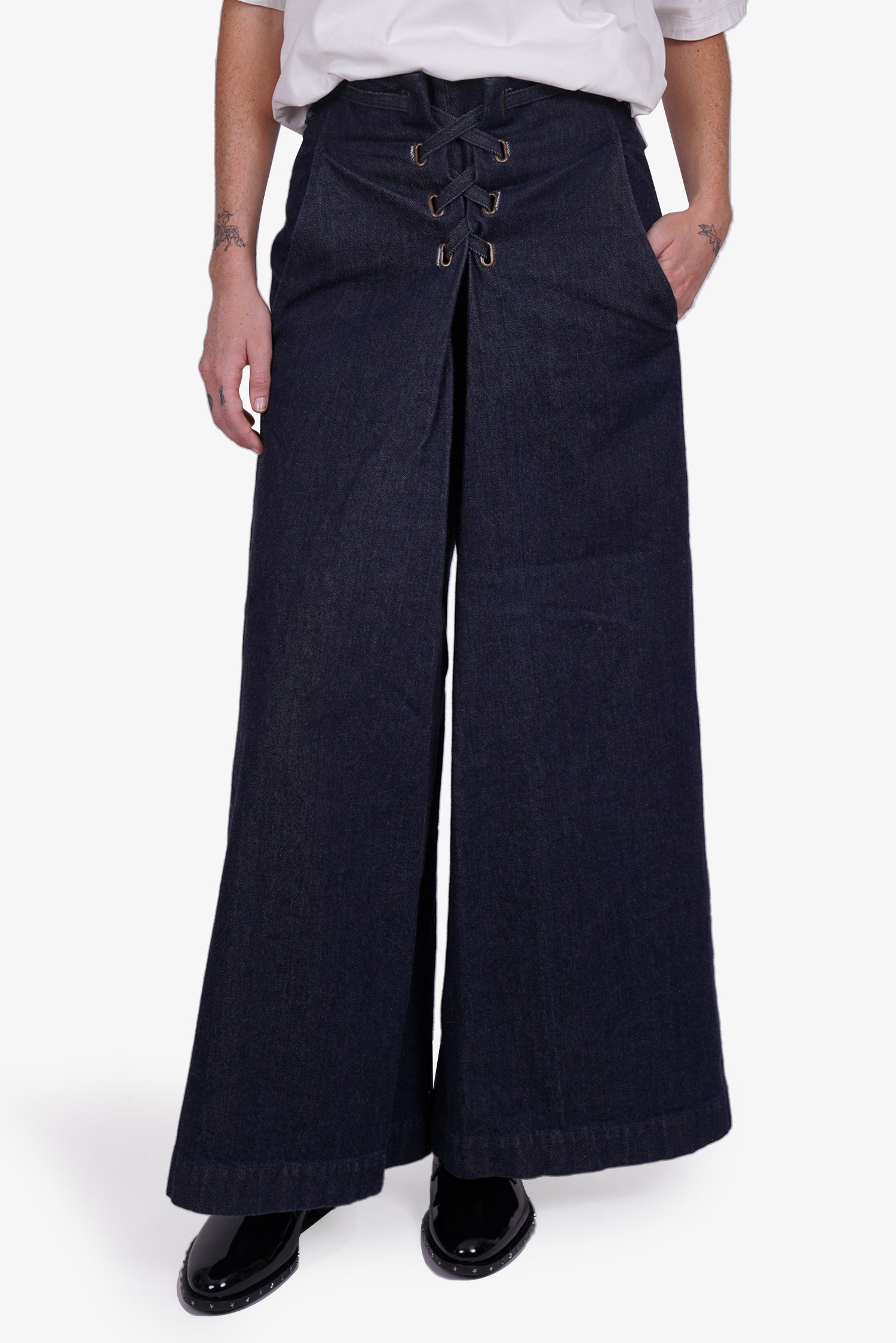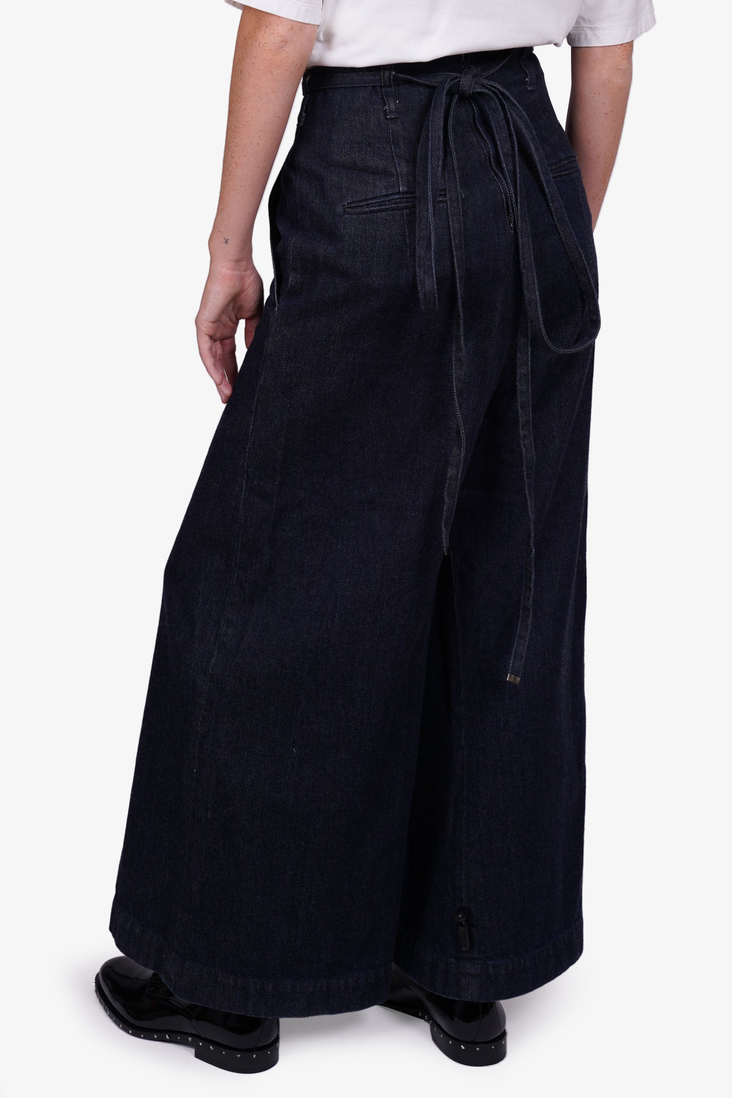 Mihara Yasuhiro Dark Blue Denim Wide Leg Jeans with Tie Up Waist. Back zip closure. Front lace-up closure with wrap-around tie. Tonal stitching.