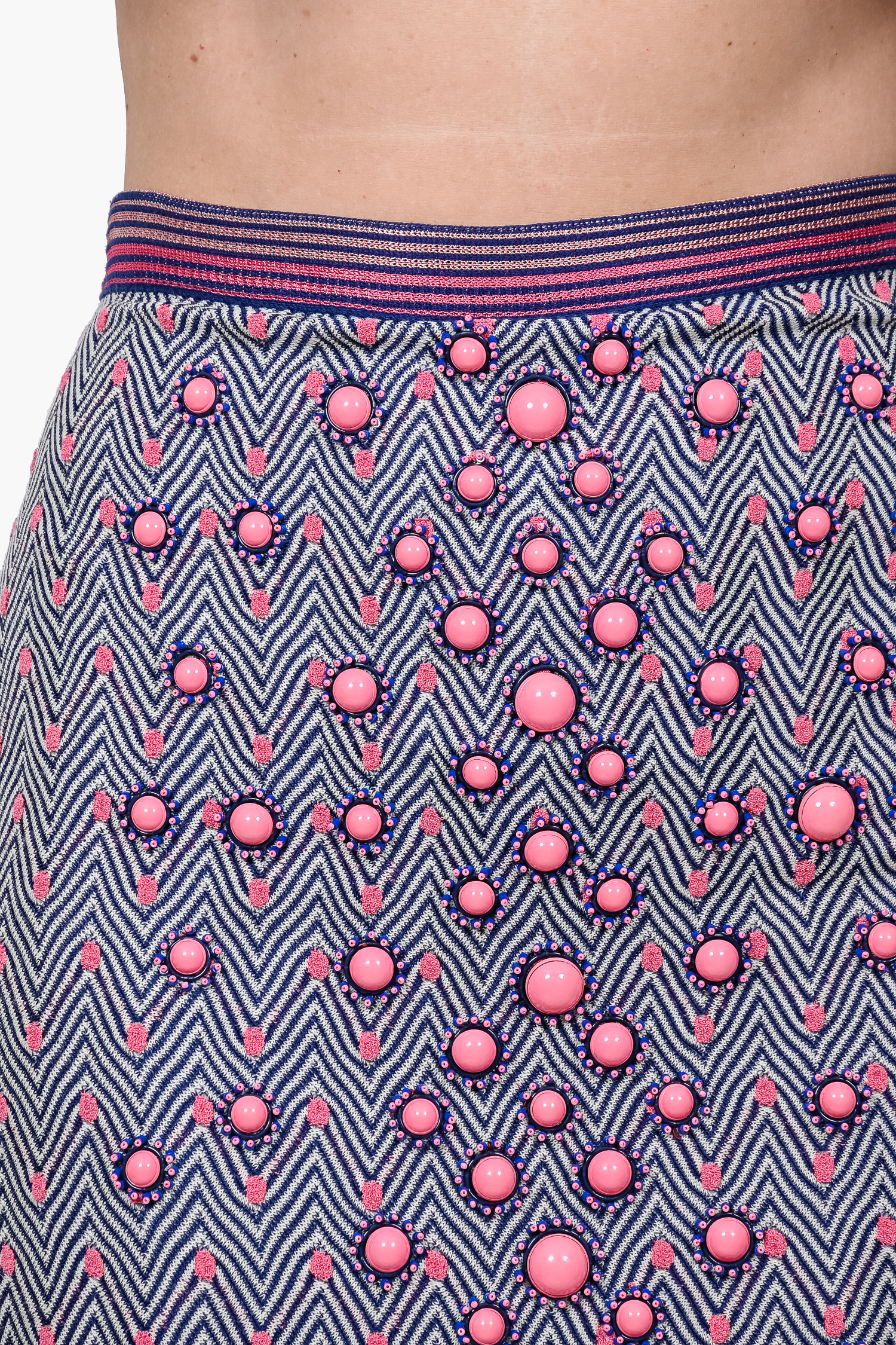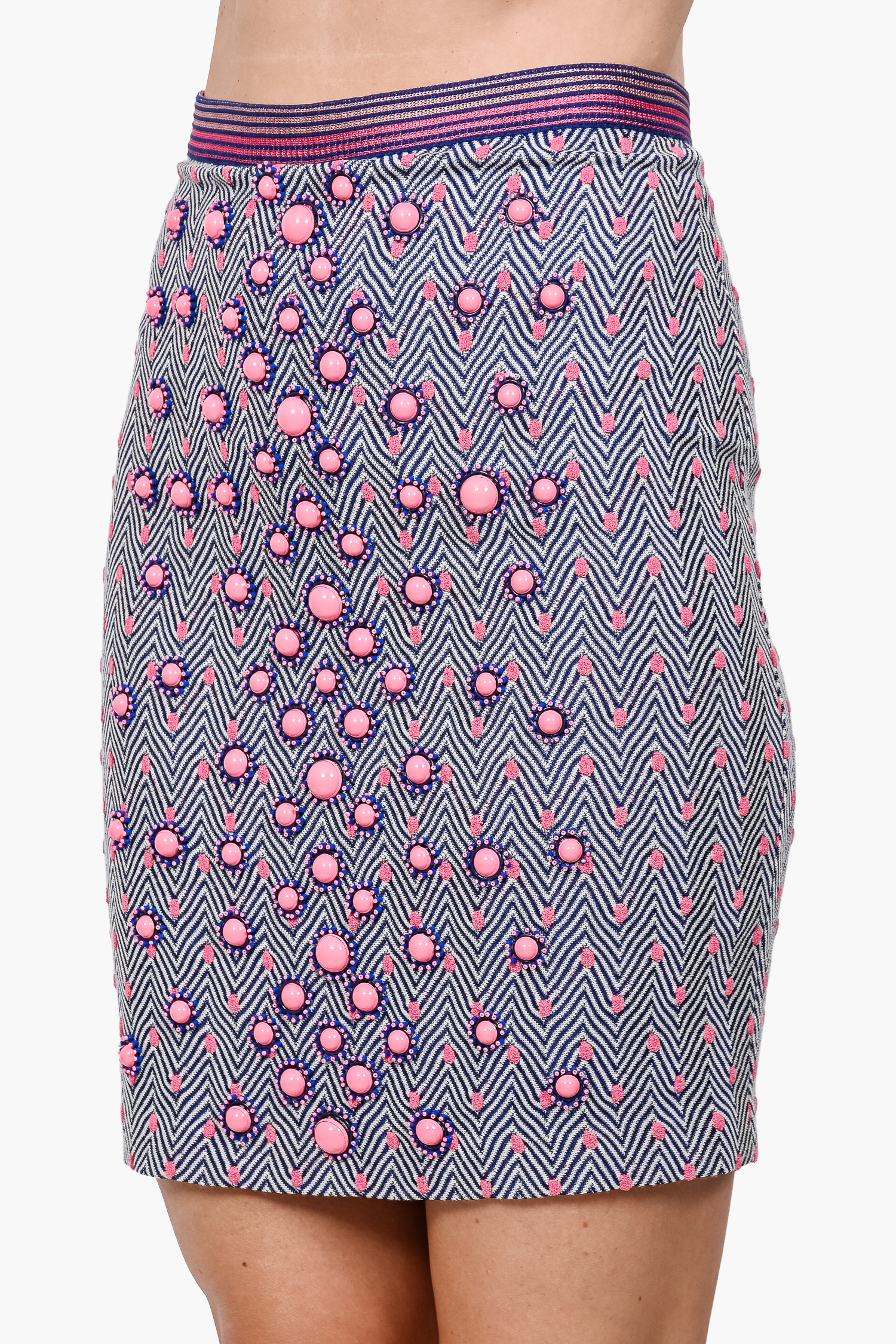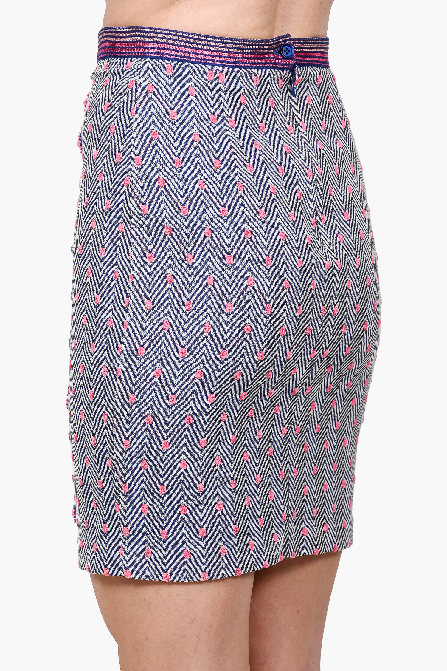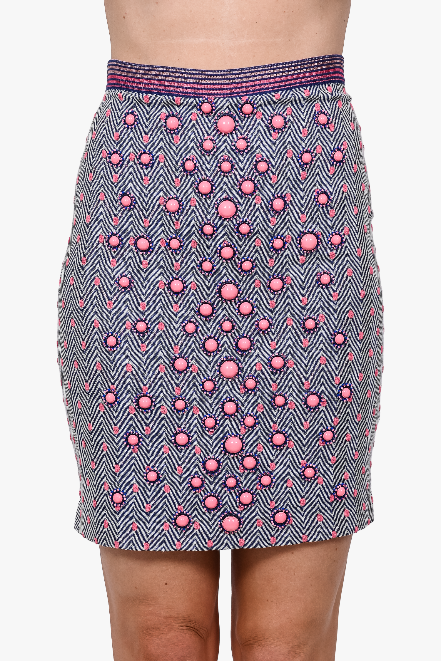 Refresh availabilityMissoni Navy Blue/Pink Chevron/Polka Dot Beaded Front Knit Skirt. Elasticized waist. Lined. Tonal stitching.