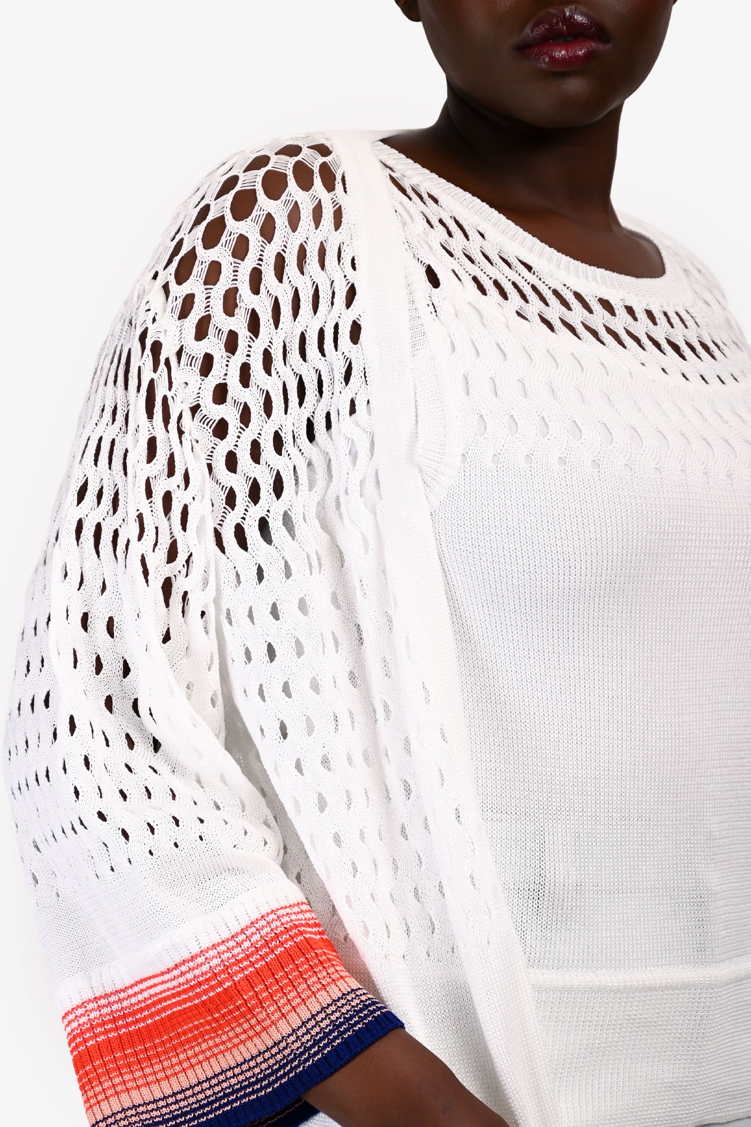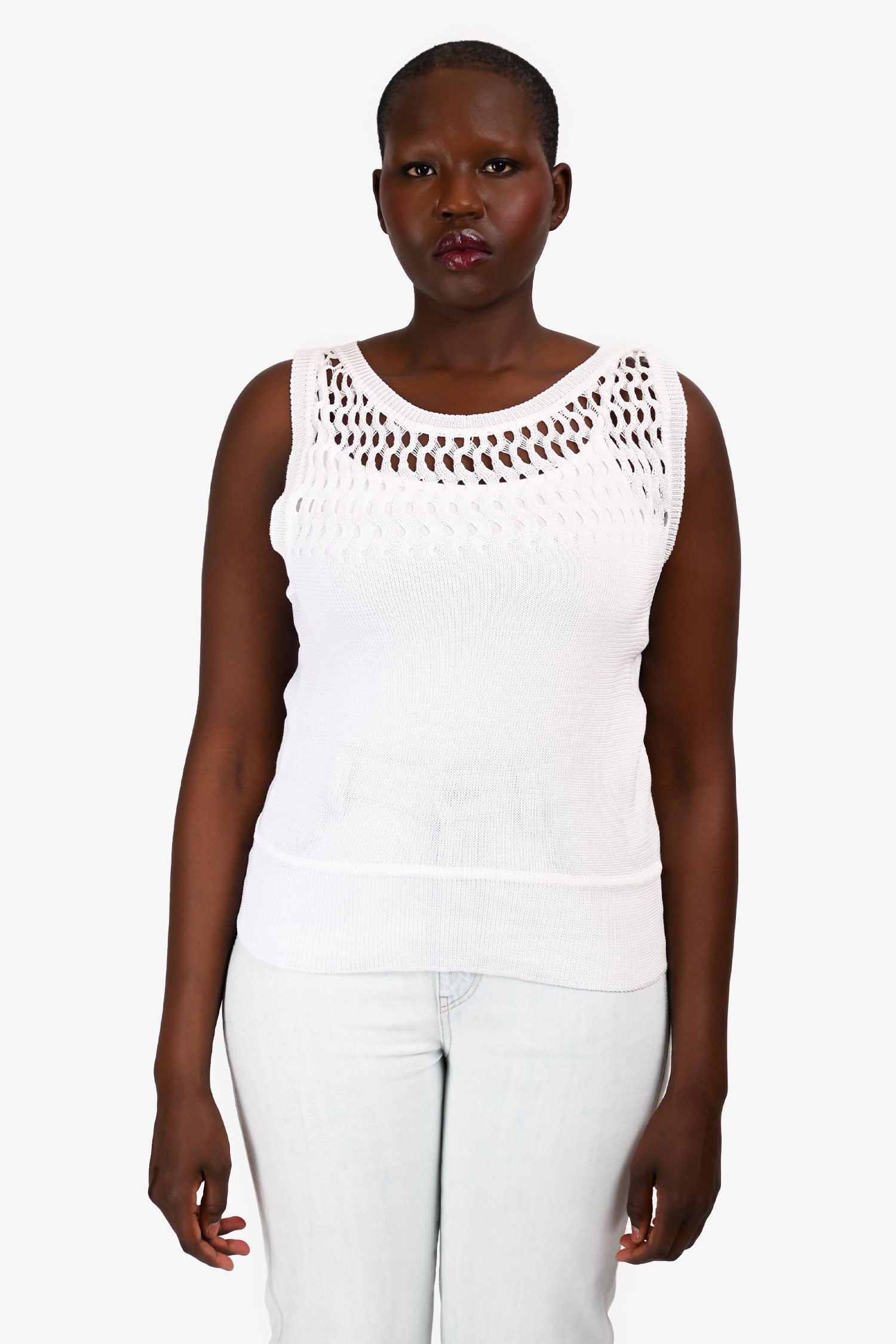Refresh availabilityMissoni White/Red/Blue Sleeveless Knit Top + Long Cardigan. Top: Pull-on. Round neckline. Cardigan: Open front. 2 slip pockets. Both have tonal stitching.