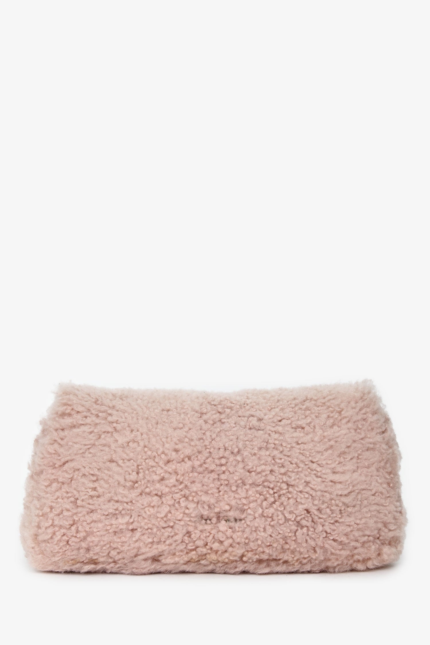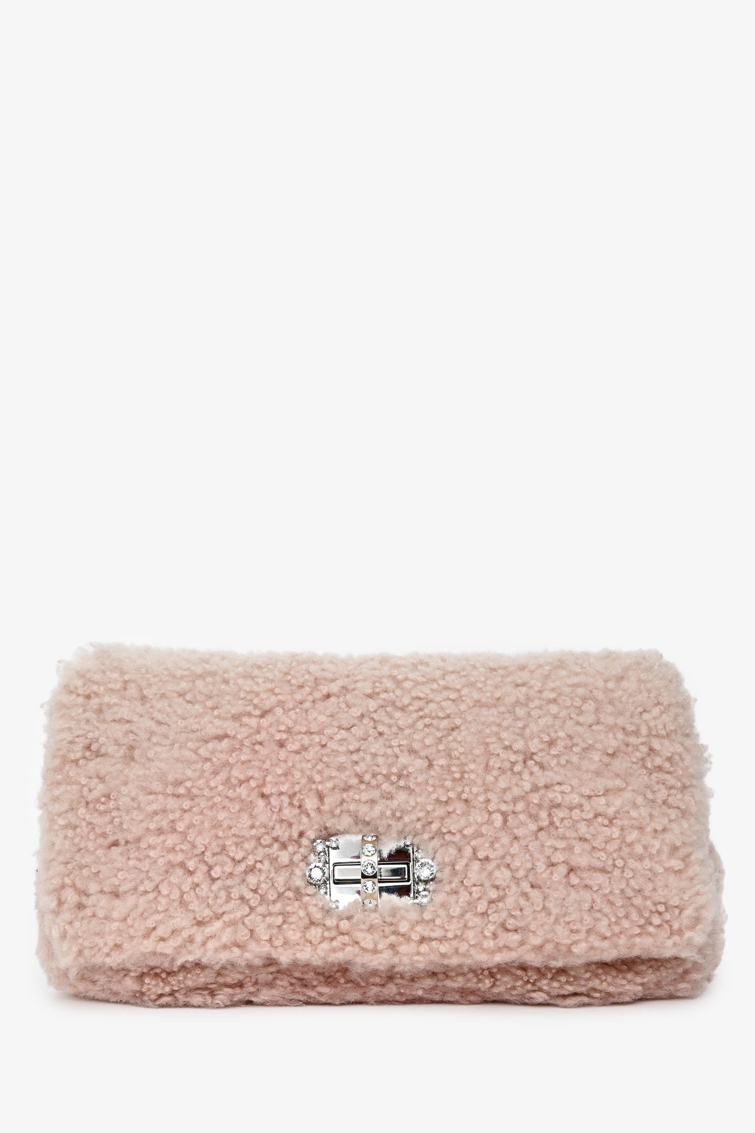 Refresh availabilityMiu Miu 2018 Pink Shearling 'Montone' Crystal Shoulder Bag. Front fold-over flap with a turn-lock closure. Crystal shoulder strap. Attachable top handle. Lined interior with 1 zip compartment. Silver-tone hardware. Tonal stitching.